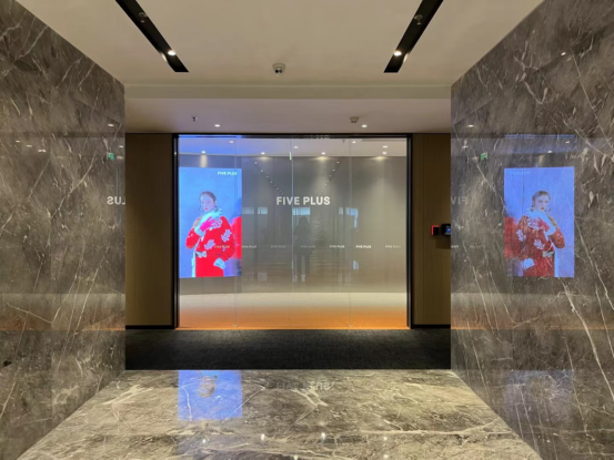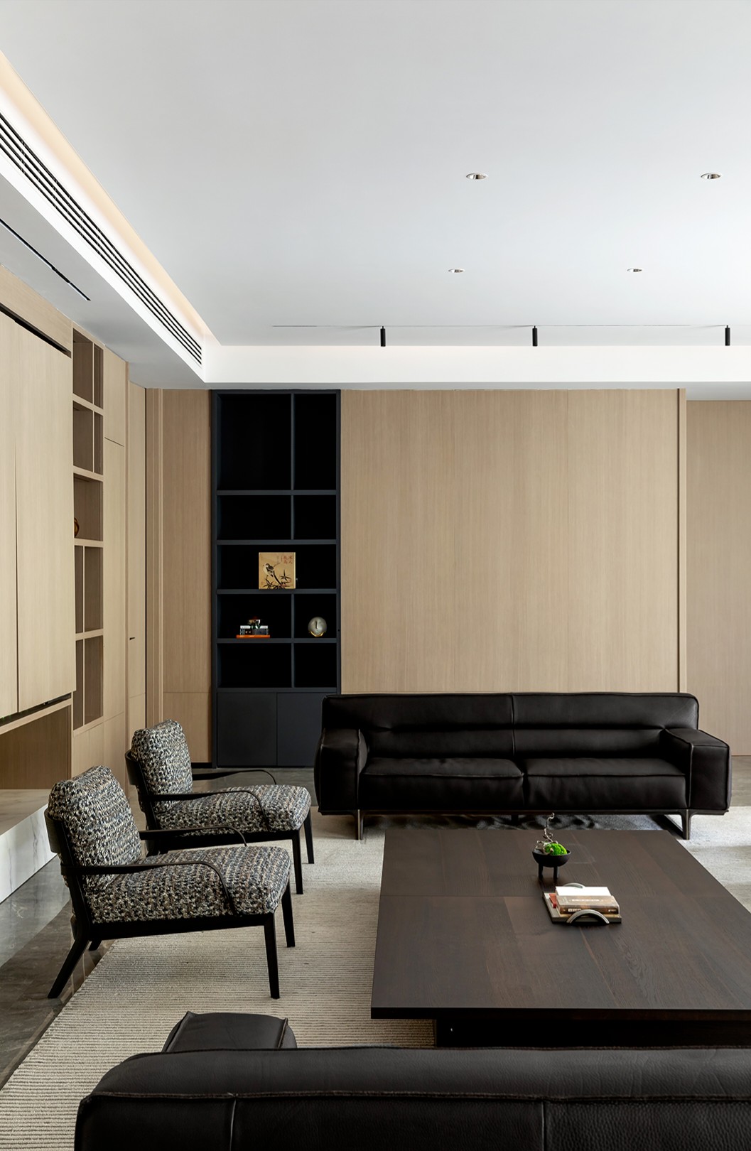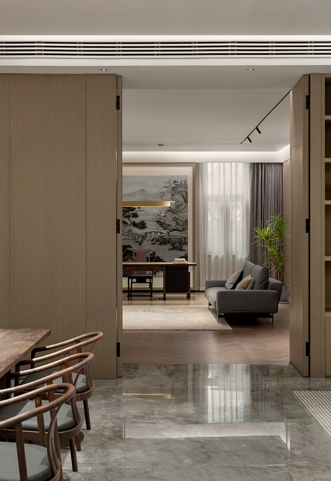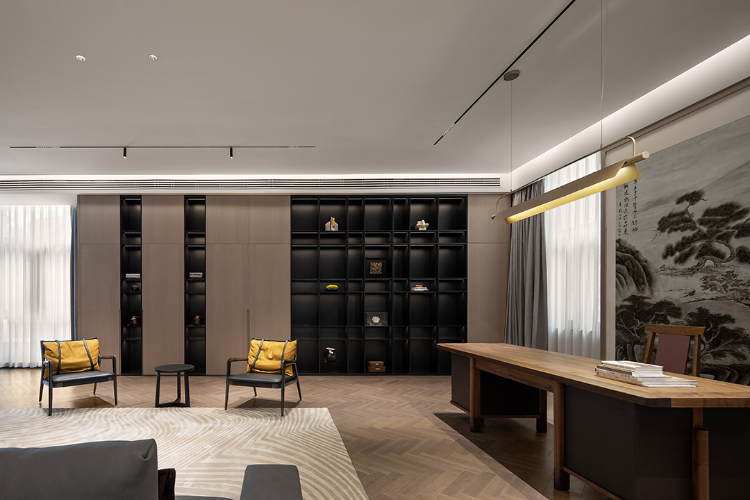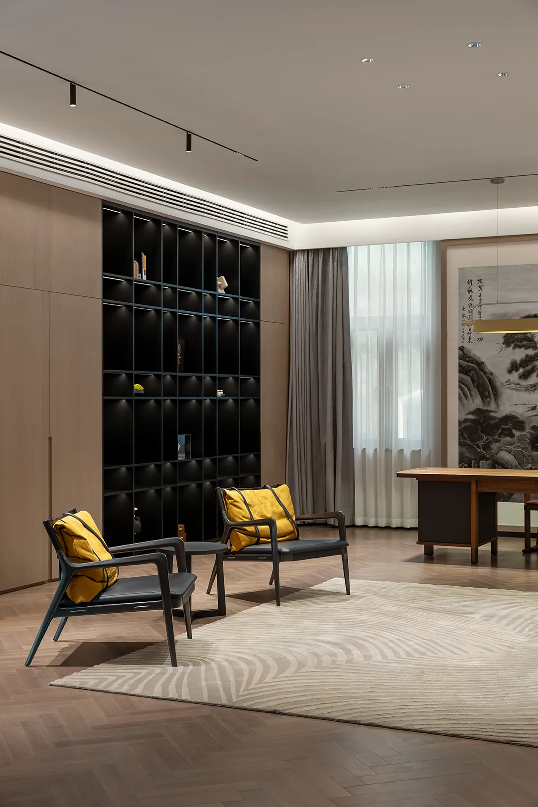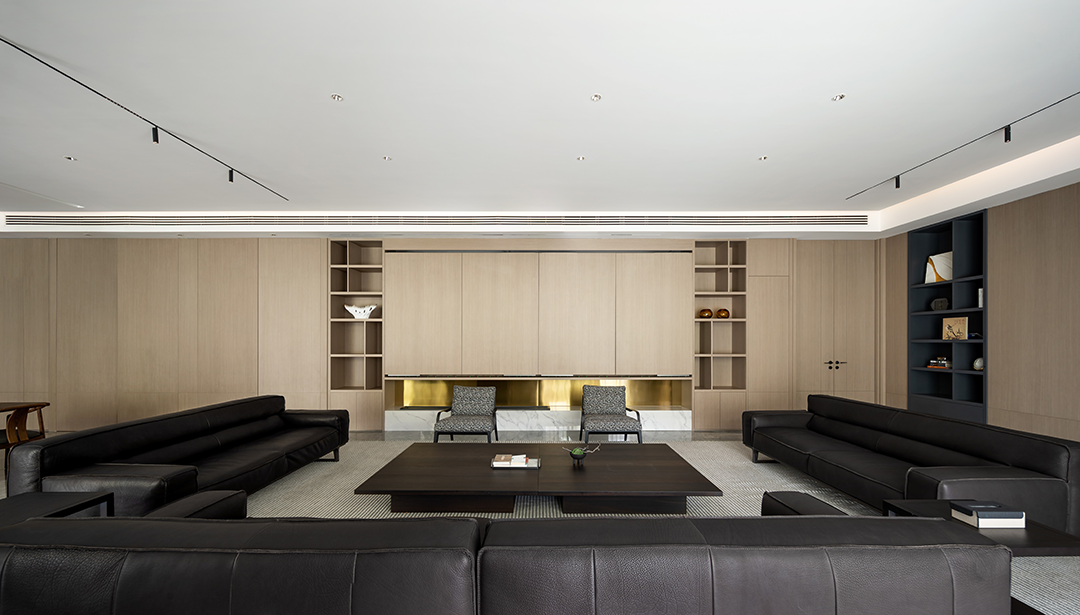 原木饰面的墙壁与精细的大理石地板相互映衬,就像⼀幅巨大的对比画卷 。玻璃隔断如同空间的镜子,反射出了线条和块面的交织,构成了⼀个隔而不断的视觉场景,将视线和光线都引向了更深的空间。