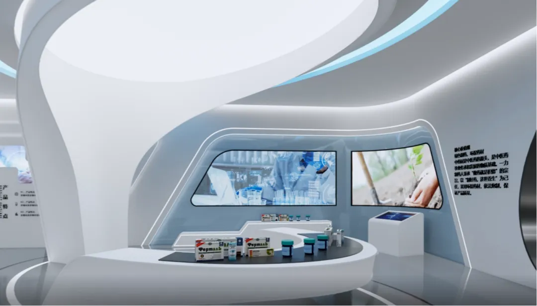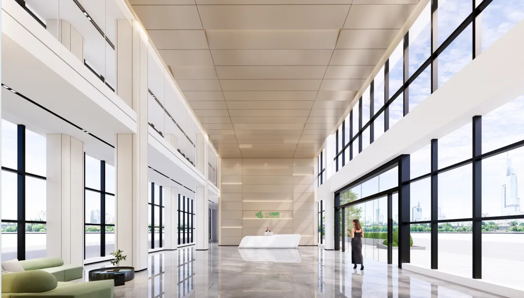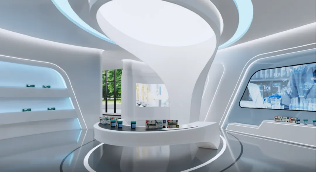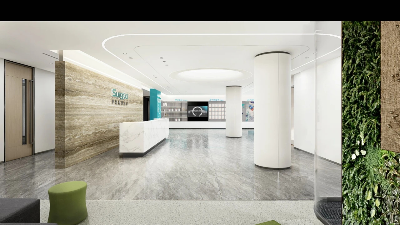 前厅在保留原背景墙和前台的基础上,以洁白透亮为主色调,仅展示墙采用水蓝色玻璃,聚焦视点。“天空之眼”的穹顶天花,拉满未来科技感。