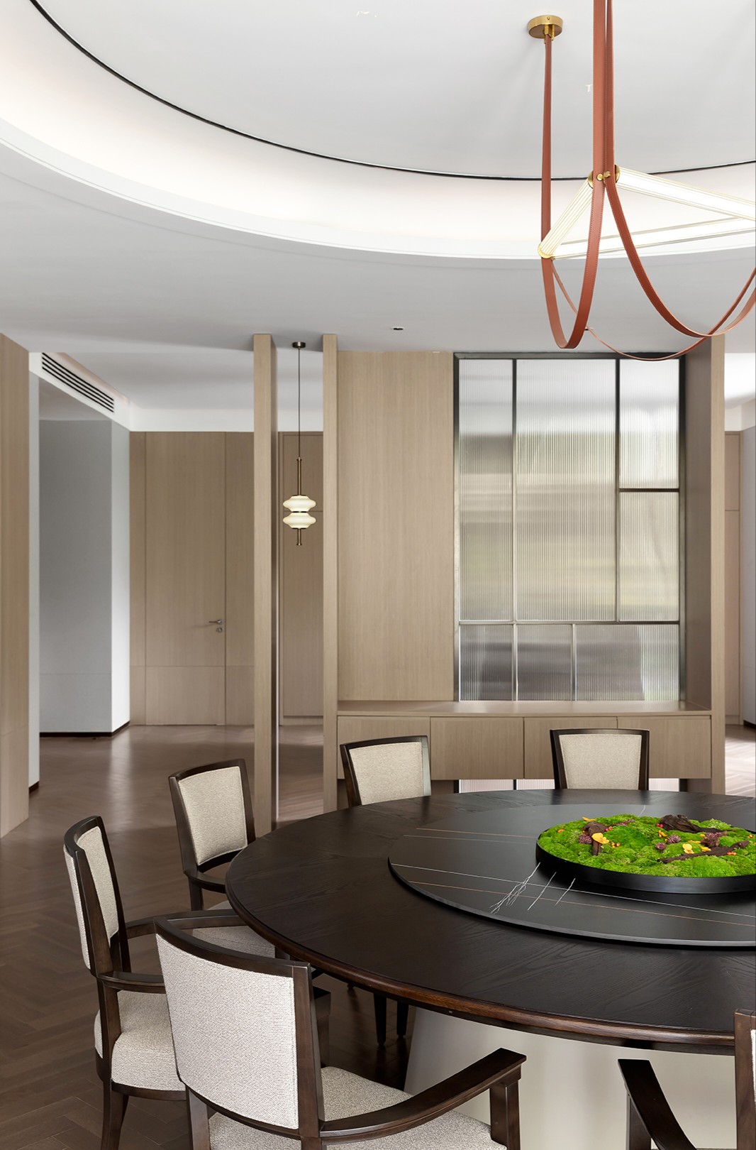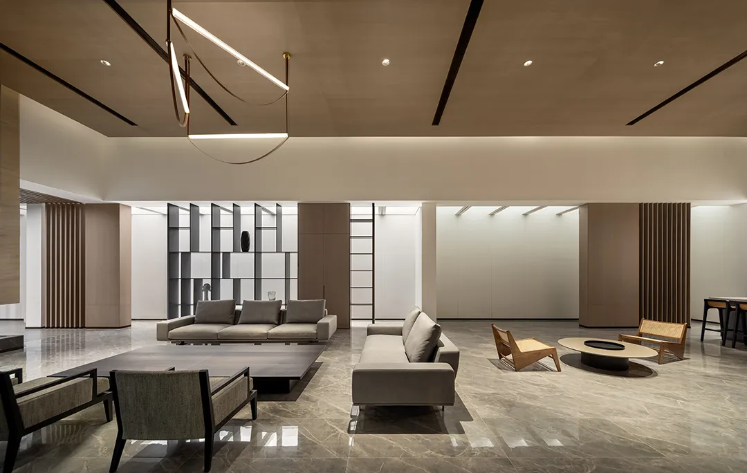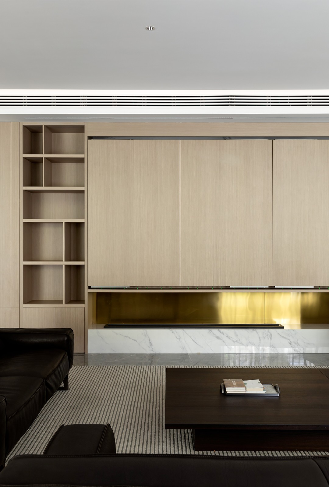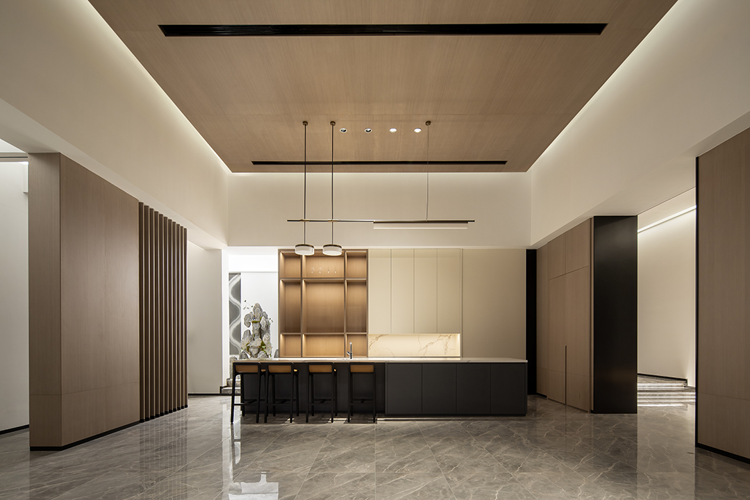 设计师利用线条延伸使空间呈现流动和谐,每⼀个细节都在诉说着其自身的故事,而又在整体的空间框架中找到了各自的位置。⾦属的坚韧冷硬与木饰面的温暖柔软形成了富有张力的对比。