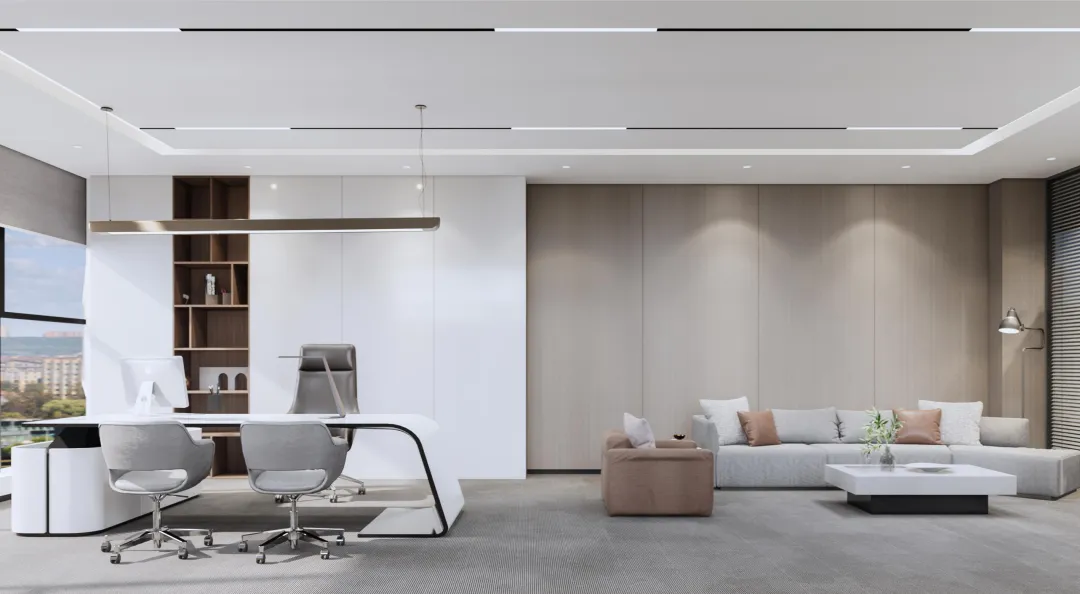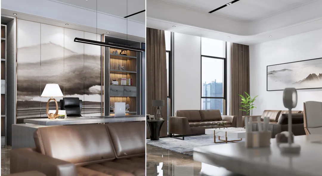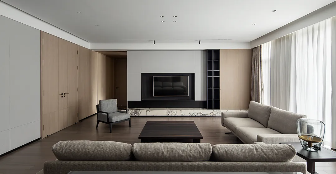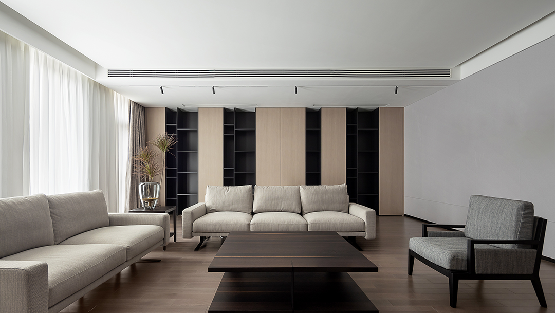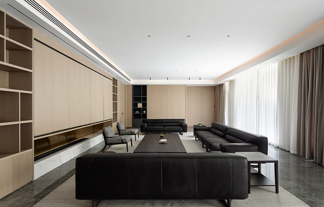 设计师利用线条延伸使空间呈现流动和谐,每⼀个细节都在诉说着其自身的故事,而又在整体的空间框架中找到了各自的位置。⾦属的坚韧冷硬与木饰面的温暖柔软形成了富有张力的对比。