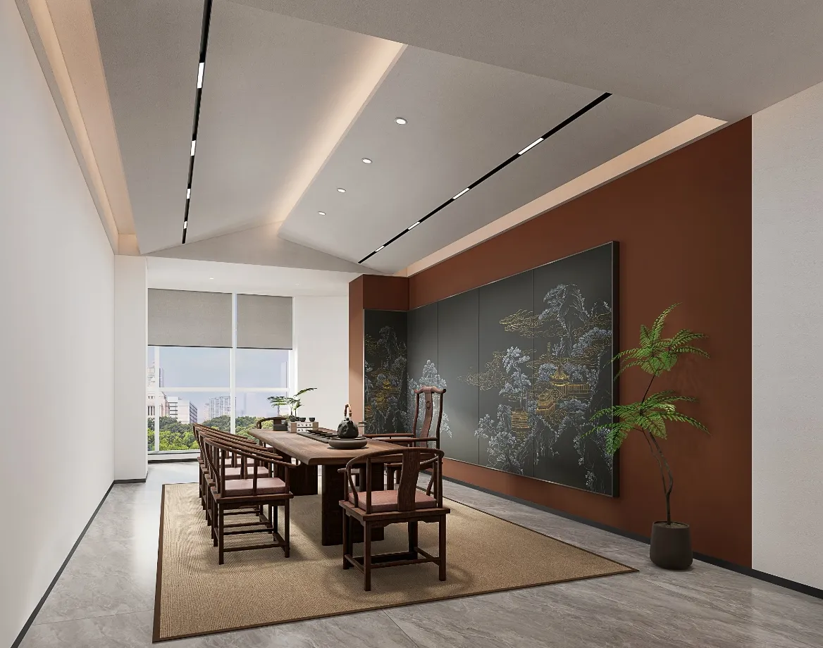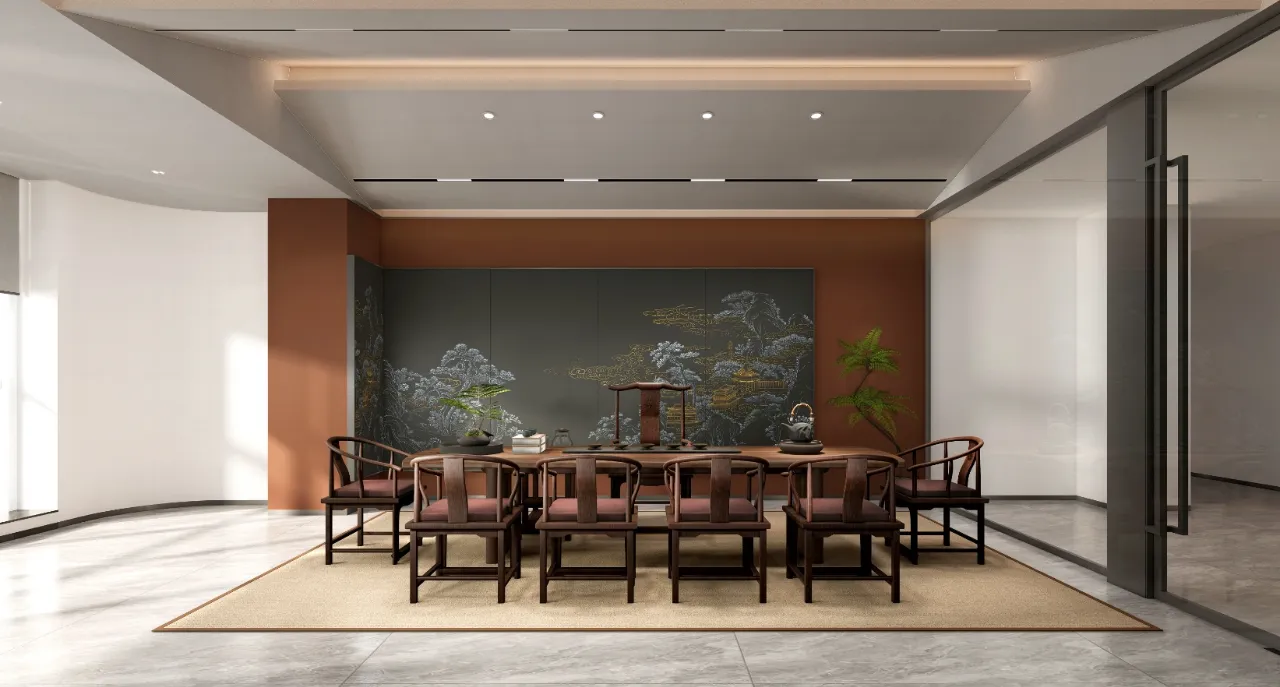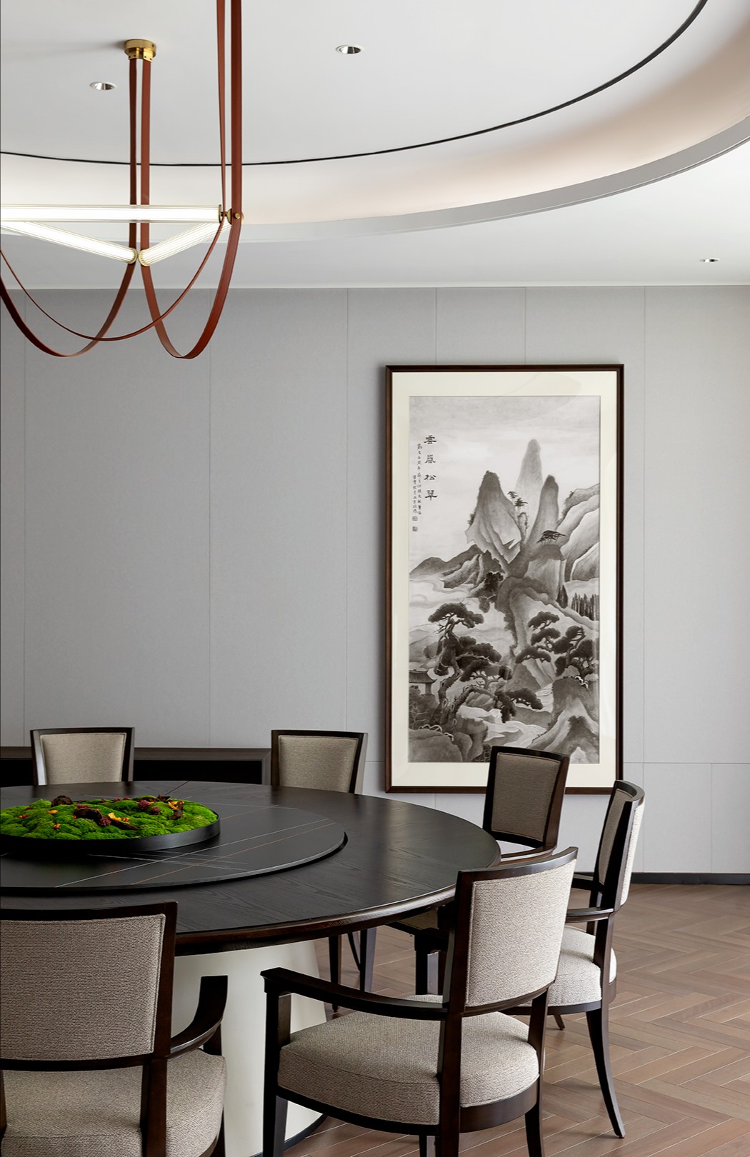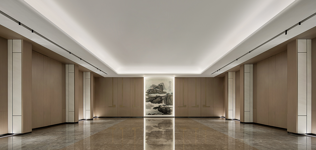 泼墨山水壁画清幽深远,嵌于木饰墙面,⾦属勾勒的线条如留白水晕,空间气韵自然天成。