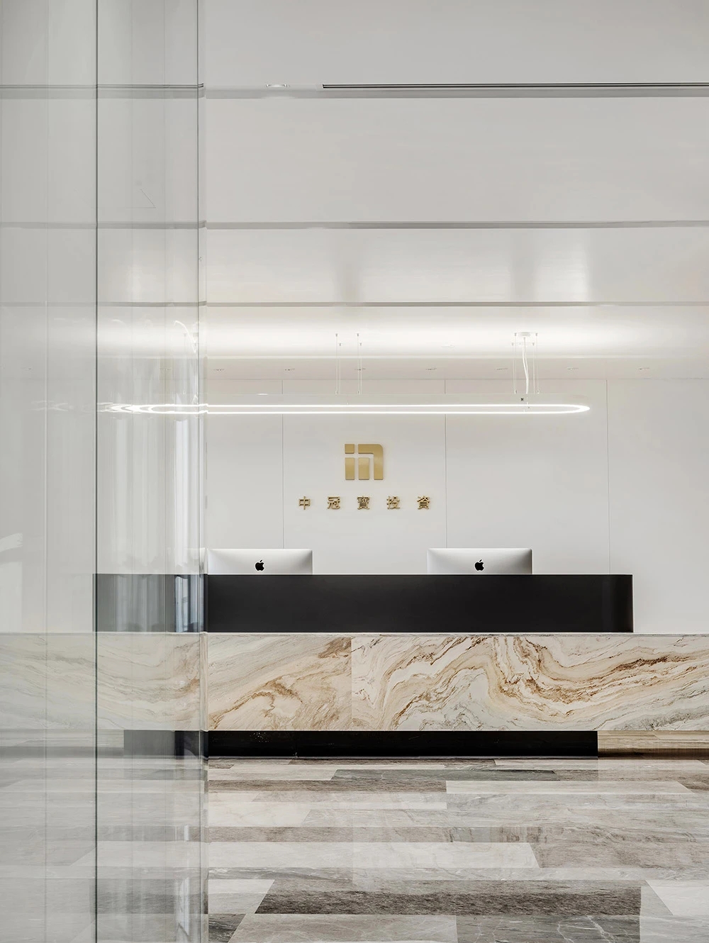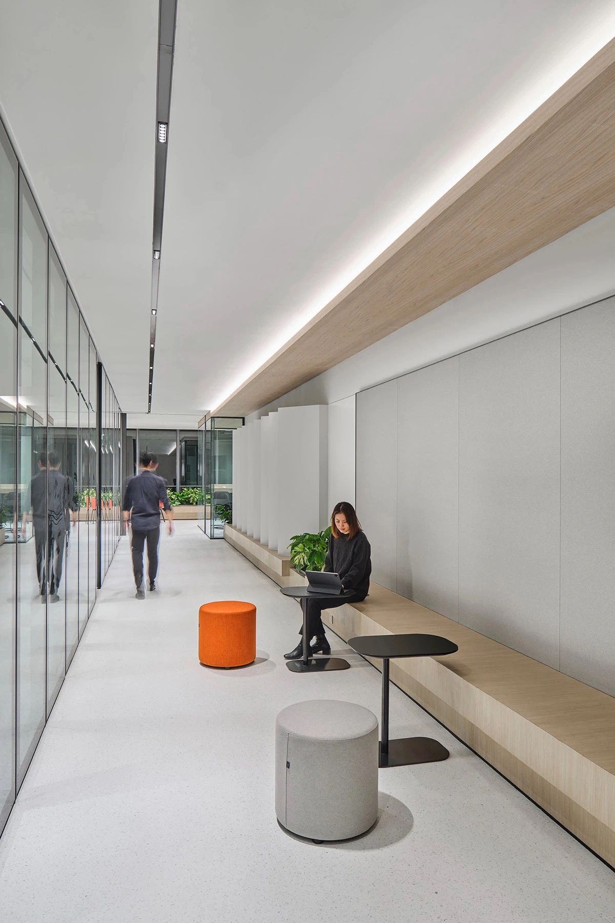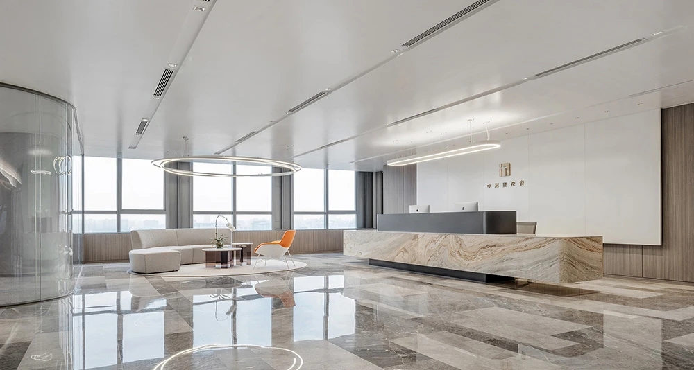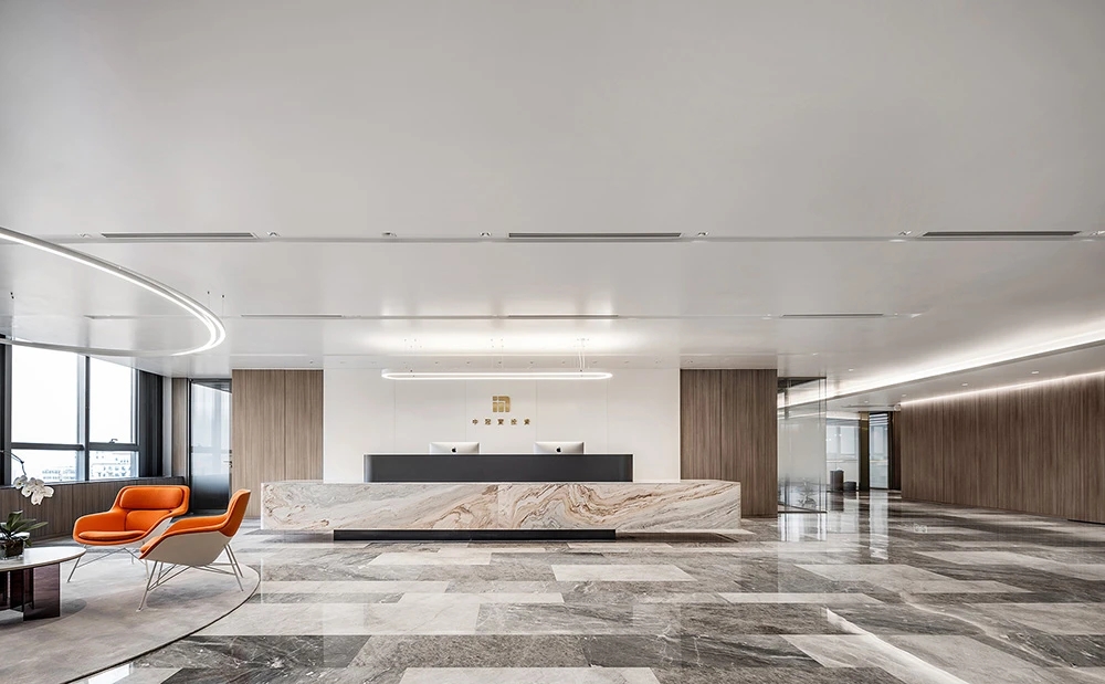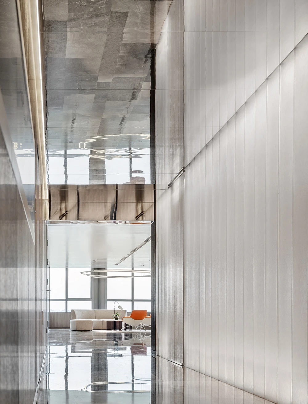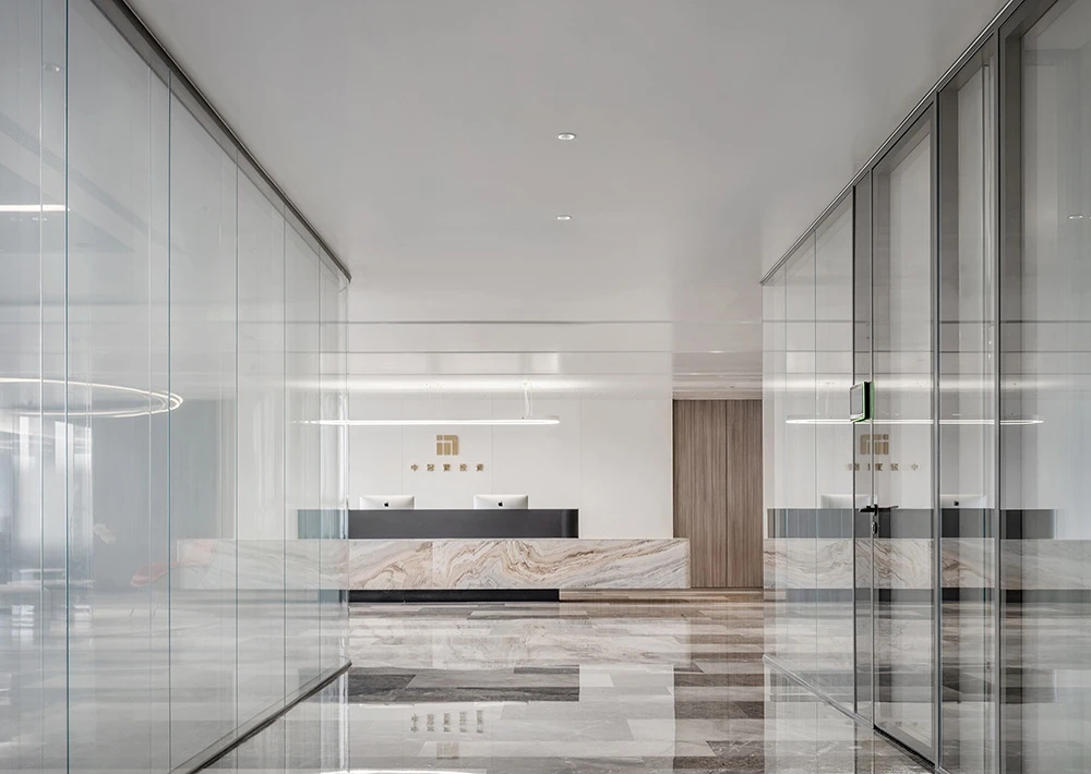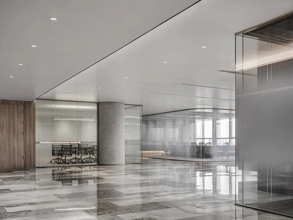 难点1:一下电梯,会感觉电梯厅偏暗;同时核心筒中南北的走道偏暗且狭长。针对以上缺憾,设计上首要考虑补光的手法,但是只采用灯带不能完全解决问题。最终参考建筑U型玻璃幕墙的手法,让整个墙面亮起来,再加上天花镜面的反射,整个空间不仅敞亮且有延伸感。