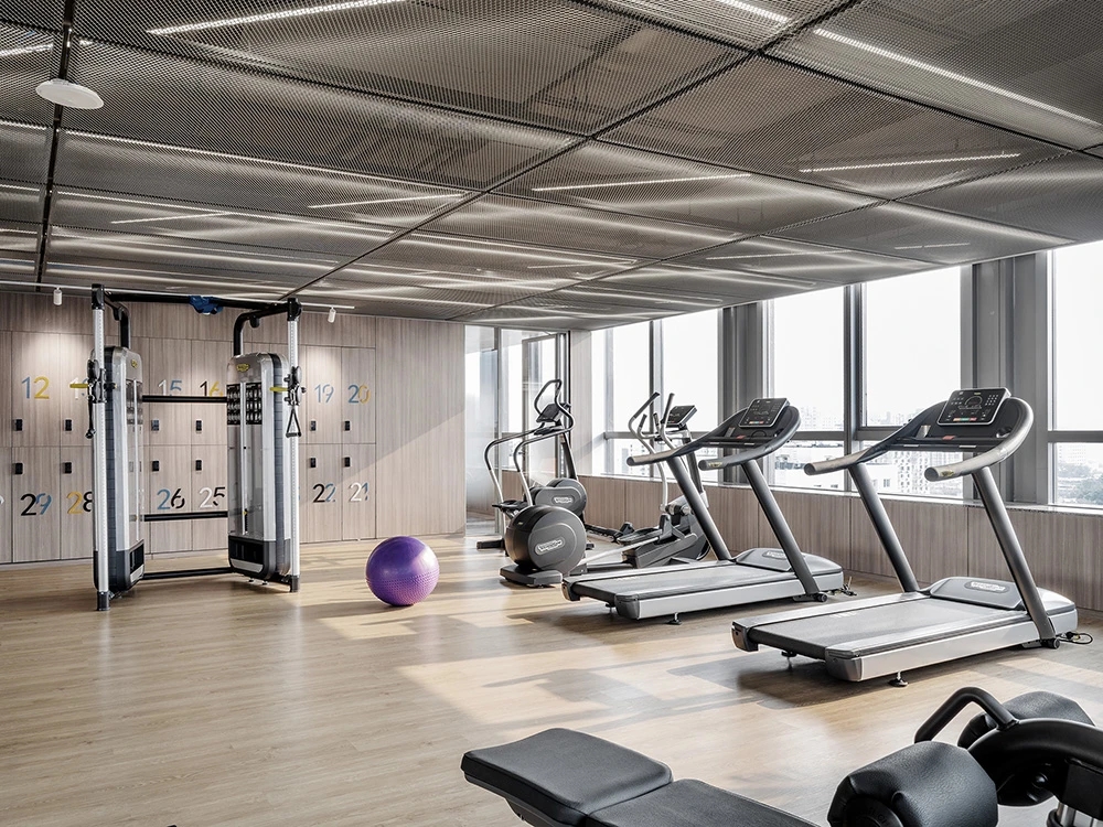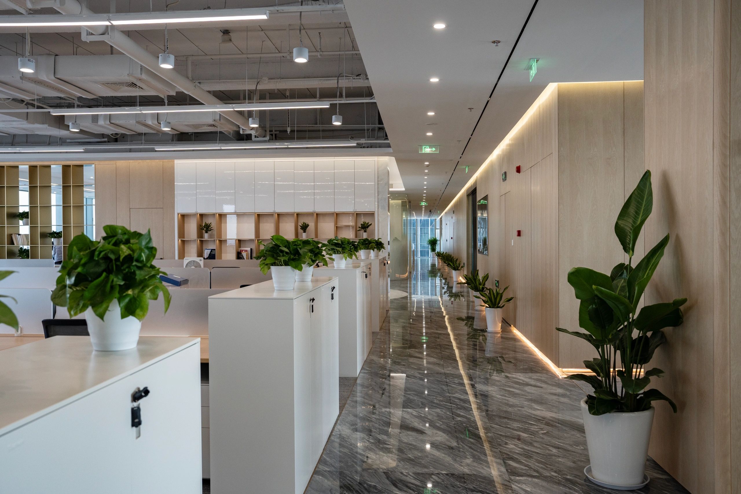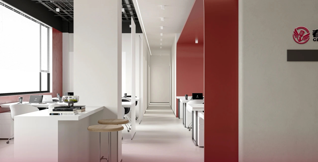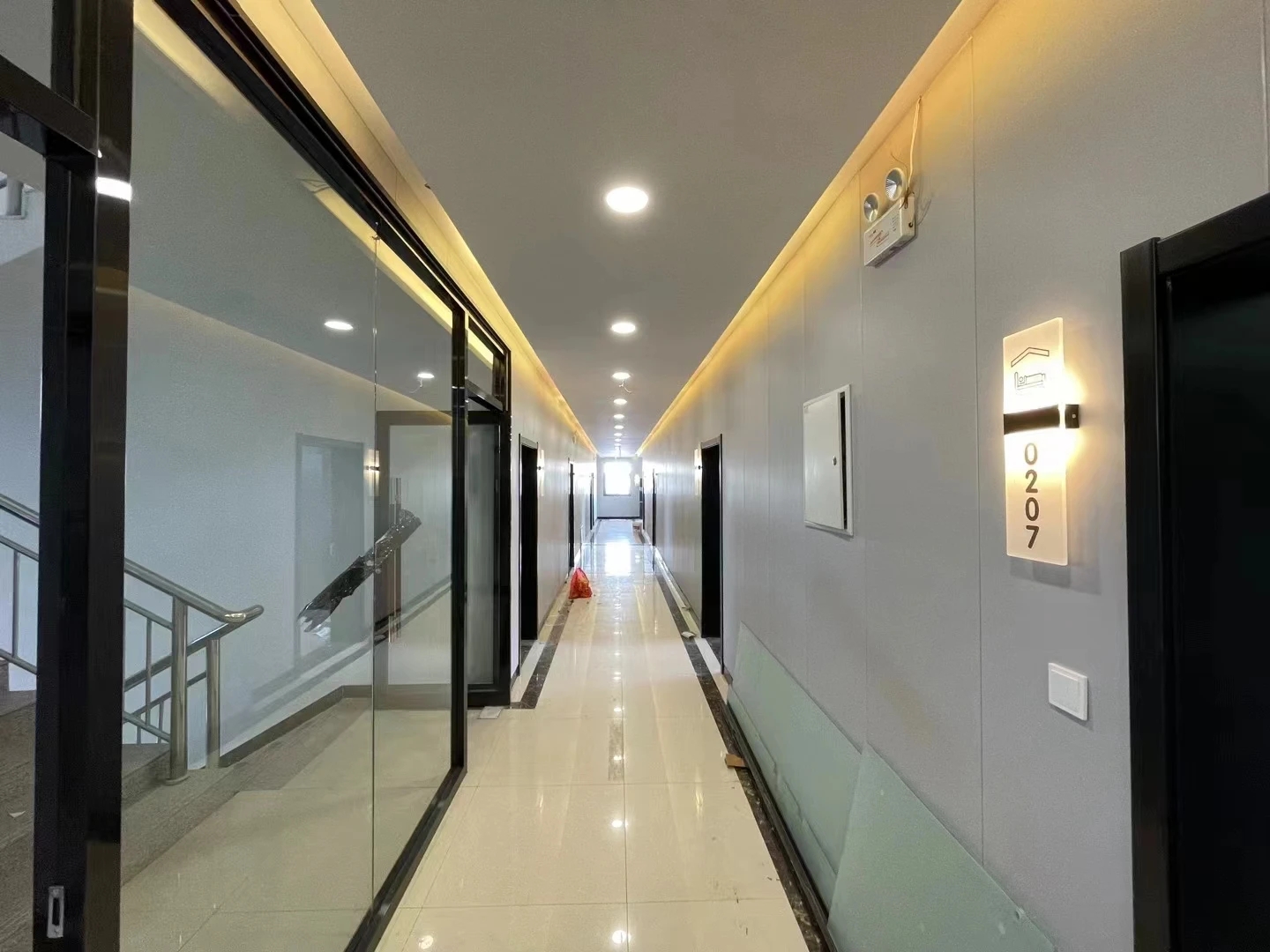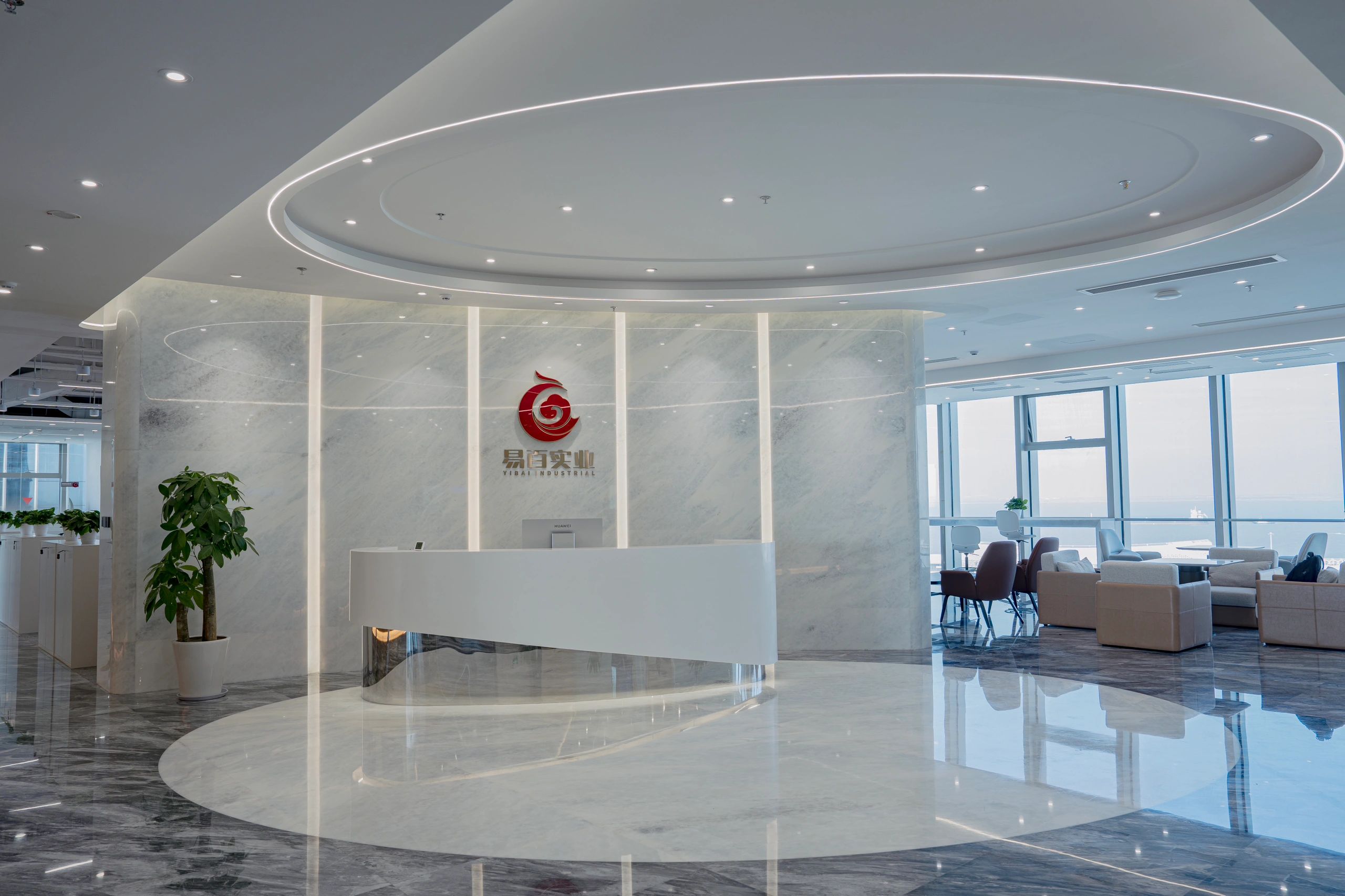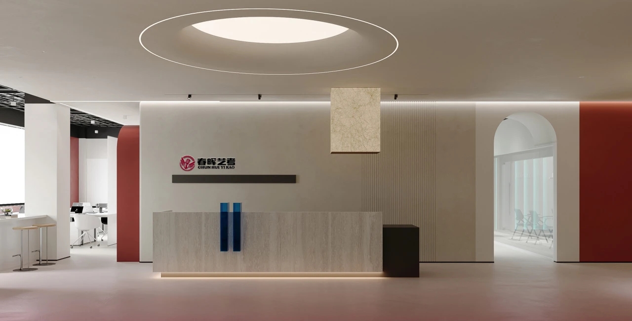 难点1:一下电梯,会感觉电梯厅偏暗;同时核心筒中南北的走道偏暗且狭长。针对以上缺憾,设计上首要考虑补光的手法,但是只采用灯带不能完全解决问题。最终参考建筑U型玻璃幕墙的手法,让整个墙面亮起来,再加上天花镜面的反射,整个空间不仅敞亮且有延伸感。