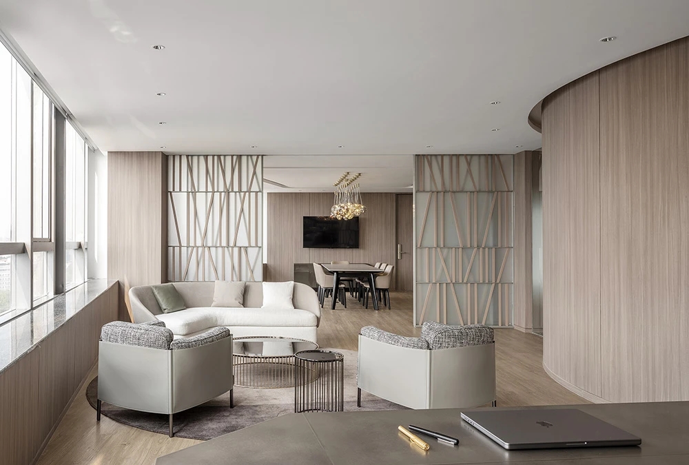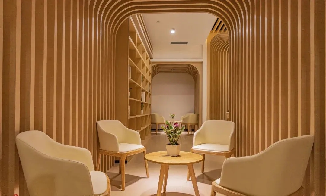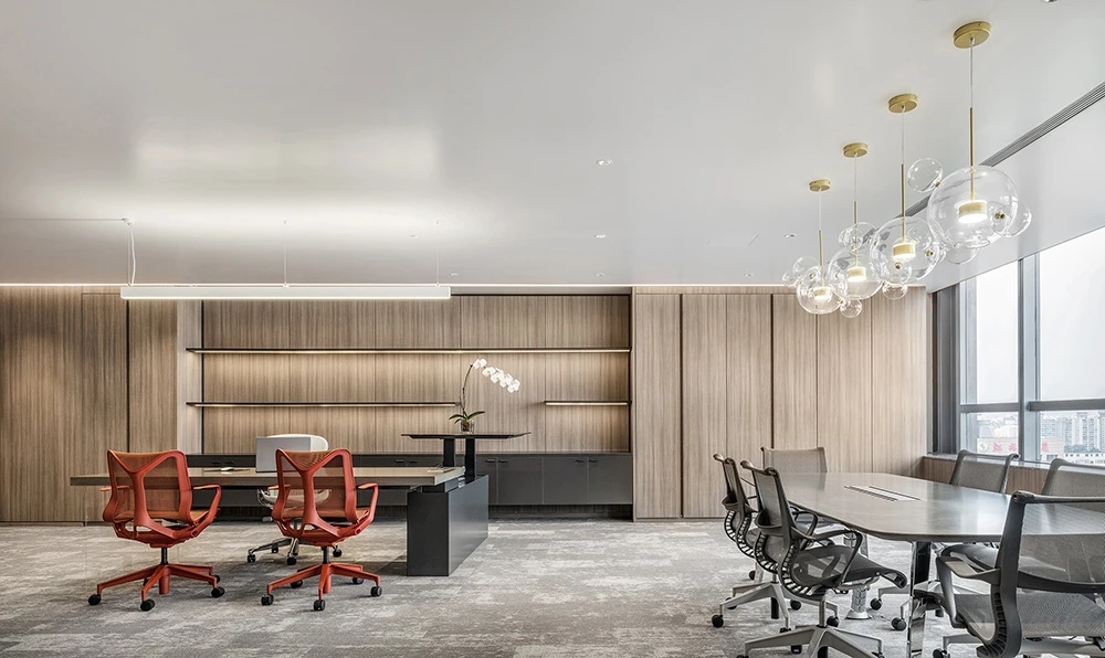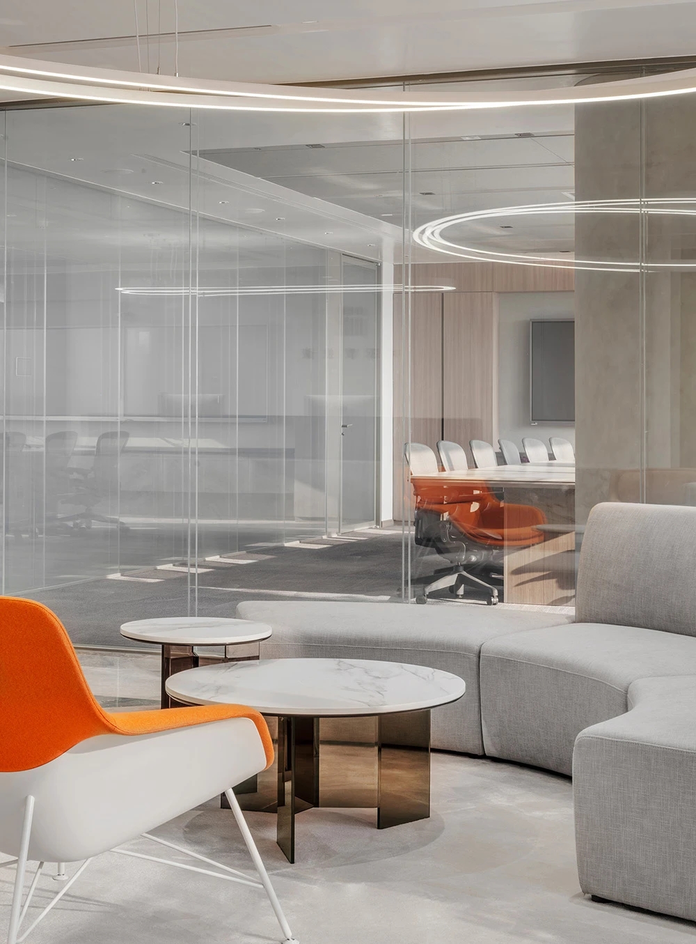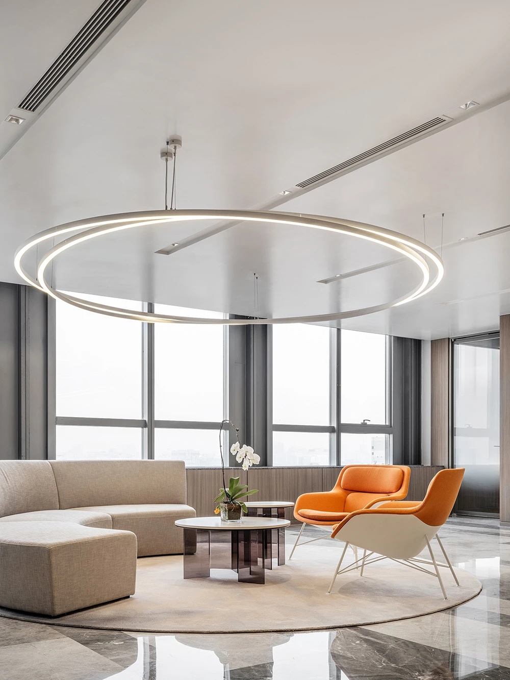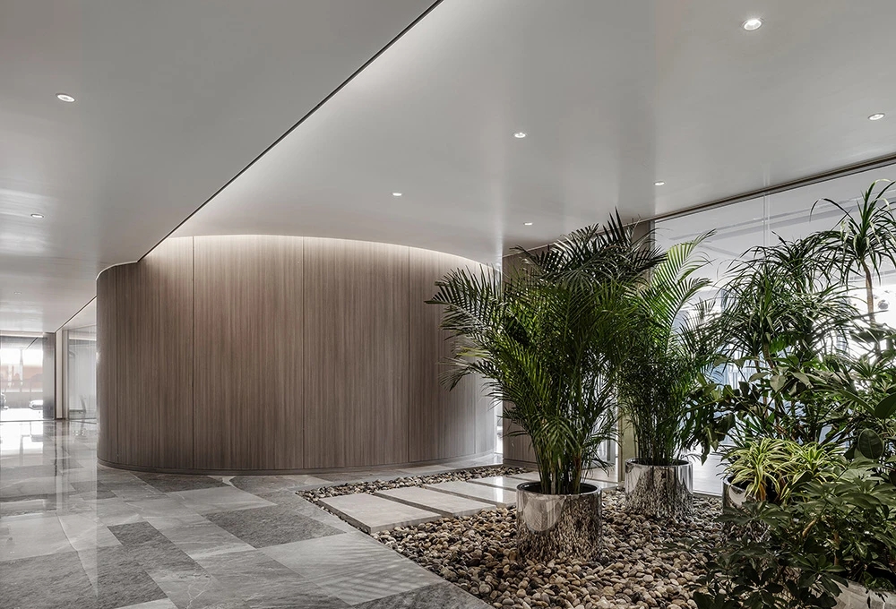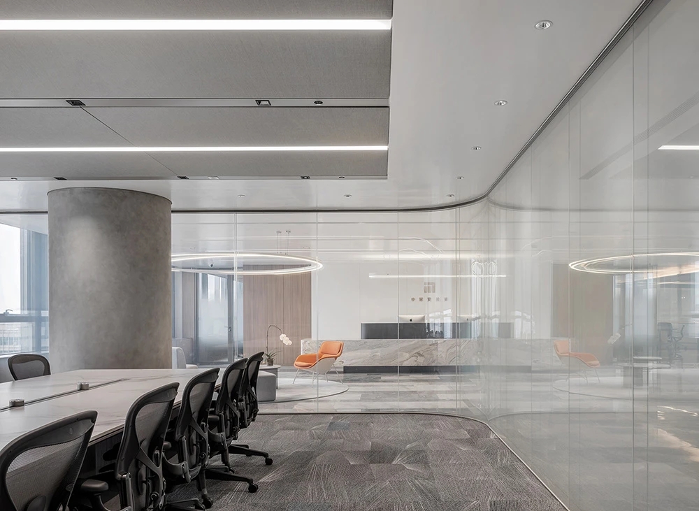 难点2:电梯次入口正对着的方向,即东面三角形状的玻璃幕墙。如何化解空间中的冲突并有效利用它?设计上想到用“圆”的形体,将其置于二者之间。设计团队将这个圆形空间设计成封闭的冥想室,这样不仅削弱了三角形的斜面、又让电梯厅次入口有了遮挡,有效地缓和了空间中的不规则,同时让空间多了一些变化。