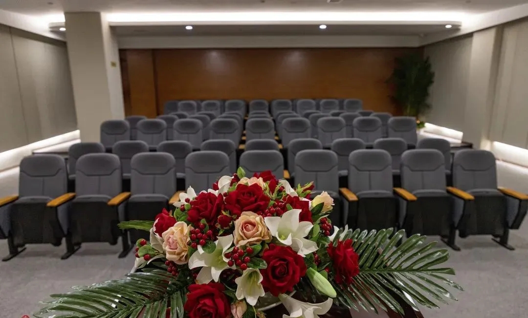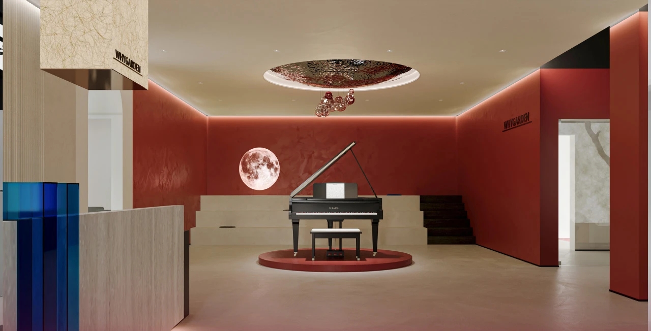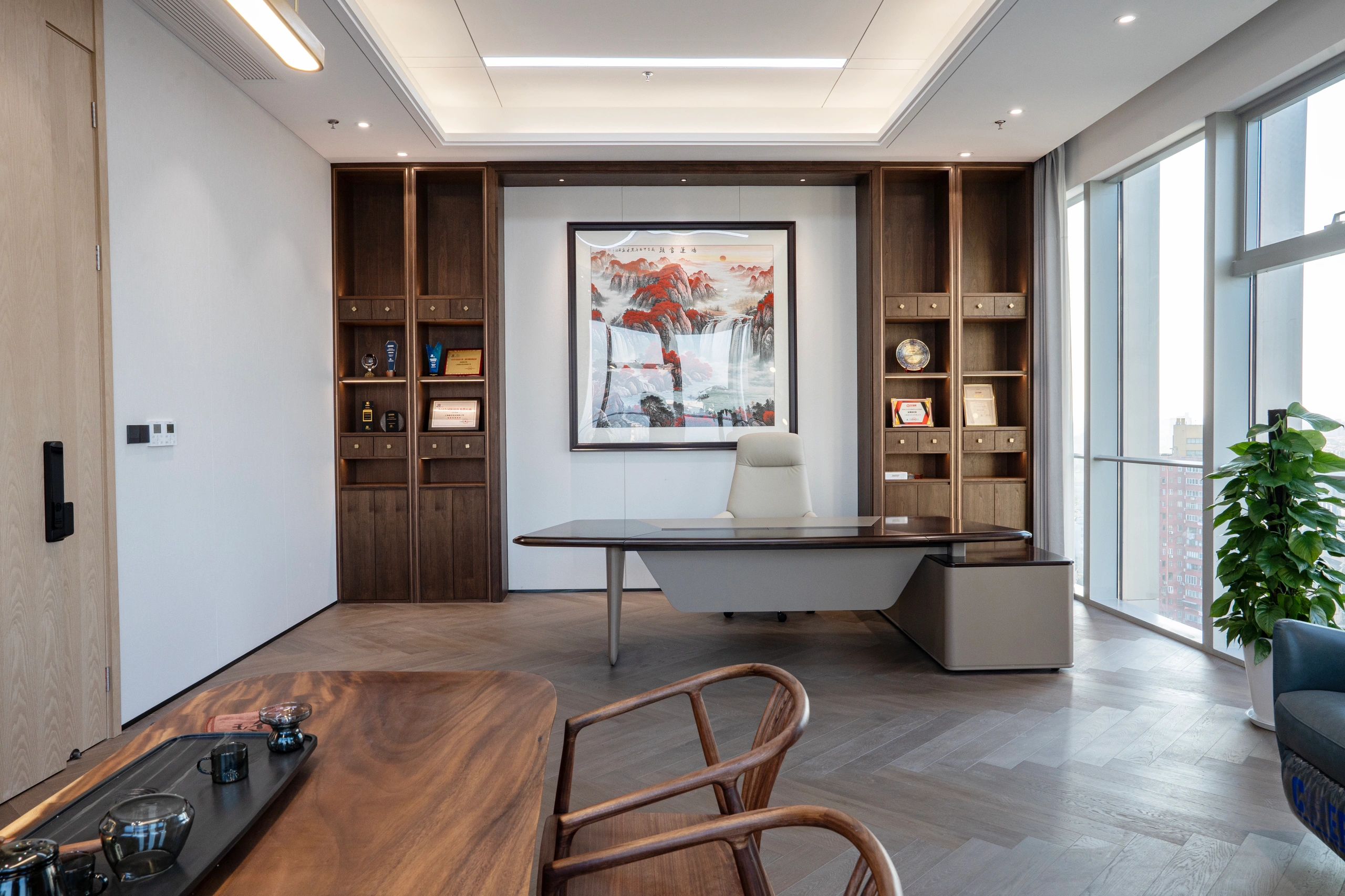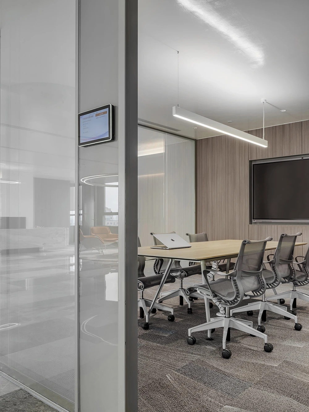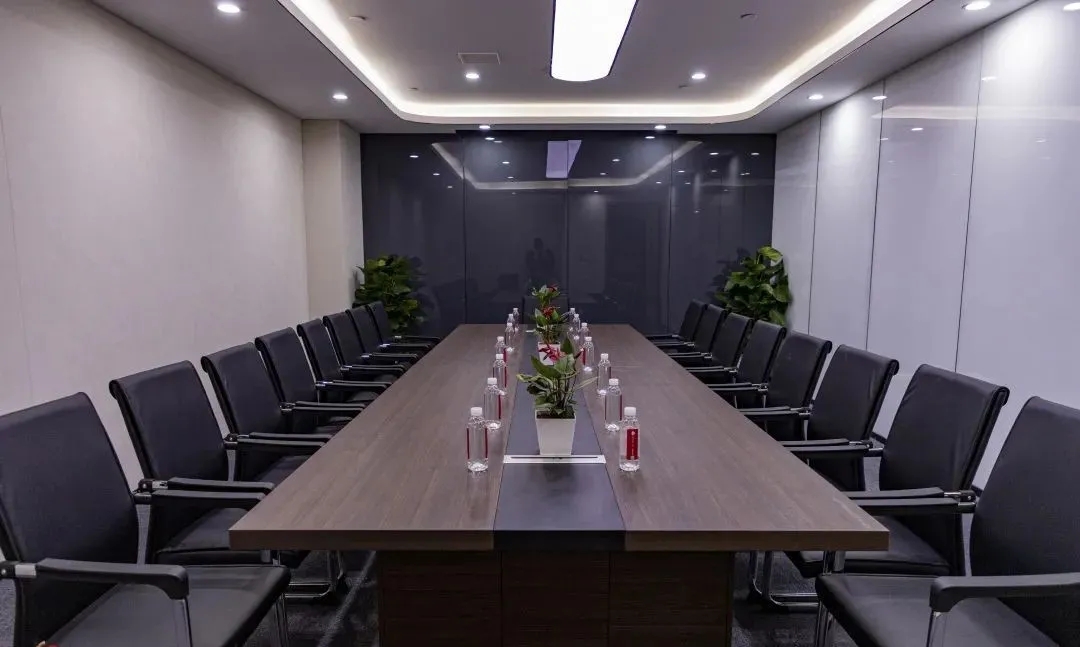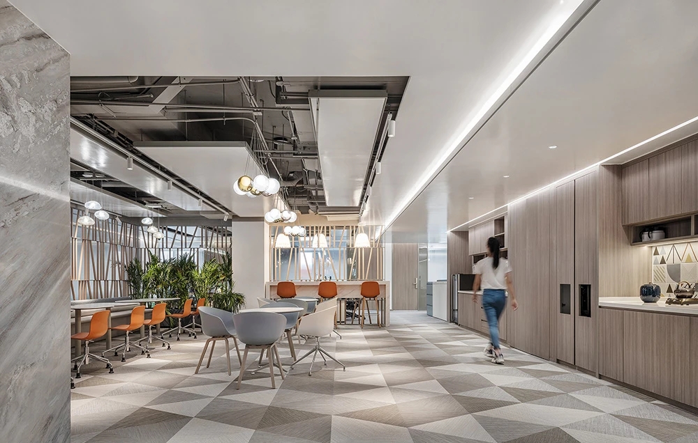 难点2:电梯次入口正对着的方向,即东面三角形状的玻璃幕墙。如何化解空间中的冲突并有效利用它?设计上想到用“圆”的形体,将其置于二者之间。设计团队将这个圆形空间设计成封闭的冥想室,这样不仅削弱了三角形的斜面、又让电梯厅次入口有了遮挡,有效地缓和了空间中的不规则,同时让空间多了一些变化。