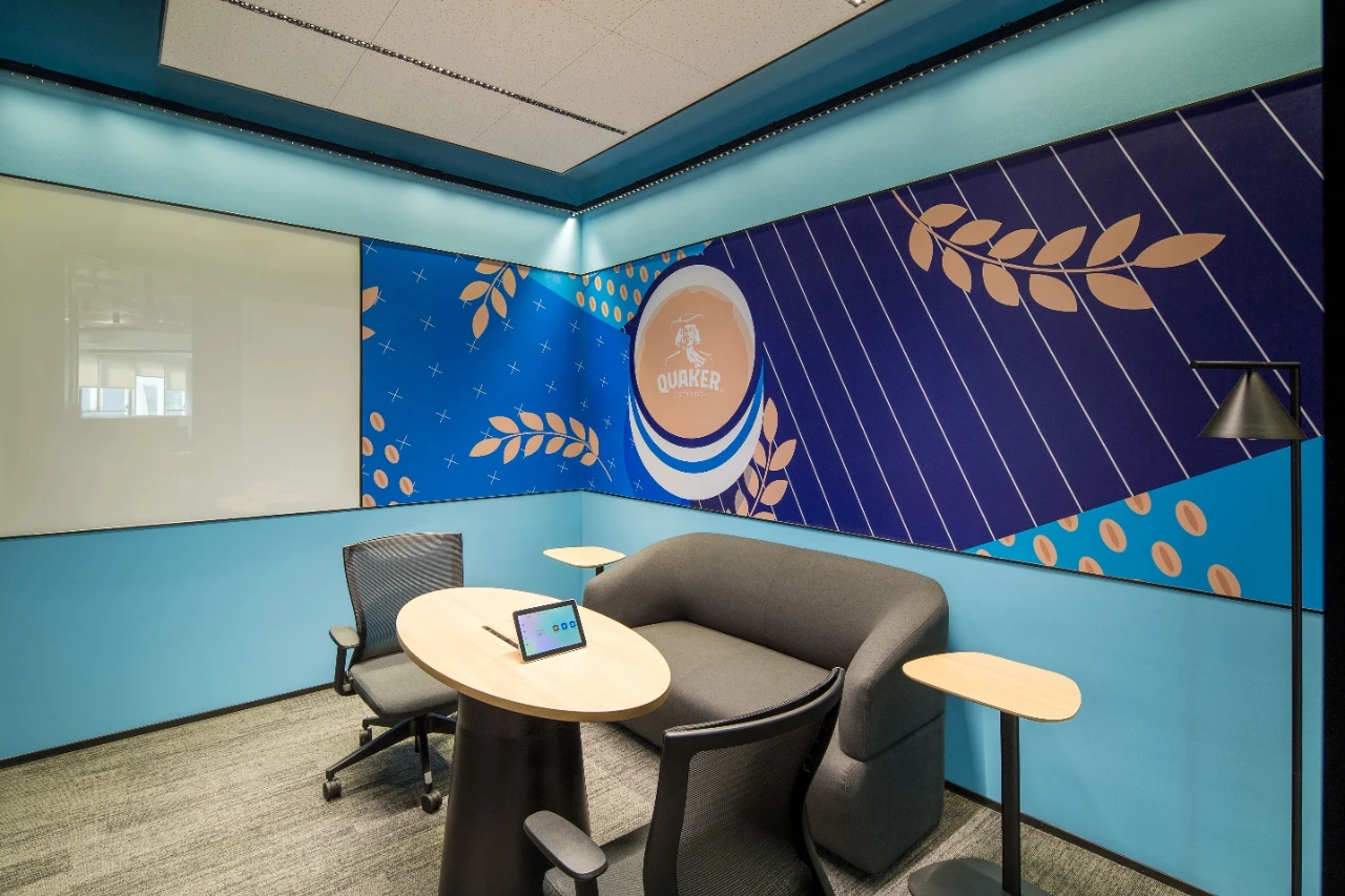 整座办公室不以隔间划分界线,不以尺寸衡量大小,打造独立又不疏离的空间感。人可以在自己喜欢的区域停留,也会把停留作为自己高效的时段去完成工作。从这里出发,企业墙上传递着功能空间的信息,导向着过去的印记,当下的发展,未来的愿景。