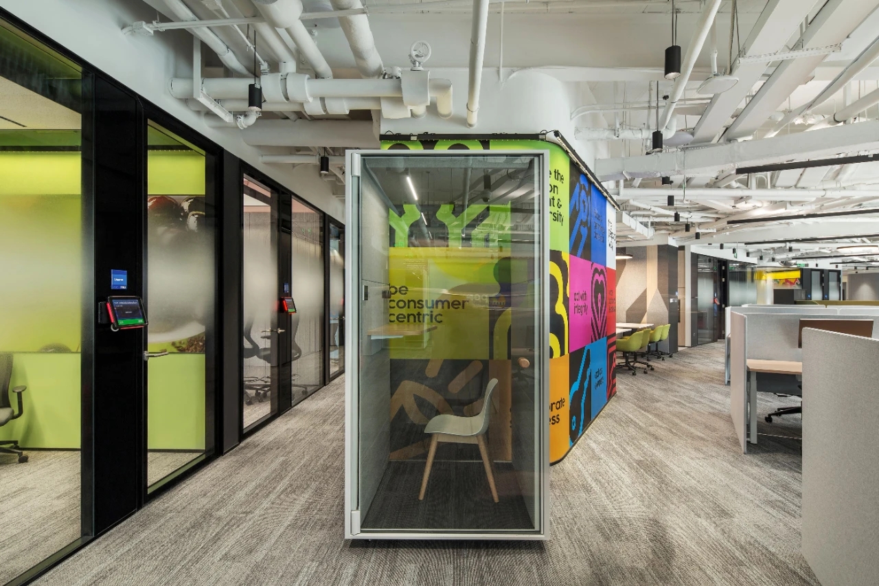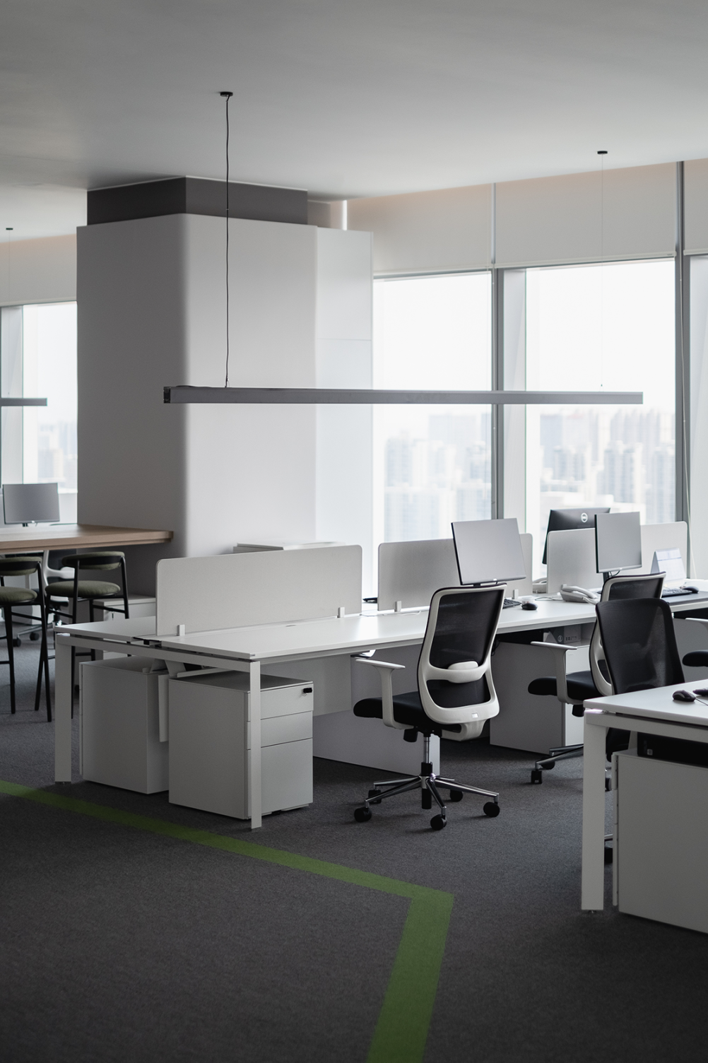 通往办公区域的地面有绿色的延伸线,与空间撞色呼应,起到引导作用。巧妙的规划最大限度的提高了空间感,既有团队协作的开放办公区,也有半私密的专用区域,彰显了包容性的公司文化,员工可以在最适合其需求的空间设置之间自由移动。