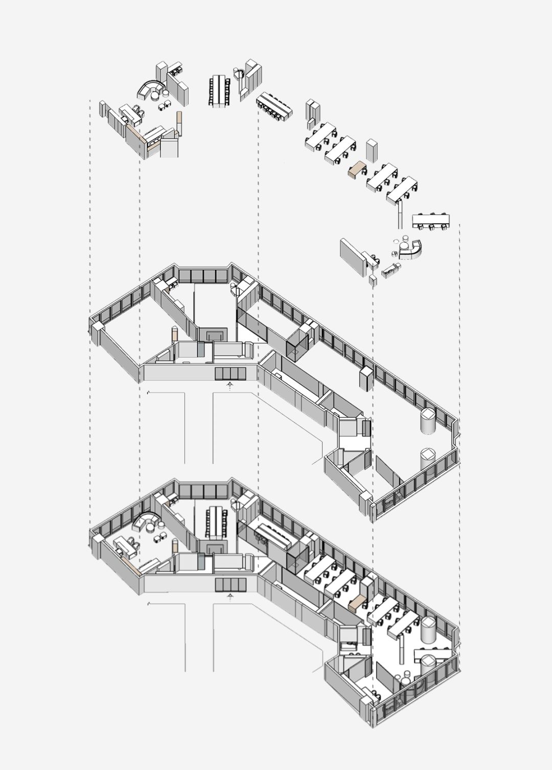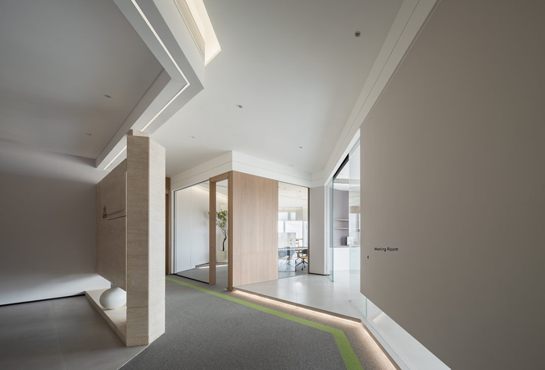一个舒适的办公空间需要丰富的感官体验,人性化的空间设计。为了确保这一点,设计师在经过构思后决定将空间划分出独立又相互连接的区块,七个功能性房间加一个开放式的动态办公区域,并以通透的玻璃延伸视线,最大化满足客户的需求。