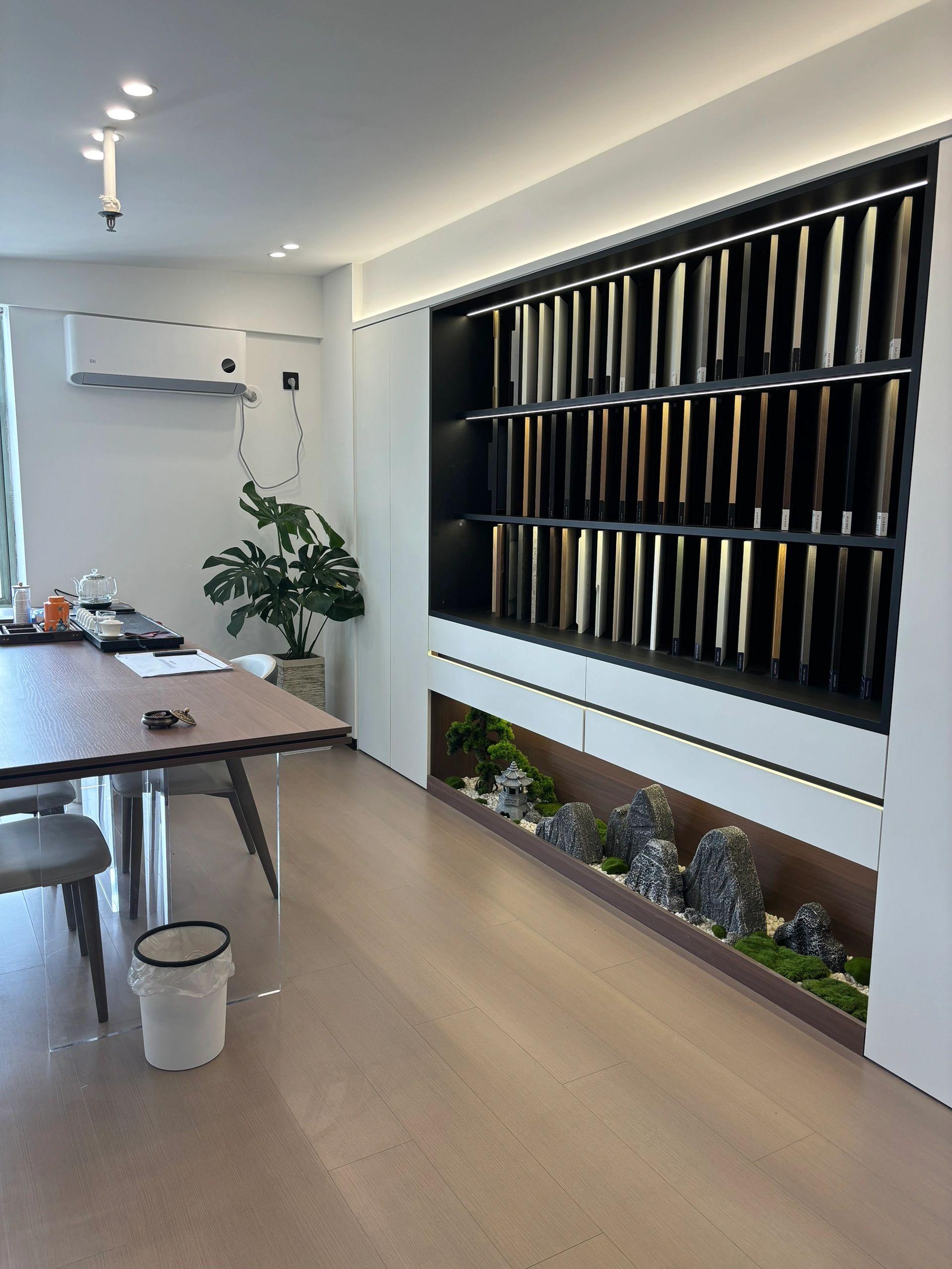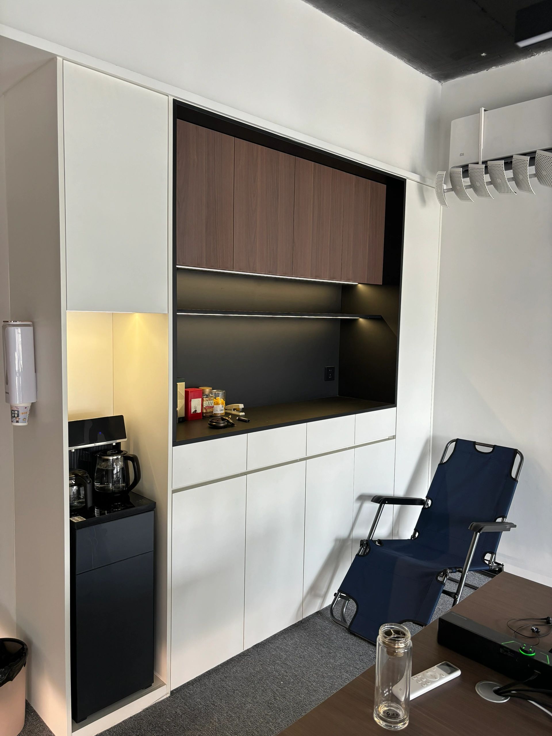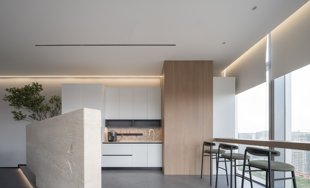 茶水间的墙壁仍以木白为主,而与会客厅之间的隔断则特别使用镂空处理,将三角形的开口从简单的形状转化为修饰手段。工作之余来到茶水间补给小憩,落地窗外城市的繁华与办公室内的安静互相映衬。细碎的光影洒进室内,赋予绿植一片生机,营造欢乐的午茶氛围。
