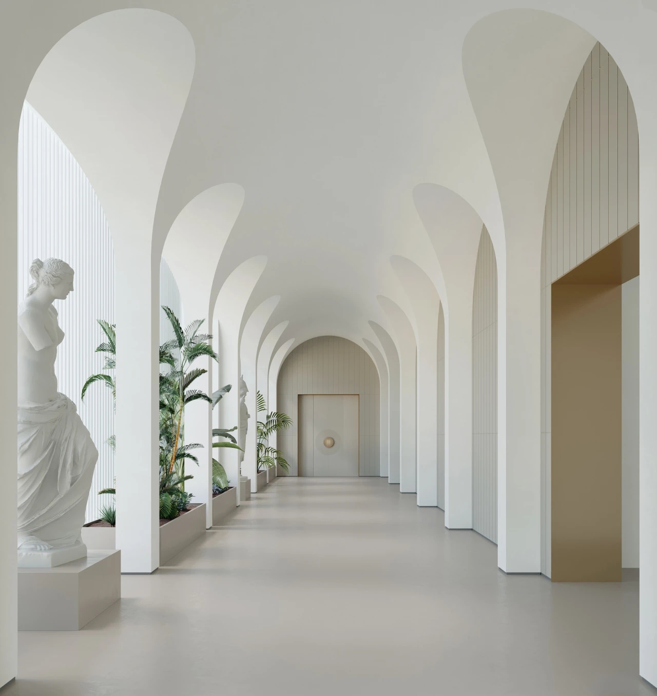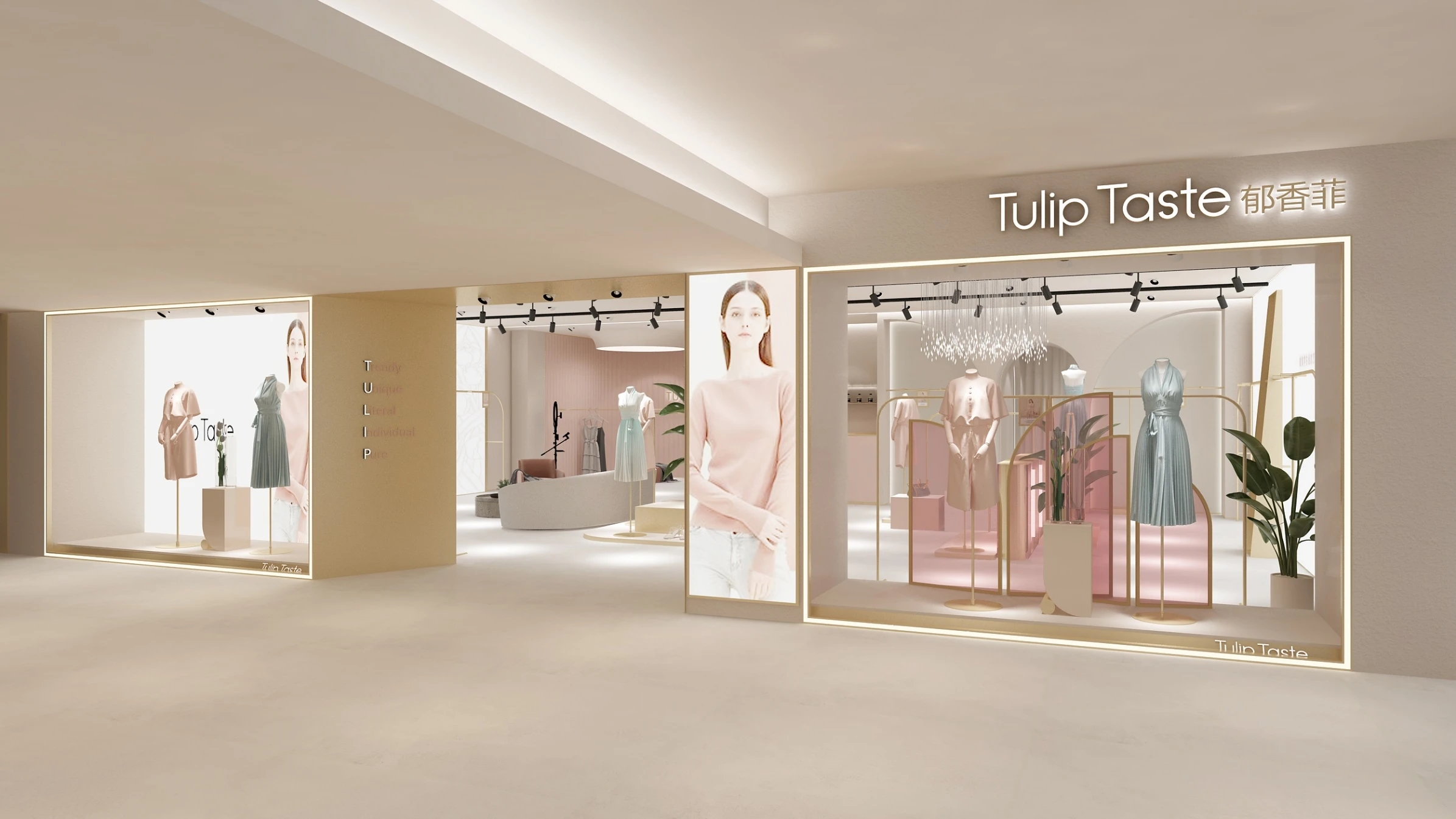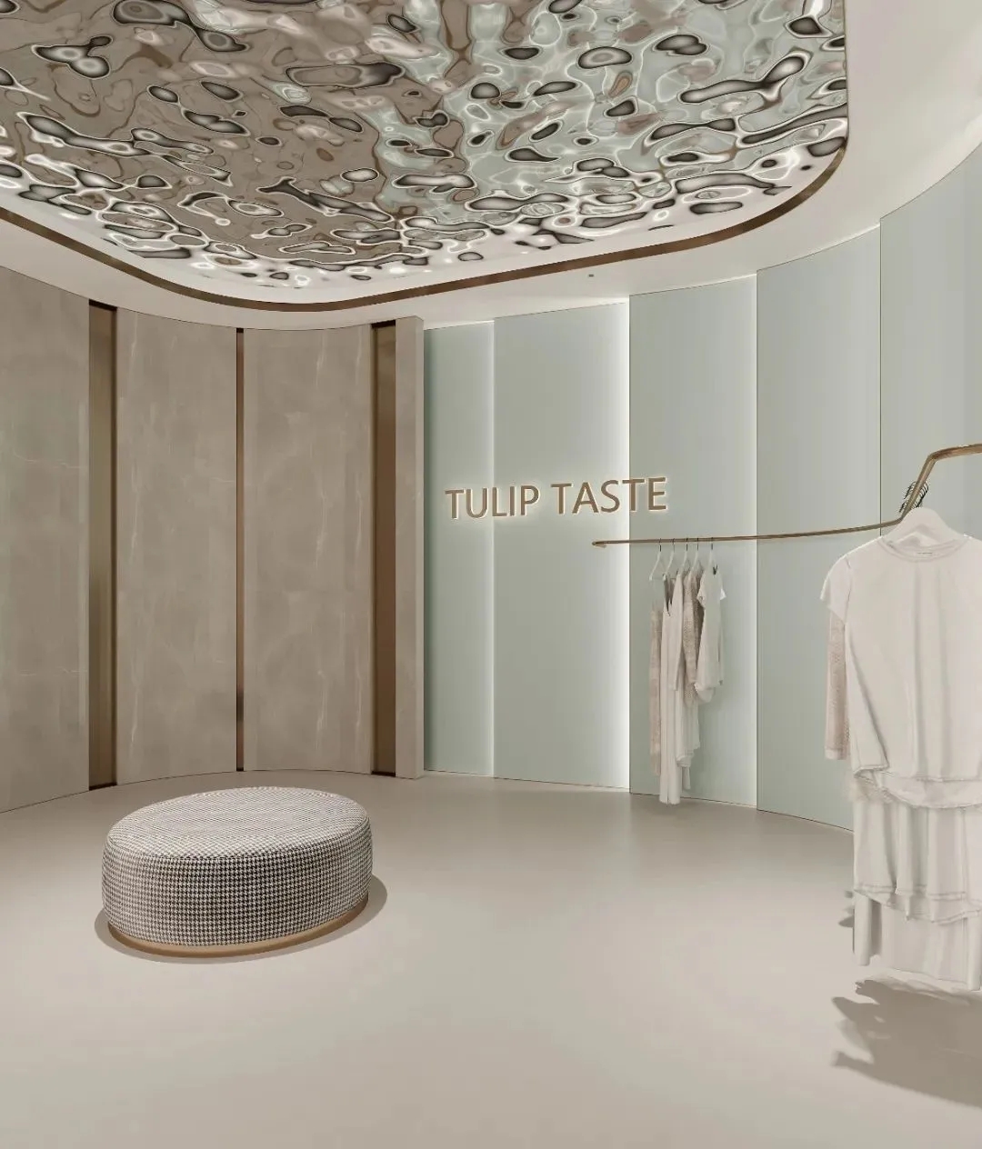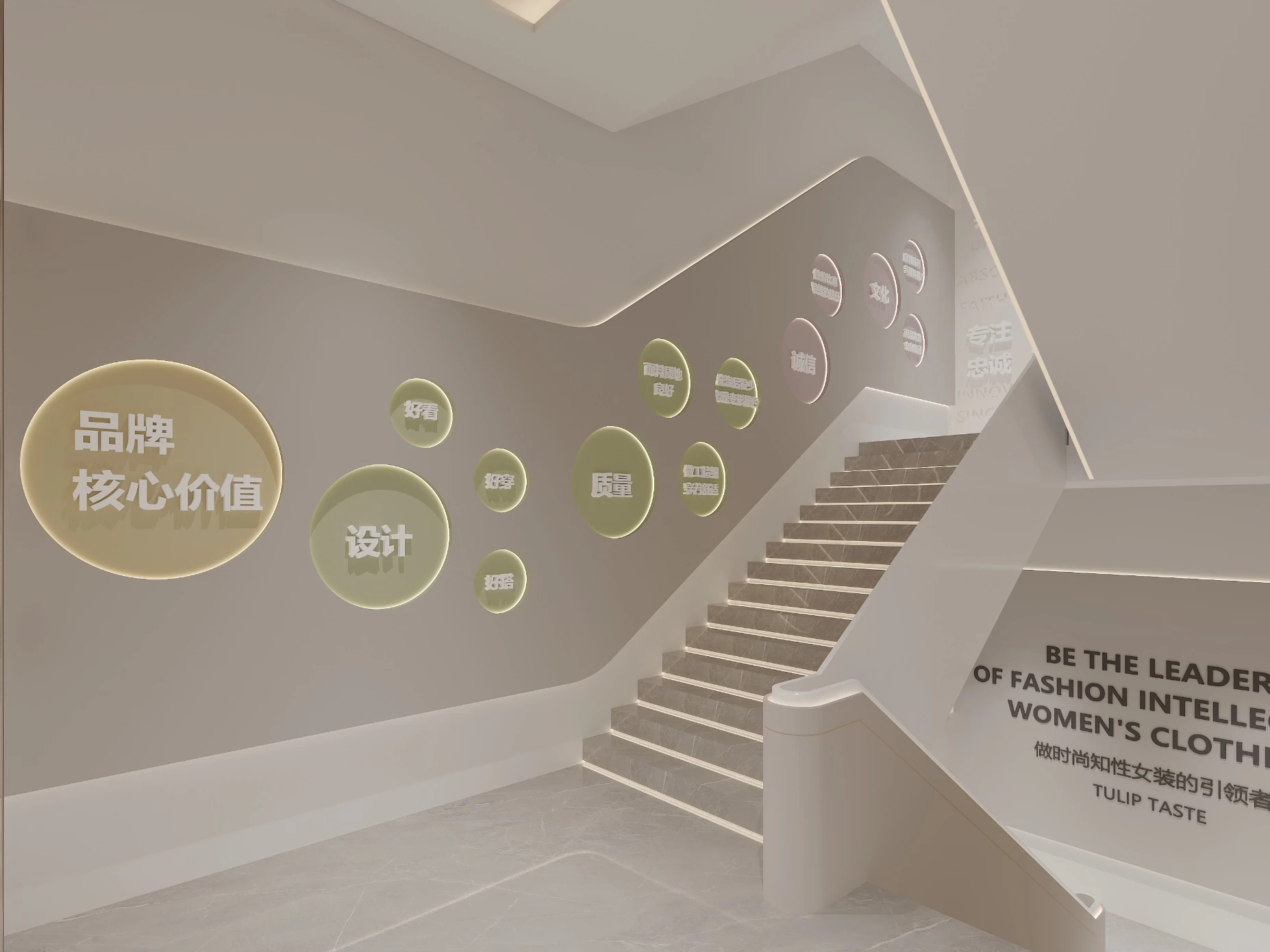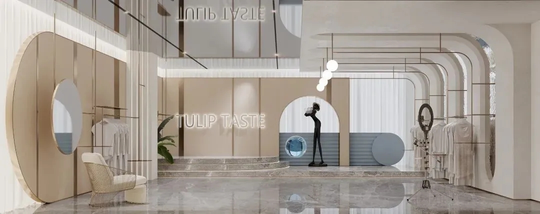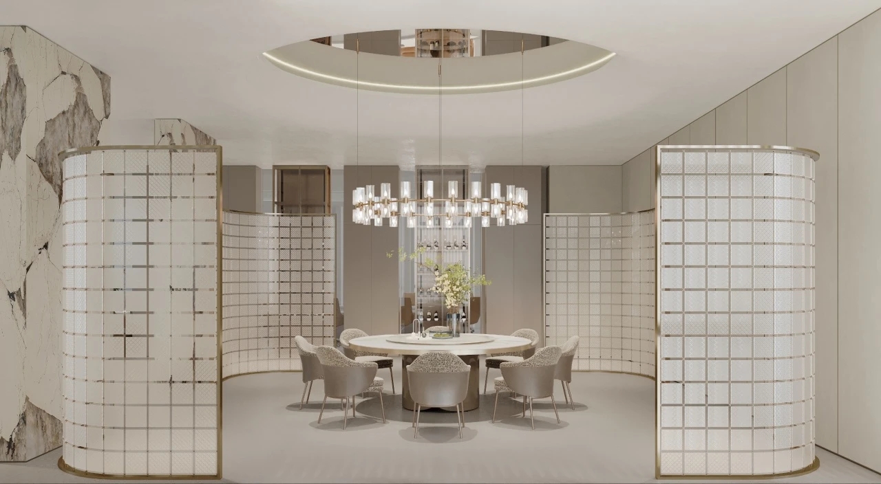 设计契合郁香菲品牌对艺术的向往和美学的追求,选用低调的香槟色作为一楼大堂的主色调,演绎出企业简约而摩登的风格。前厅中飘落的装置点缀了空间的留白,营造出时尚优雅的企业气质。整体区域不仅满足了数百名员工的办公需求,还能够进行对外接待和展示。