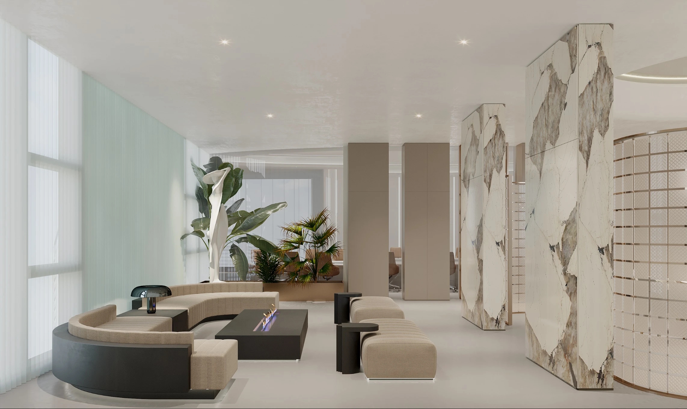 大堂使用开阔明朗的落地玻璃和具有理石纹路的地面铺设,最大程度营造了温暖的接待氛围同时为日常接待和协作办公降低空间使用的损耗成本。顶部上方选用可以产生映射效果的高光镜面板扩大了整体的空间视野。