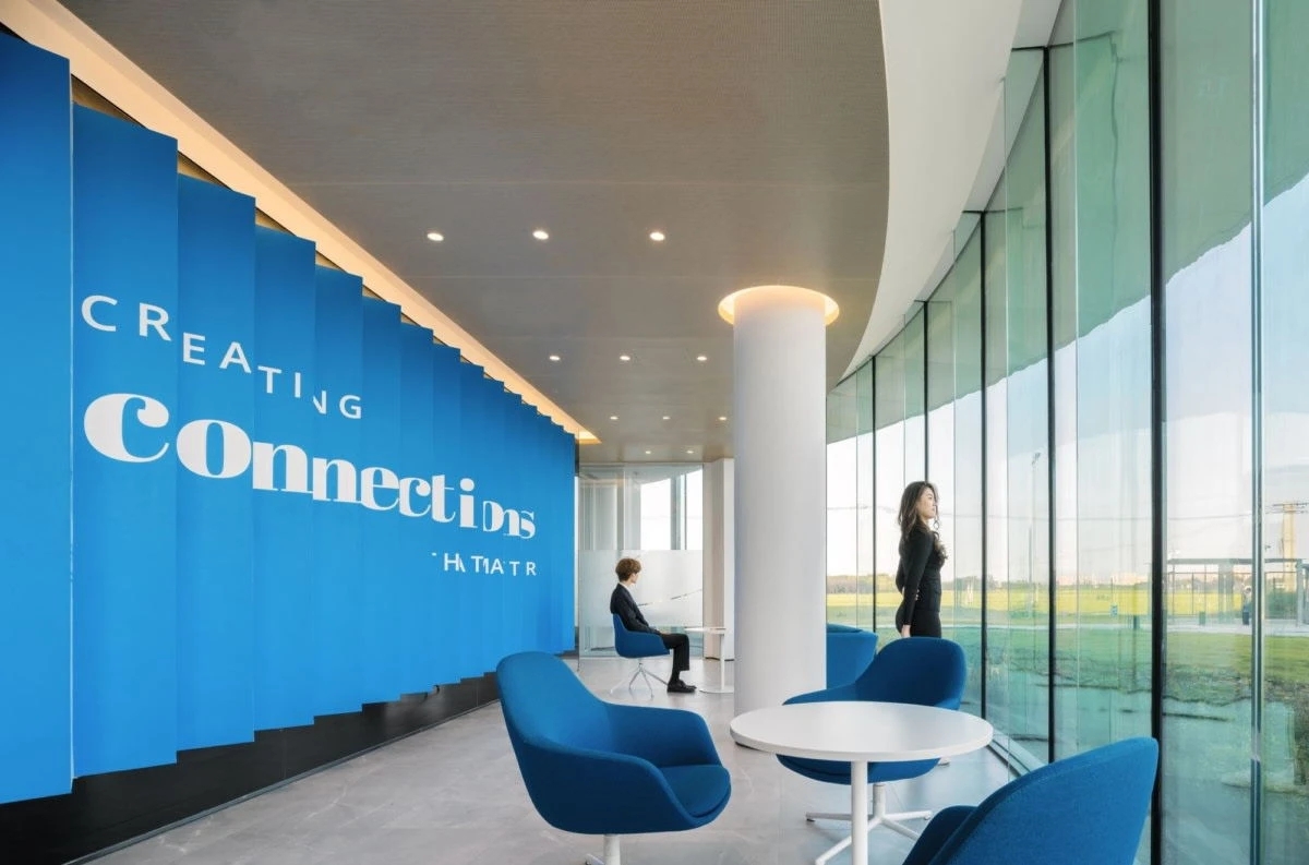 前台接待区,给人先入为主的稳定与轻盈感。整体空间色调,采用体现未来科技感的灰色和有温暖感的木色相结合,兼具理性与感性,彰显国际化气质。