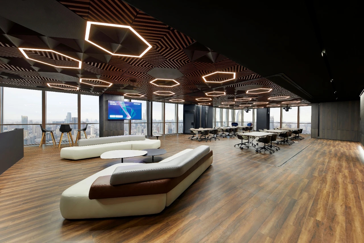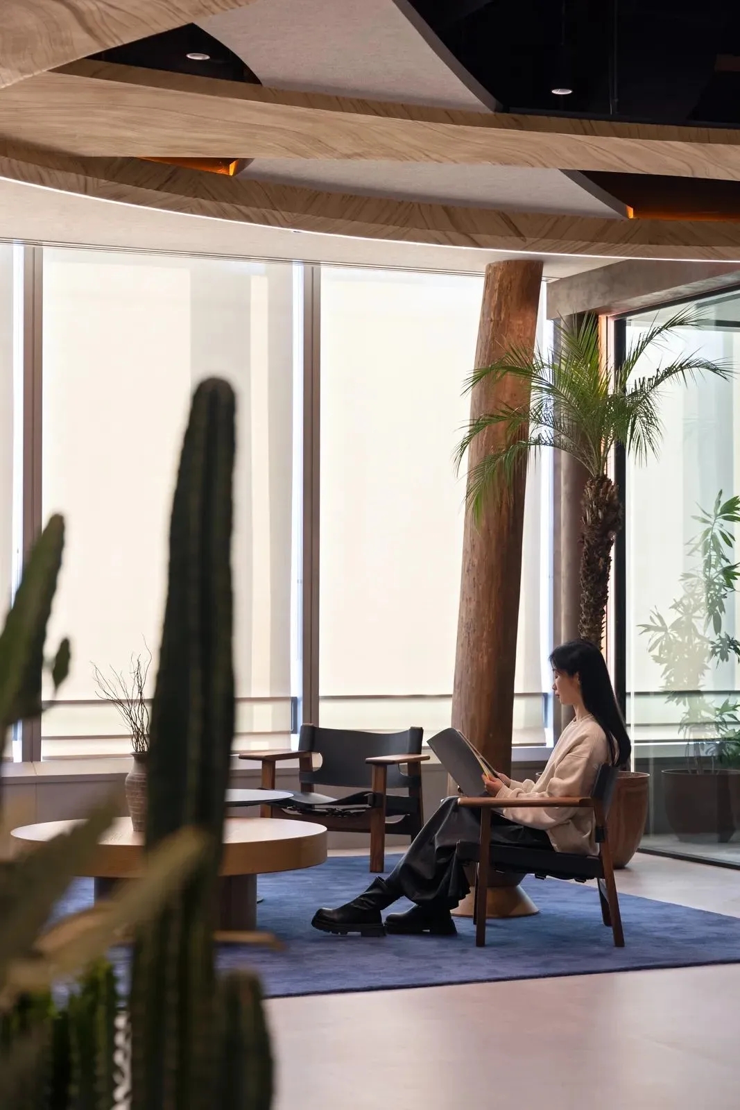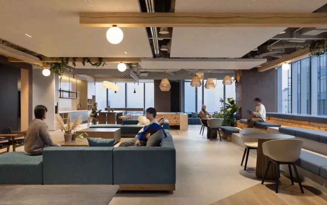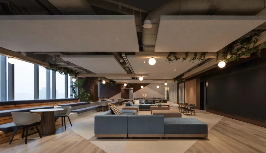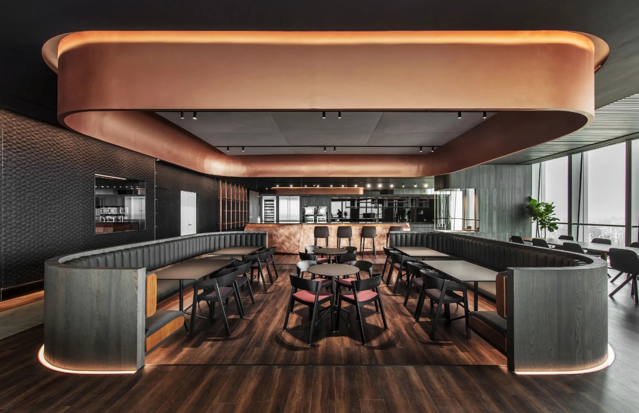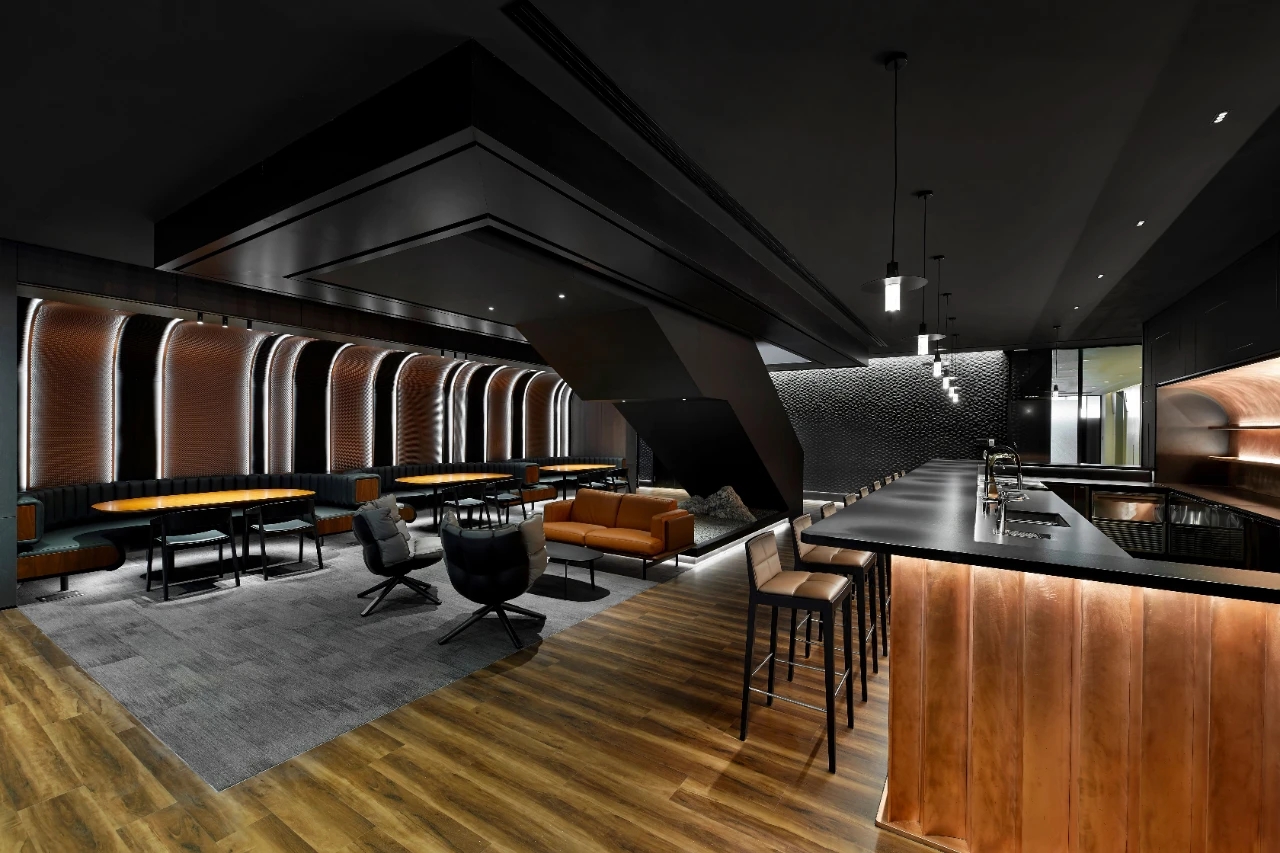除了专注的工作环境,酷拳还配备了多功能共享空间,鼓励团队成员之间的交流与合作。开放区域可一览外滩美景,是进行小组讨论、游戏娱乐或轻松对话的绝佳场所。小型观影室、电竞网吧等设施,为员工提供了丰富的休闲娱乐选择。咖啡吧台的设计灵感源自日本威士忌酒吧,提供咖啡和各种饮品,让员工在忙碌的工作之余也能感受到轻松与惬意。