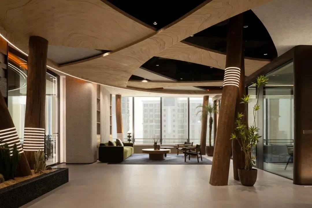 踏入前台,犹如置身于一片热带雨林。错落有致的原木树干、独特的天花造型,以及绿植的点缀,让大自然的幽静与神秘近在咫尺,身心得以放松和舒缓。