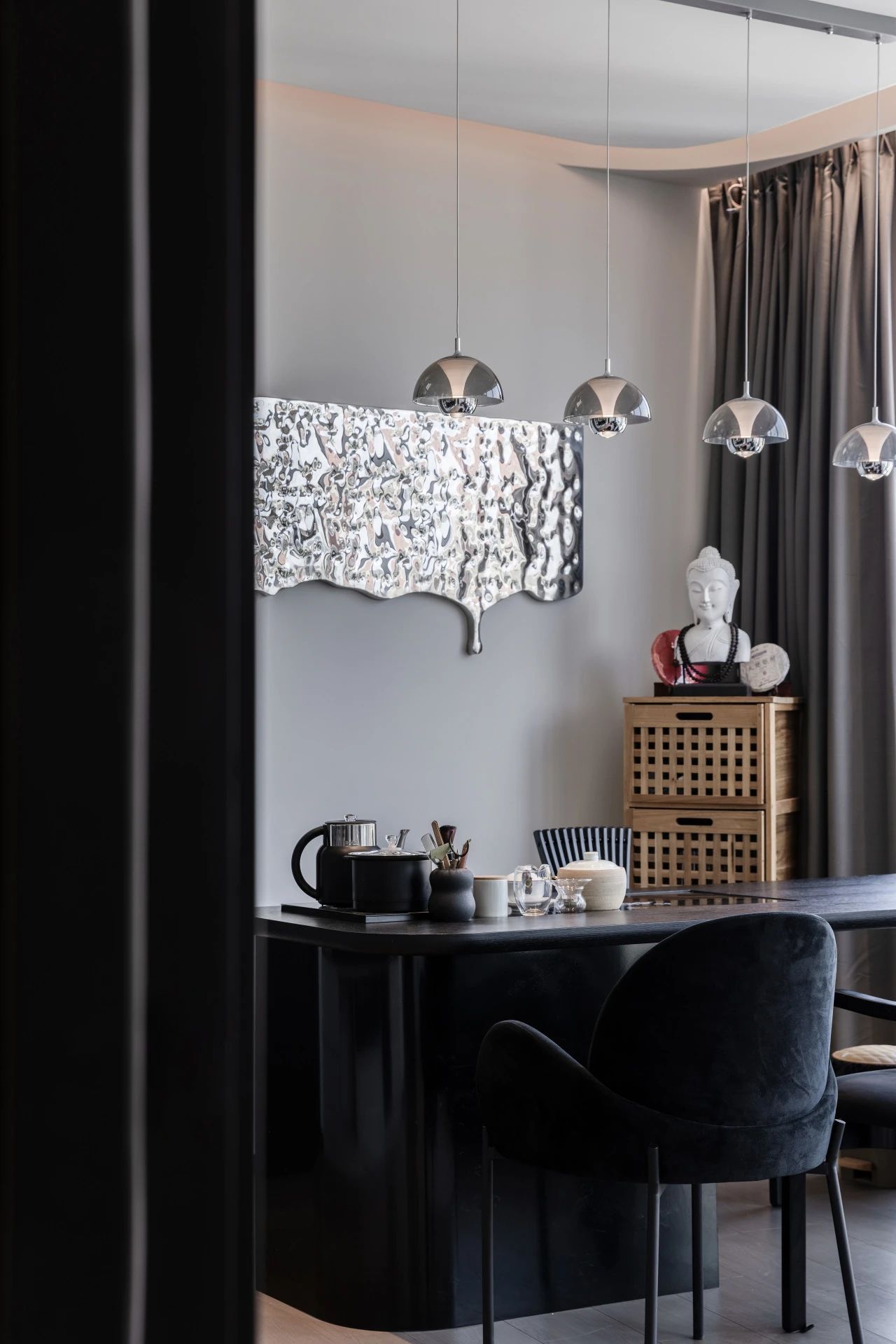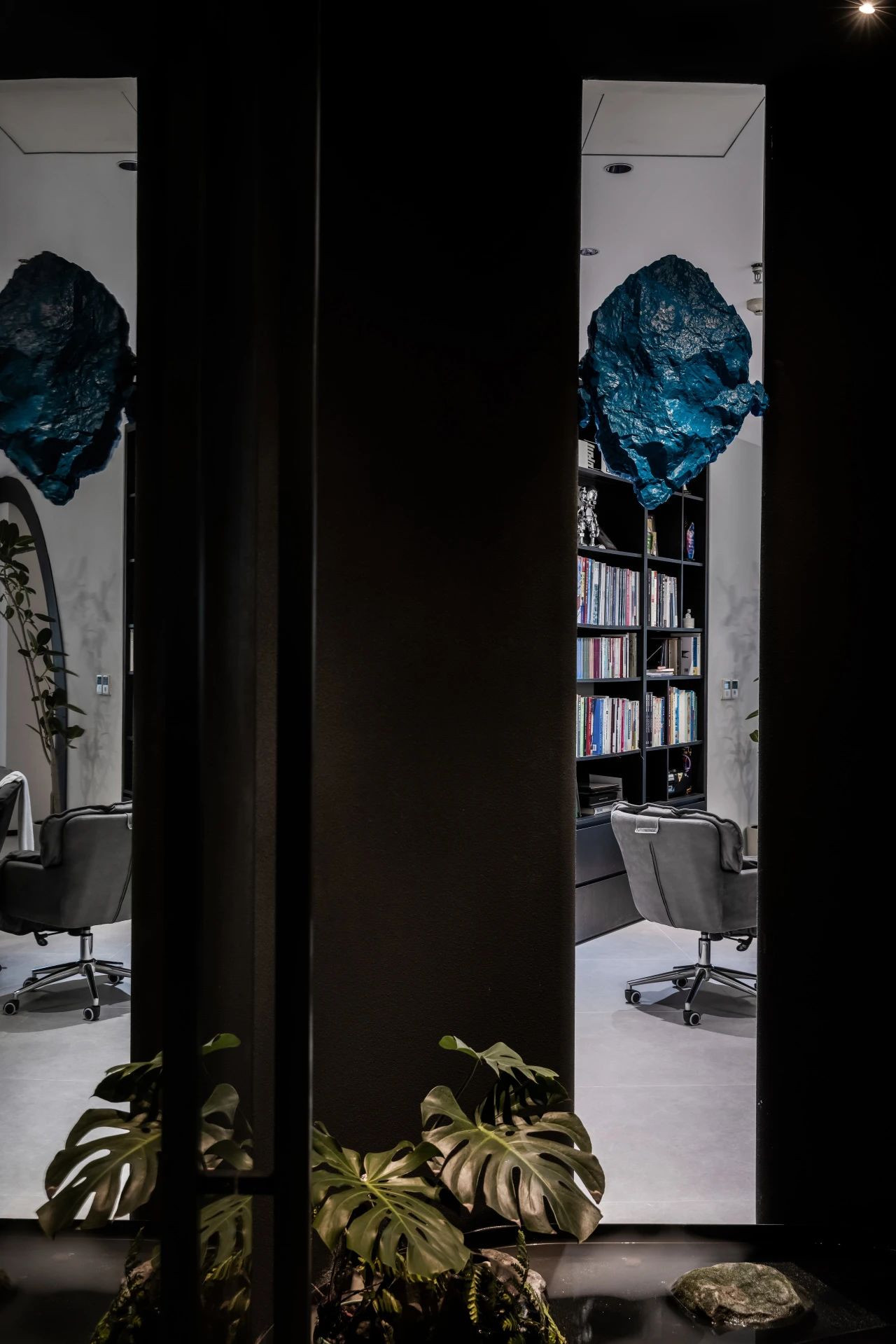 文化是我们每个项目的根本,这次的设计以中国山水意境为主脉络,表达了对中国传统文化的敬意。我们运用了手工溶洞、黑色涂料、巴山溪石、艺术挂饰、PU 石、绿植景观等装饰元素,将中国山水的元素融入到空间中,营造出一种富有水墨诗意的氛围。