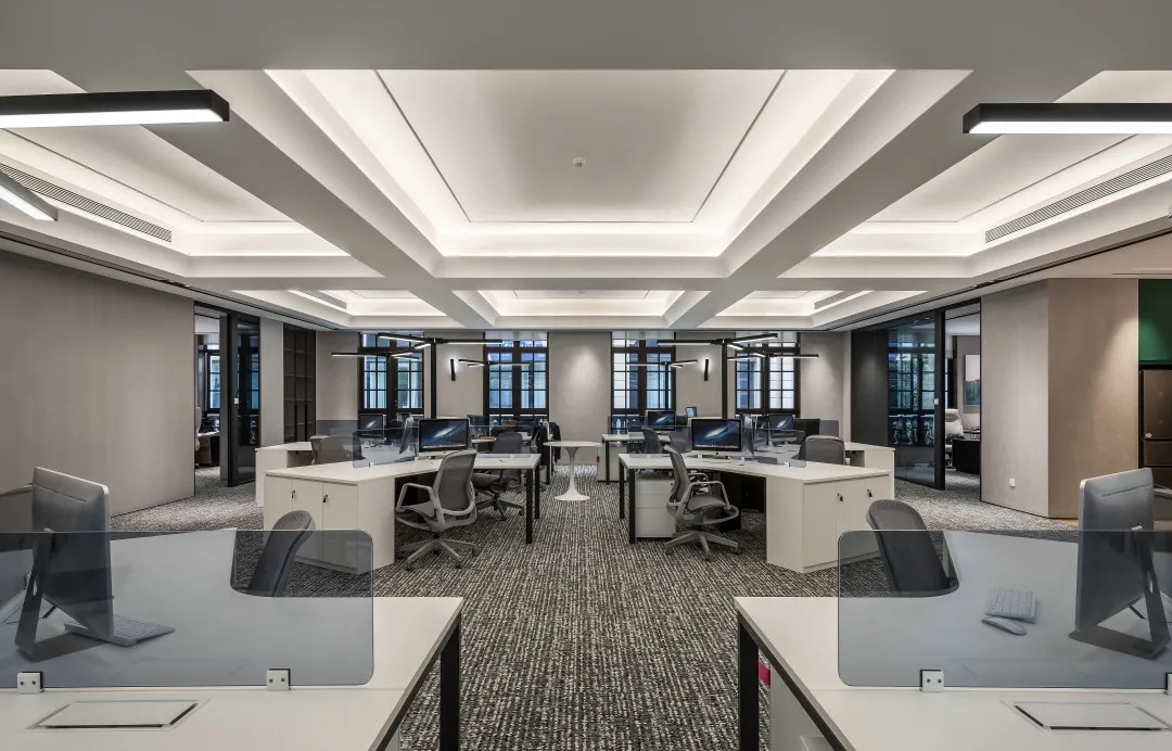 保留田字格吊顶的感性脉络,珊瑚状的办公桌椅可拆分组合多个多边形工作区,以一种更贴合现代审美的方式给员工带来新鲜感。