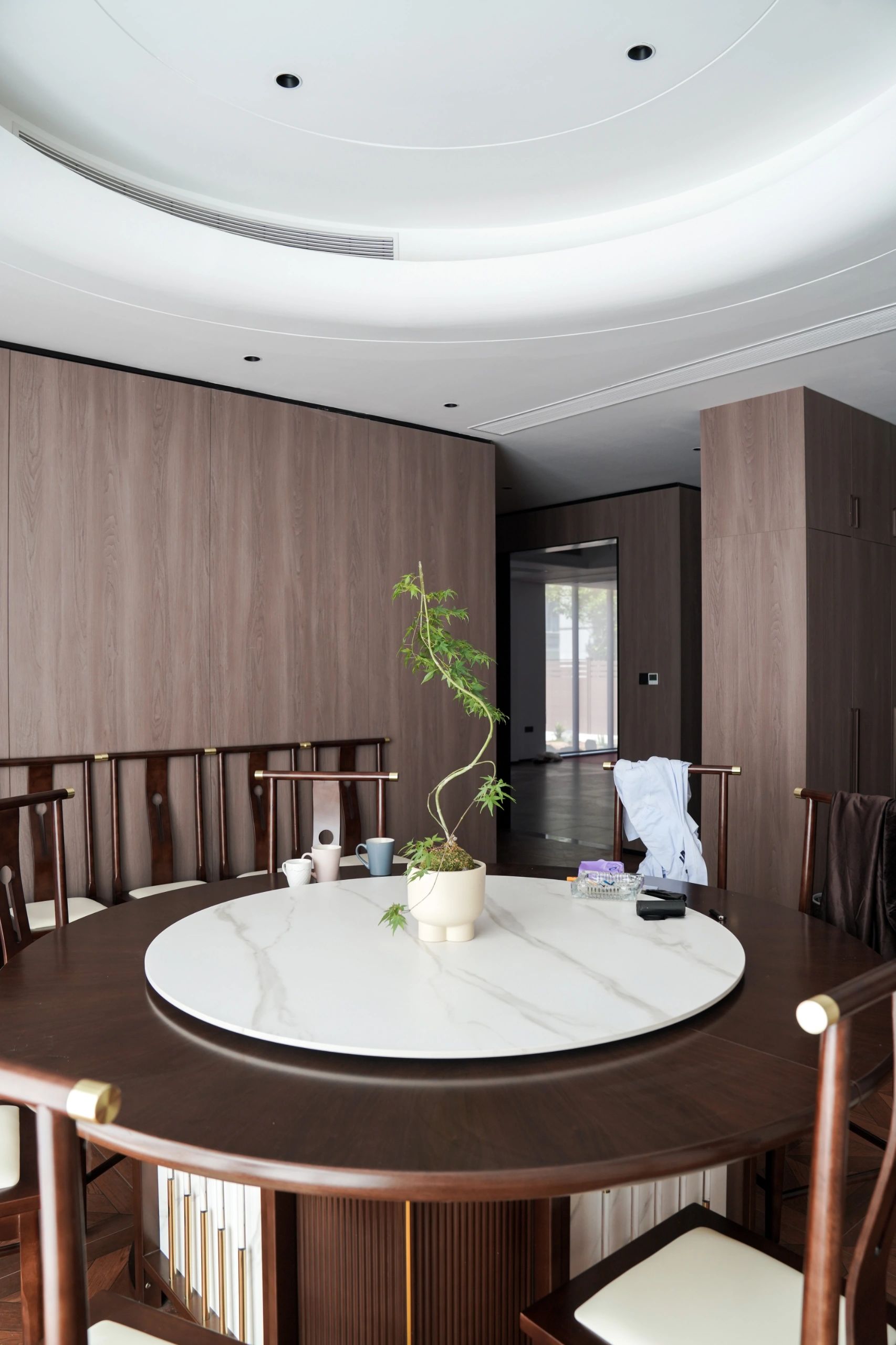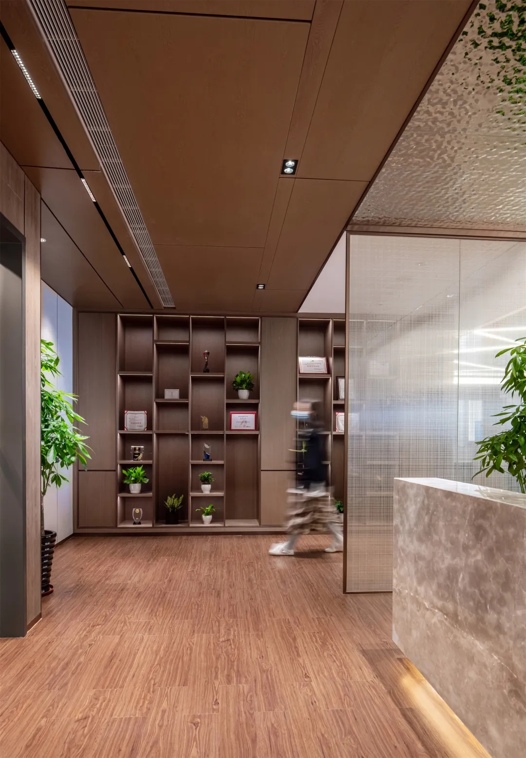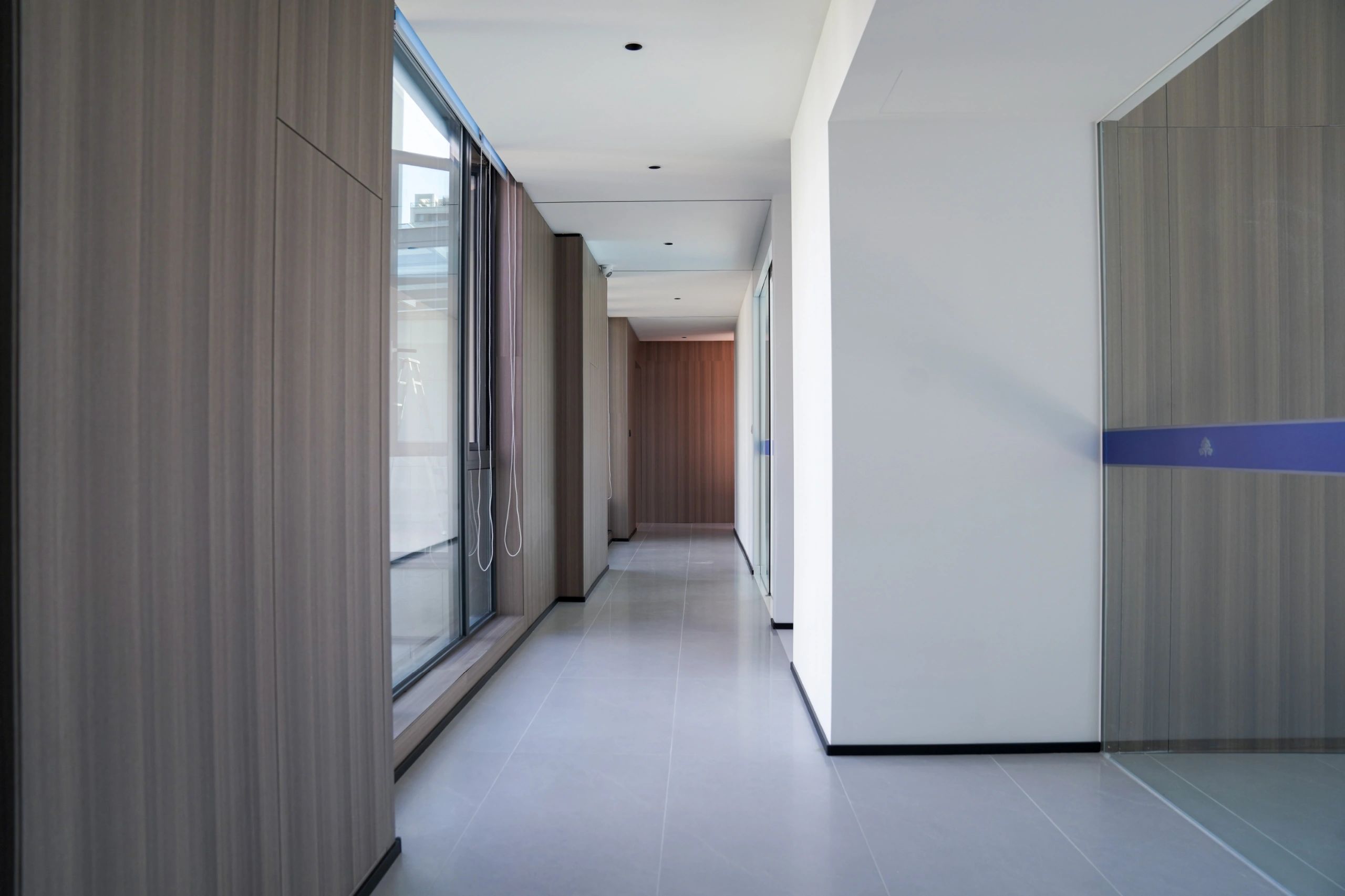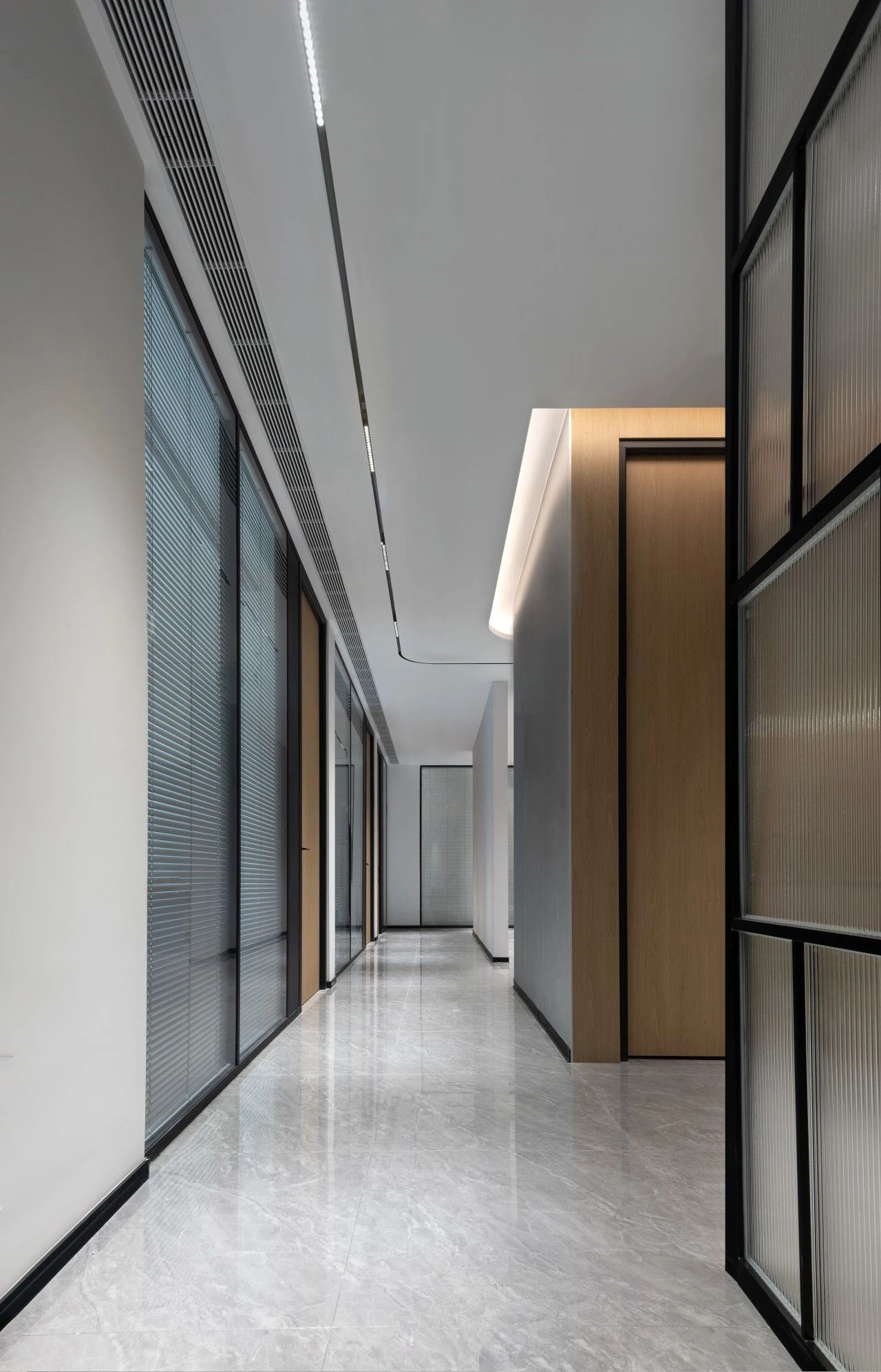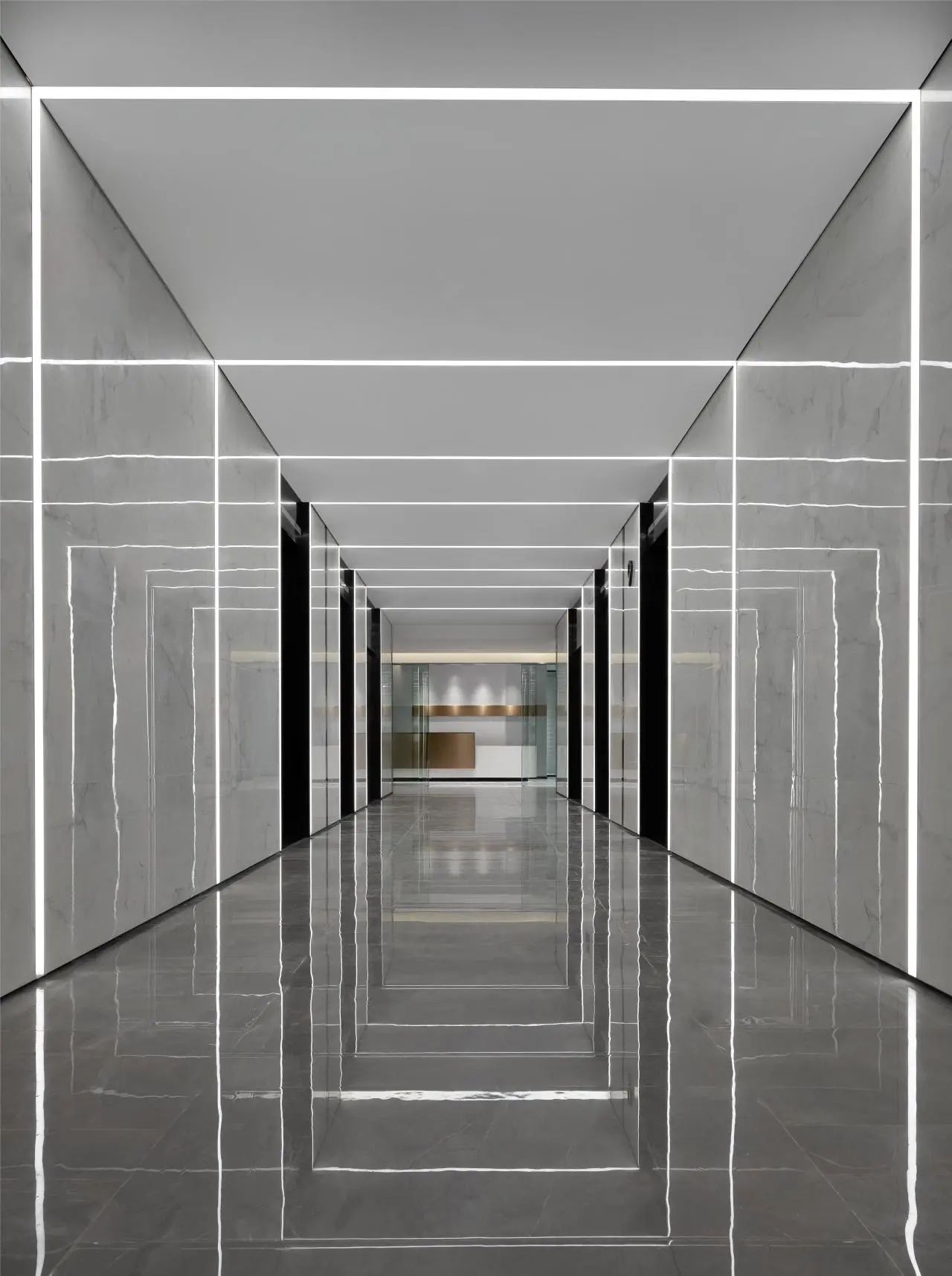 共同塑造了走廊空间的核心特质优雅的灰色大理石地面与沉稳的木饰面墙体相互呼应纹理和色彩在视觉上引发对星体表面质感的联想