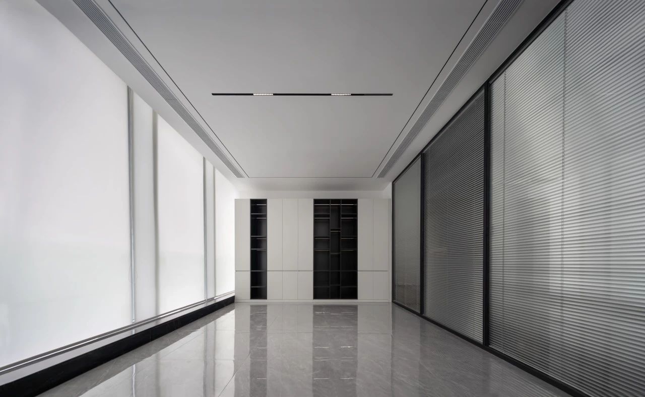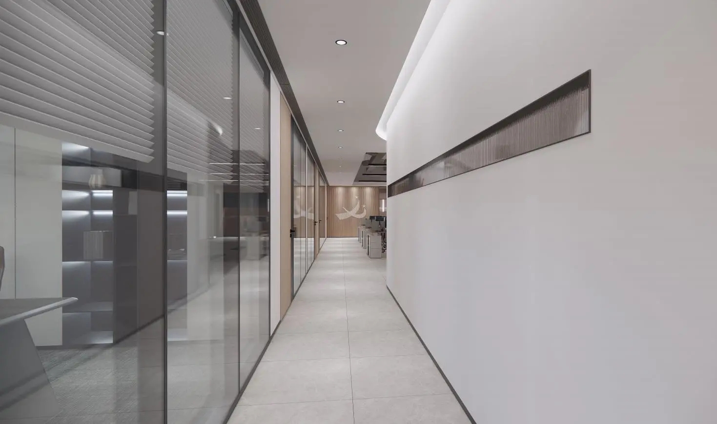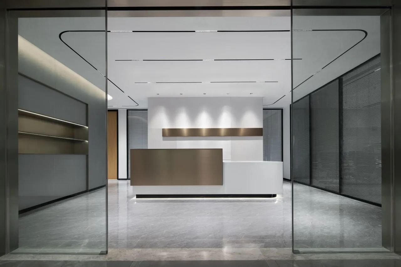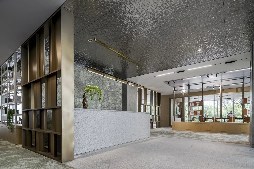 金属的冷硬与玻璃隔断的通透增加了空间扩张感让前台区域不仅是接待处也成为引导视觉探索的焦点