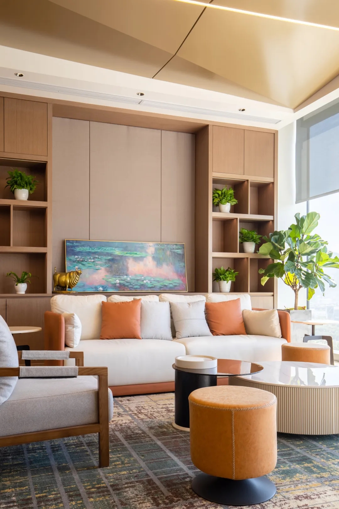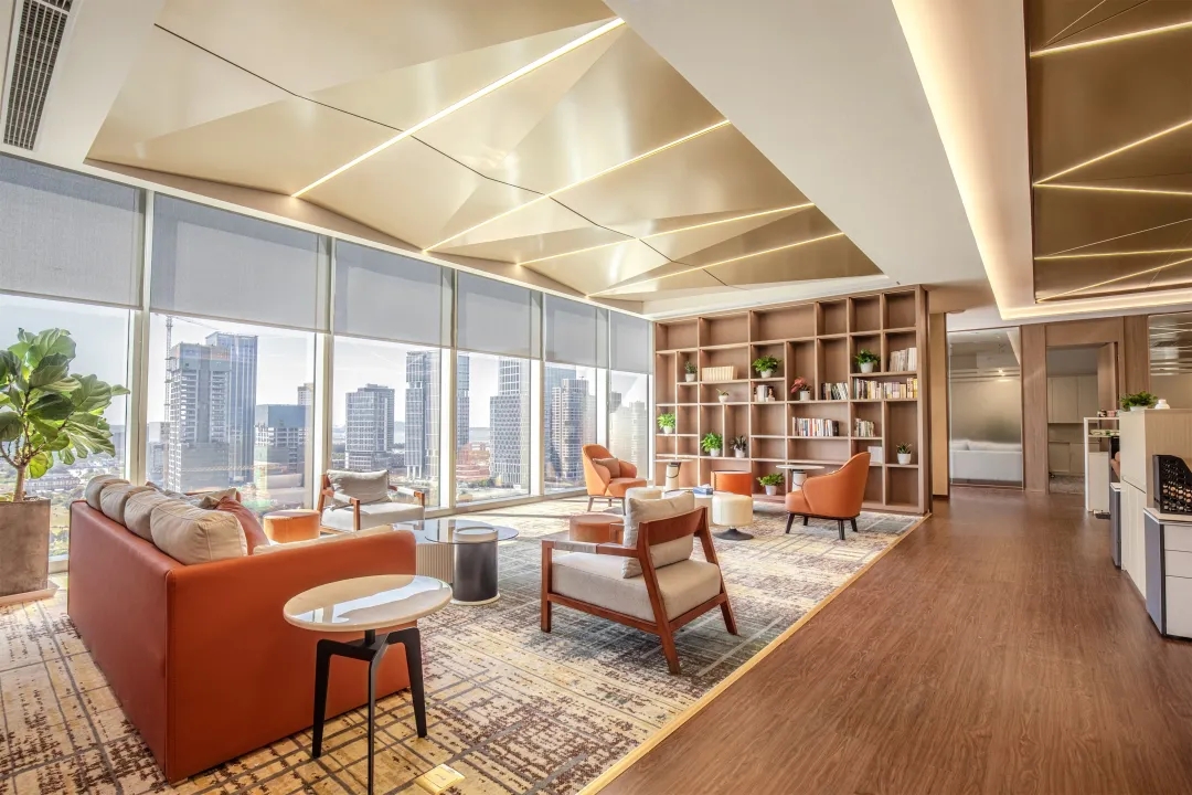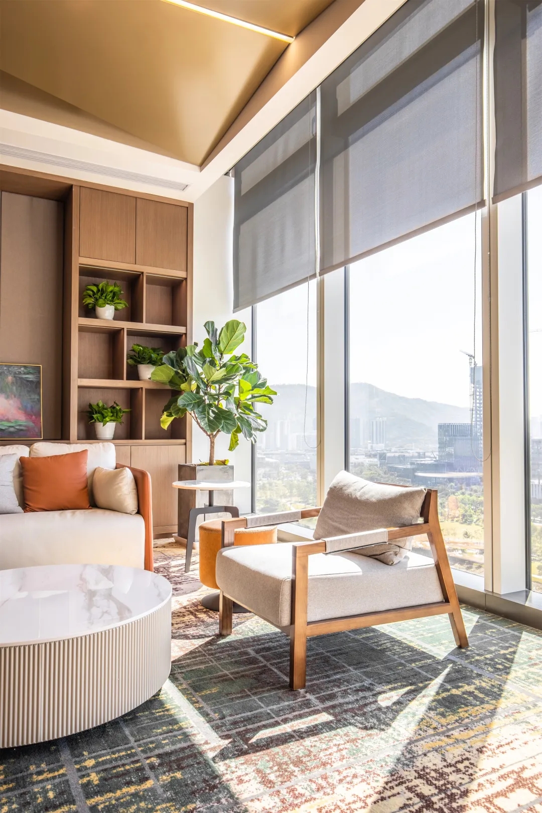 设计的目的是提供一系列大厅、现代工作区、行政会议室、开放式工作空间和横跨五座塔楼的公共空间。该设计结合了西方的影响和自然材料,创造了与周围景观的视觉联系。室内色调和材料的灵感来源于中医五行理论:水,木材,火,地球和金属。