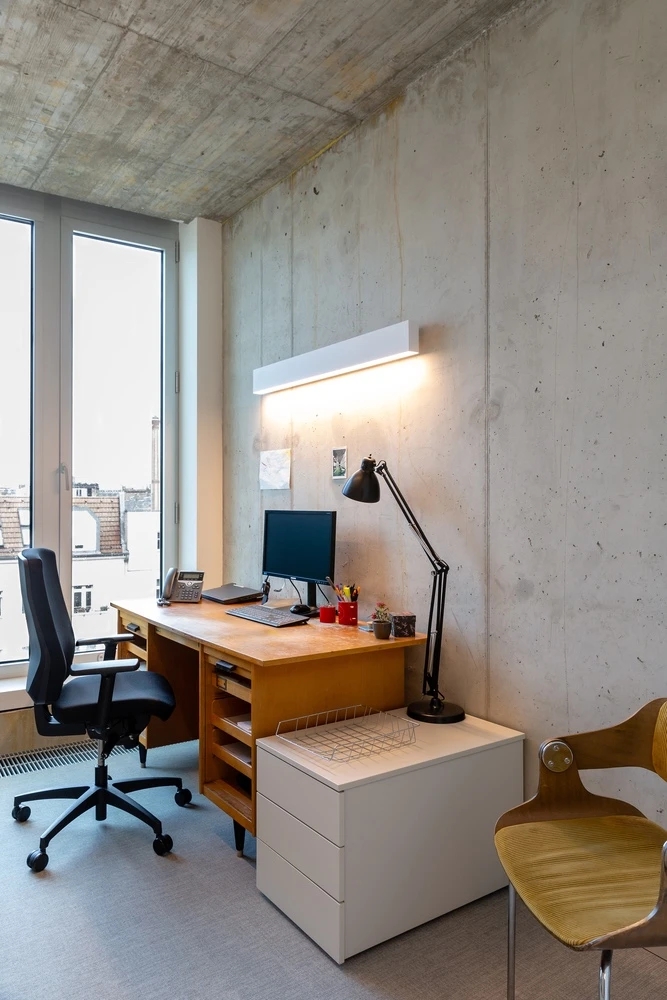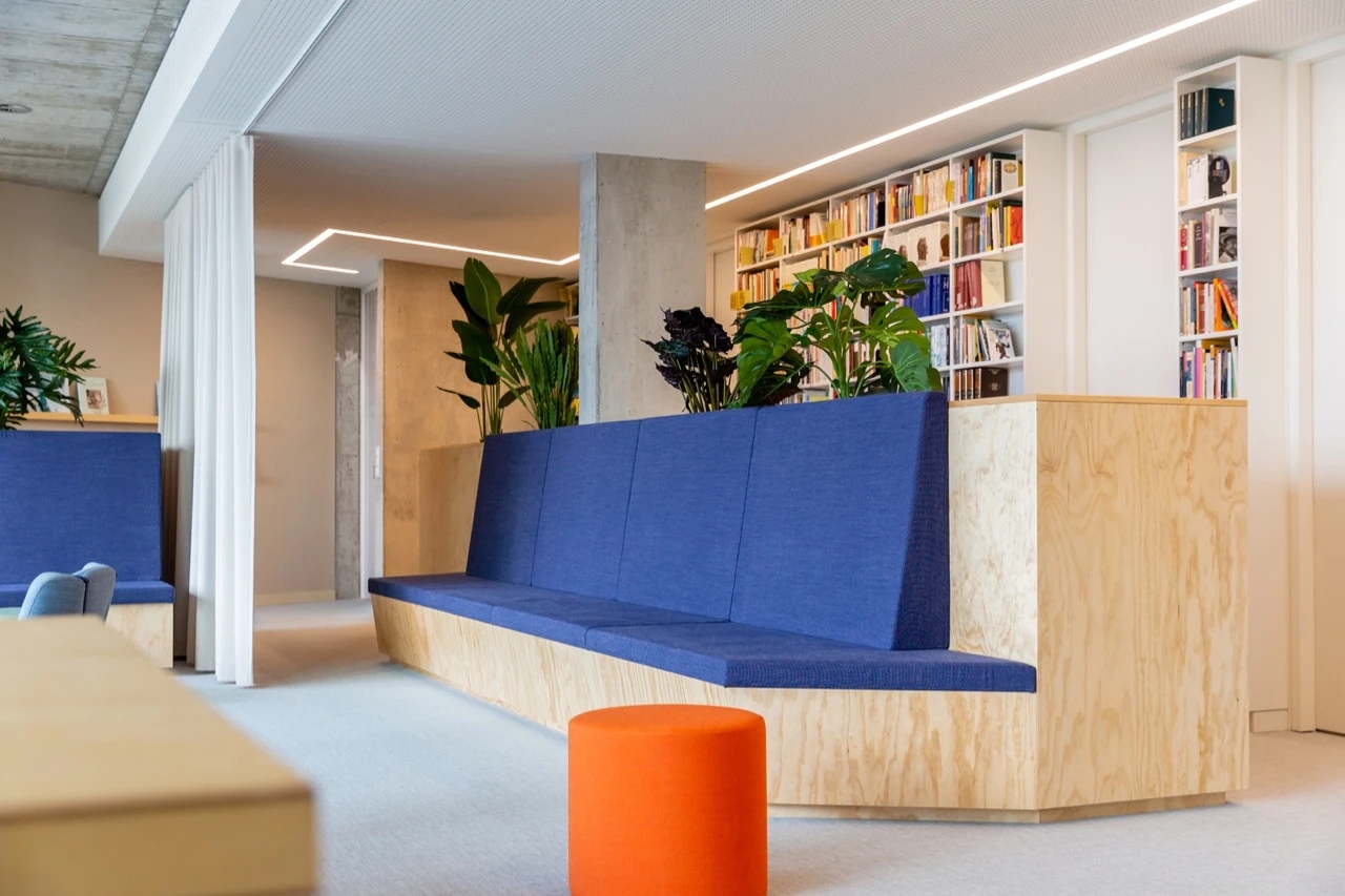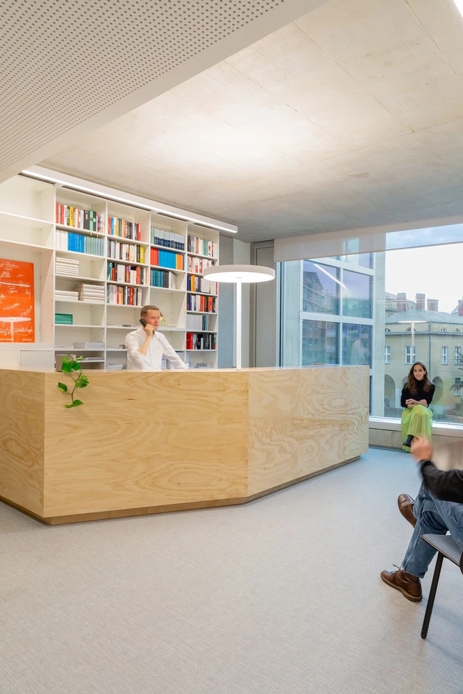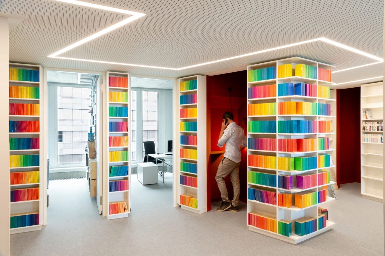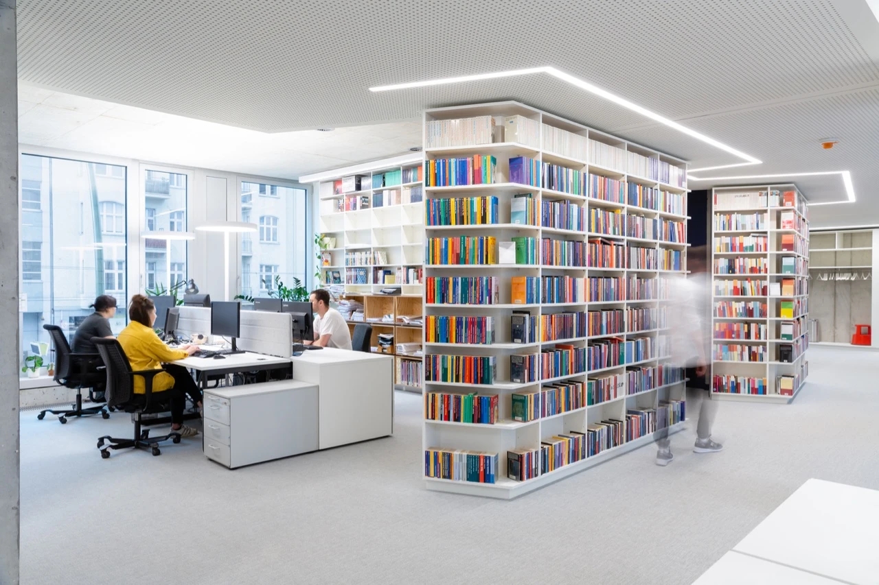 另外,建筑的锥形平面是室内设计变得更具挑战性。在项目早期,设计团队就对编辑室进行了明确的规划,编辑室必须是尽可能小和高效的空间。编辑室在最终的设计中成为有平均9平方米的空间,它们的特点是窗户几乎和地面进深一样高,这样可以使室内拥有充足的阳光而不显得狭窄,也传达一种安全感和专注感。每个编辑室的门被设计成与架子的搁板齐平,这样当门打开时,门就像消失在架子上。入口和门的设计也使房间可以打开到与大办公室相邻开放的办公室相连的空间,就像天然的海湾一样,编辑室成为大空间的延伸。办公室的大型公共区域调剂了小空间的狭窄,同时在门打开时,允许同事之间可以在一个空间交流工作。