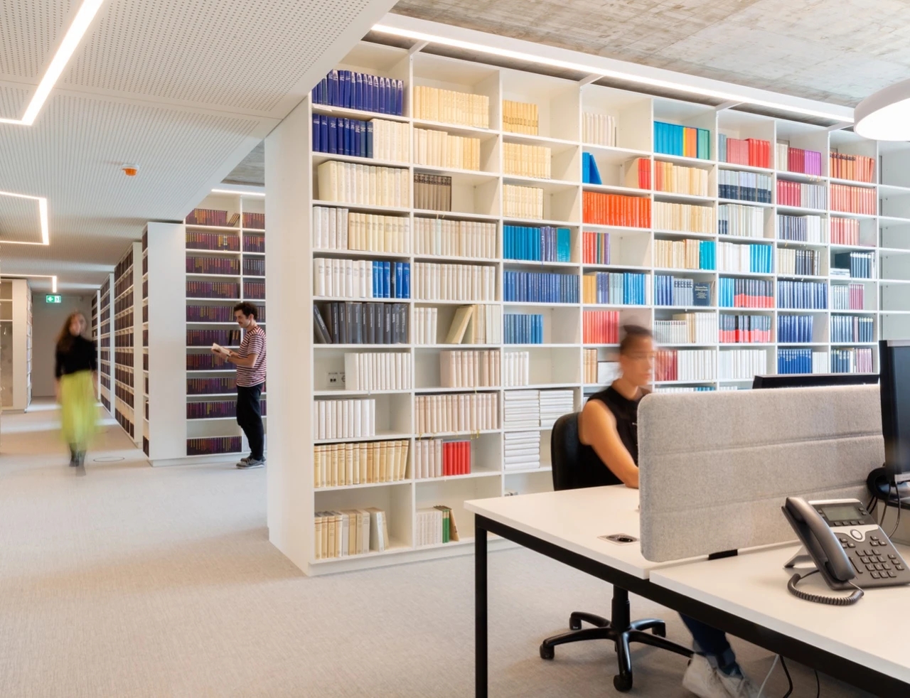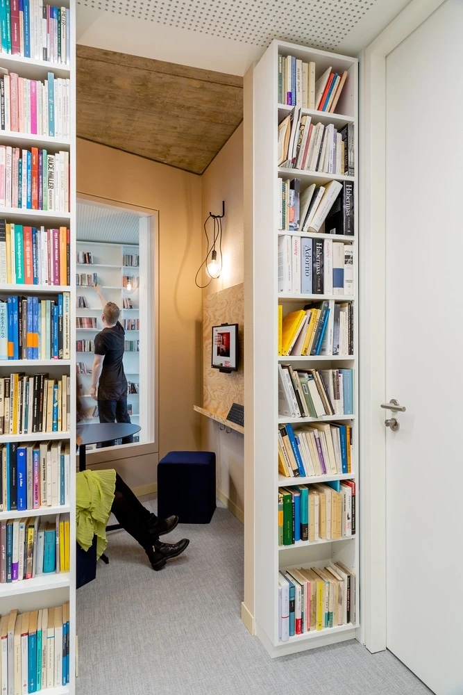 这个设计不仅提供了更多的墙面空间,从而有足够的架子以容纳藏书,同时也优化了房间面积,并创造了可供员工开会的小休息室,通信室,智库和电话亭。