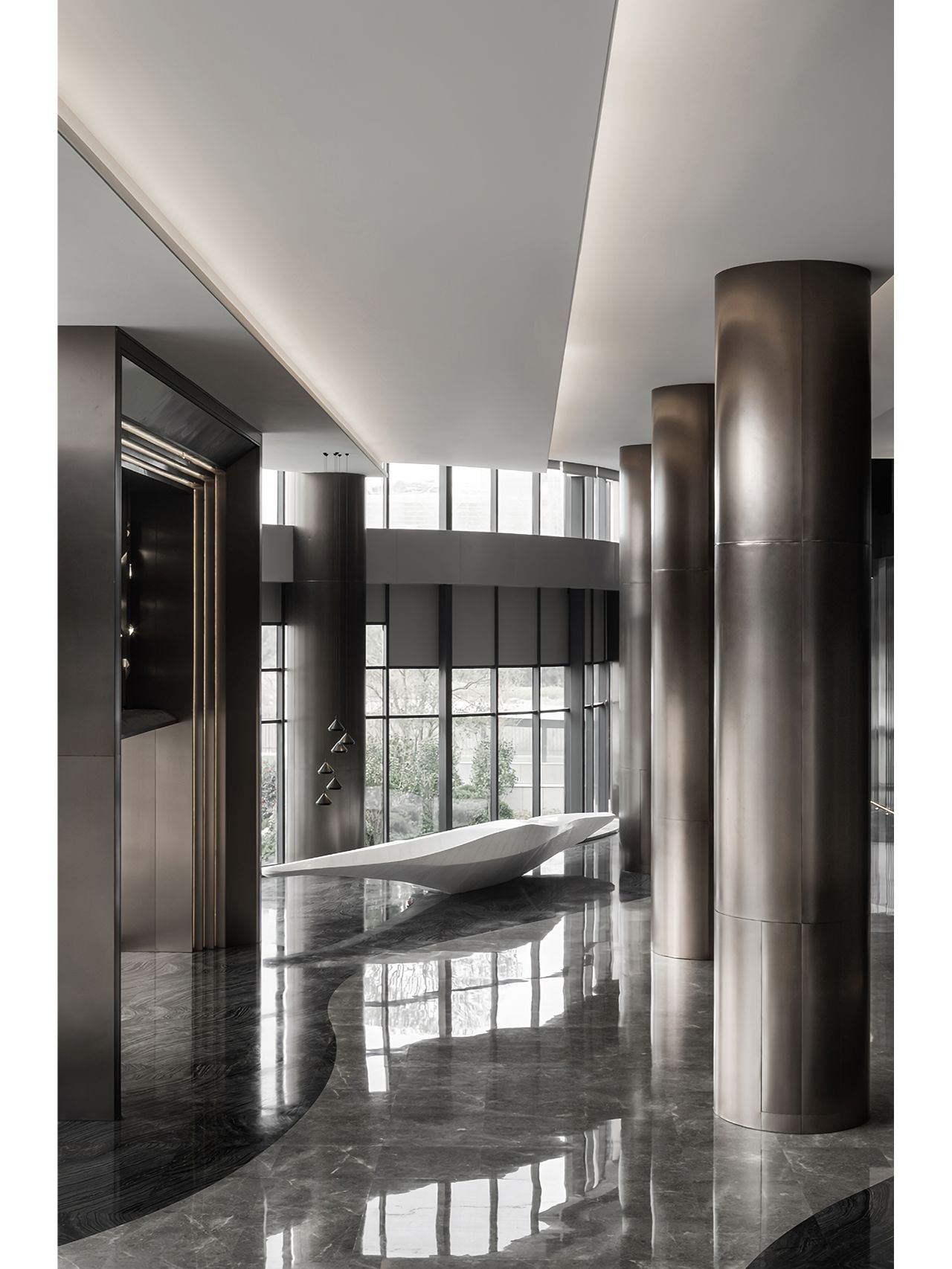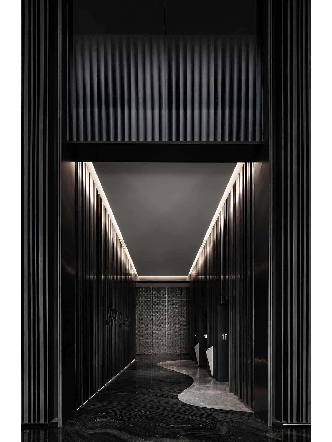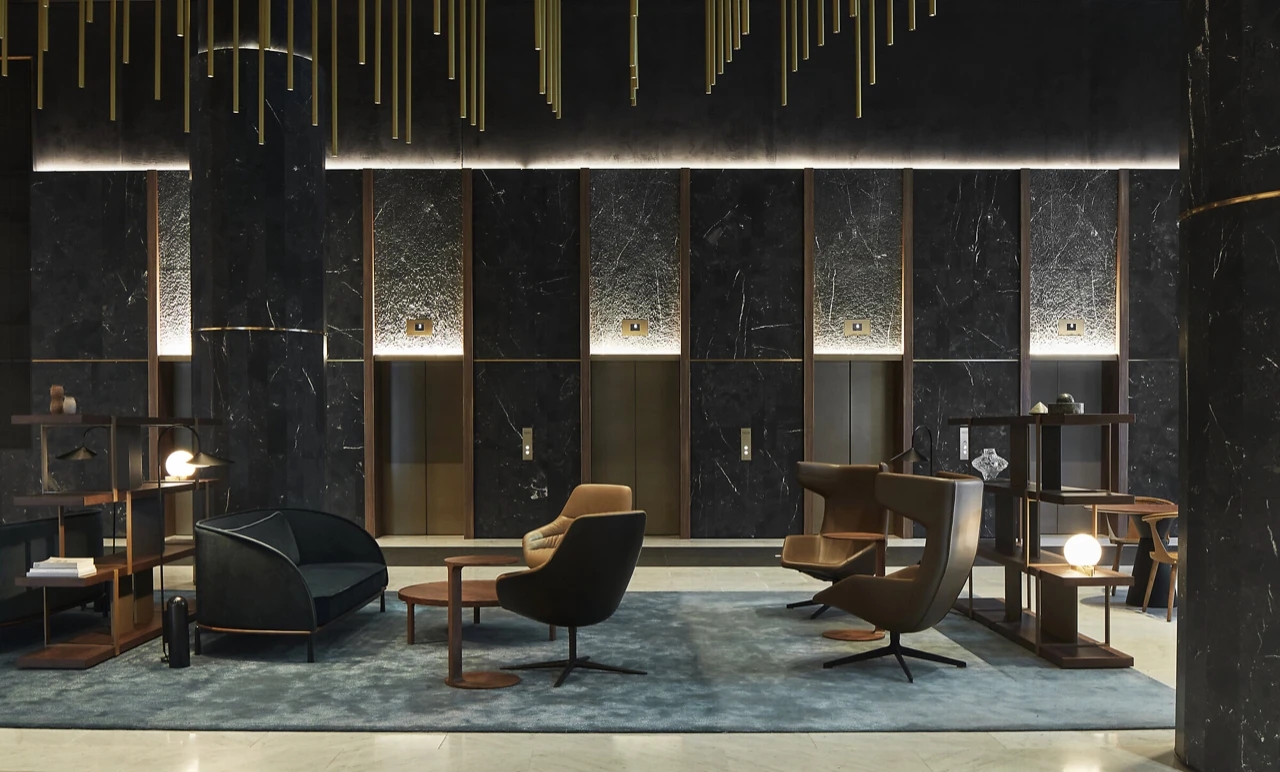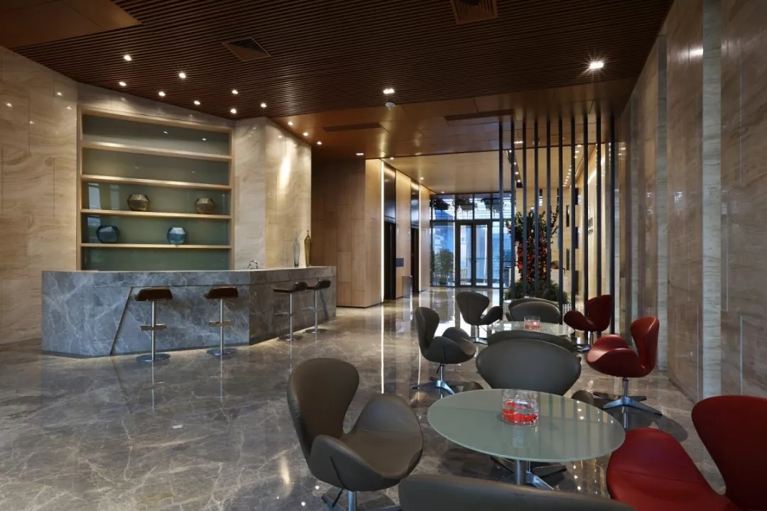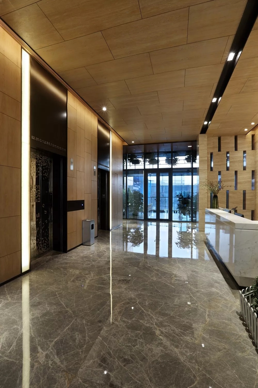 设计方案将材质、光线和艺术作为主题元素,大堂的墙面由6种材料装饰:深咖色木饰面、彩色壁画岩板、白色大理石、黑色石英岩,表面粗犷的米色石英岩以及仿旧铜板,每一种材料的运用又拥有各自独特的装饰细节:……深咖色木饰面和黑色石英岩沉稳大气,符合5A级写字楼的功能和属性。电梯墙面由米色石英岩和金属板装饰,营建出奢华感和品质感。订制的彩色岩板壁画和大堂深处的彩色玻璃墙面,赋予空间独特的艺术气质。白色大理石切割的线条模仿下垂的窗帘,使得整体空间较暗的色彩得以调节。特色天花板吊灯锚定了一个以大厅内为中心的休息室空间,定制细木工家具为使用者创造了极佳体验。在灯光方面,有意采取了低照度照明,为大堂空间营建了舒适和私密感。