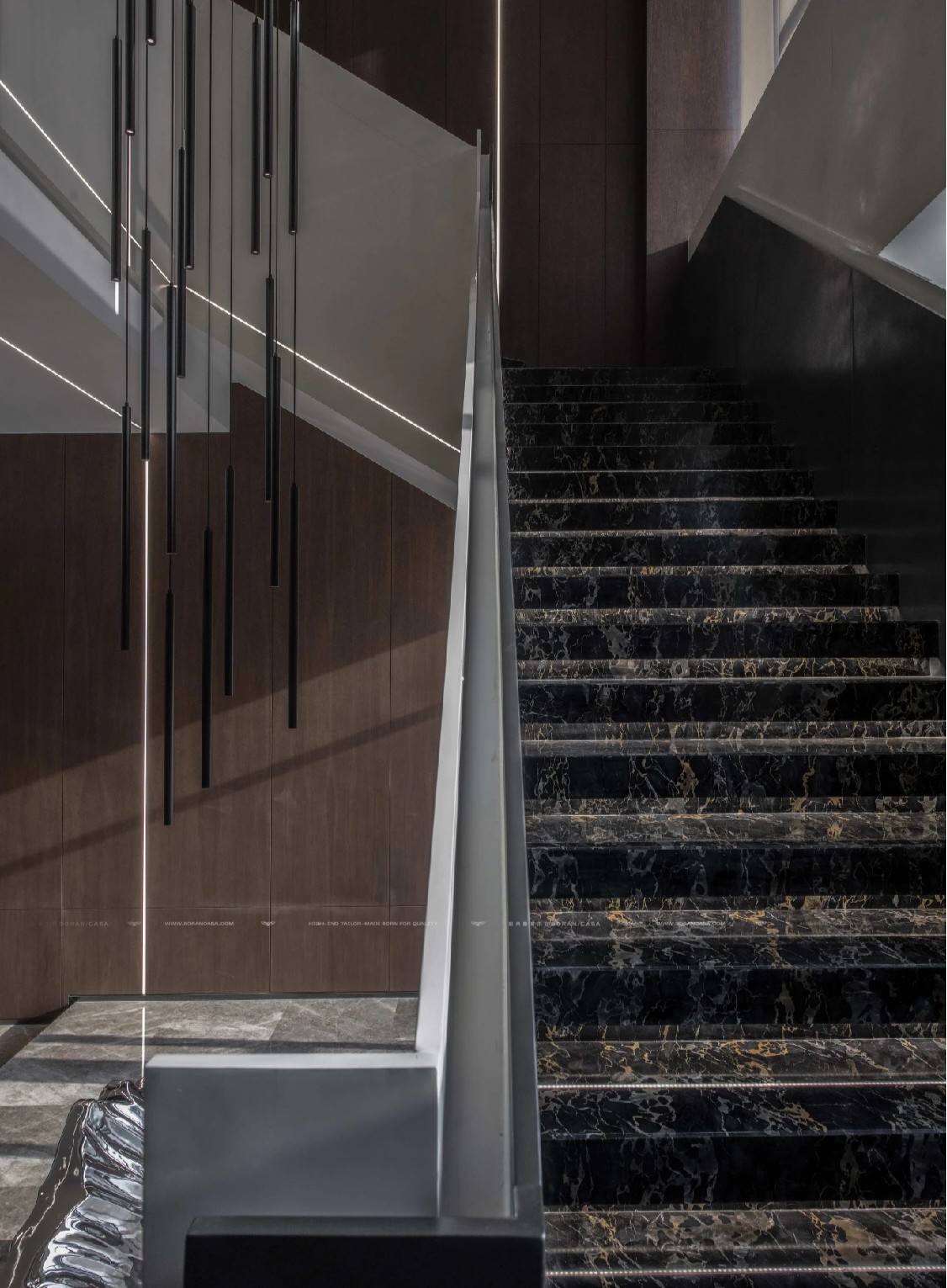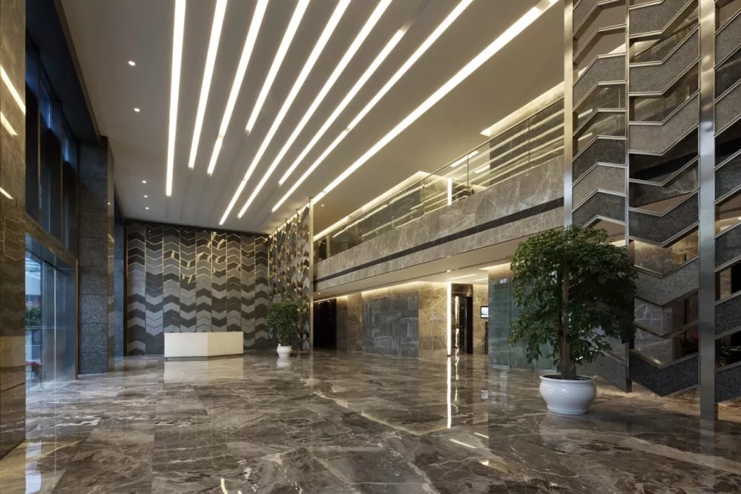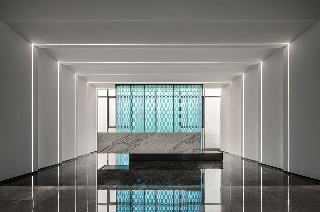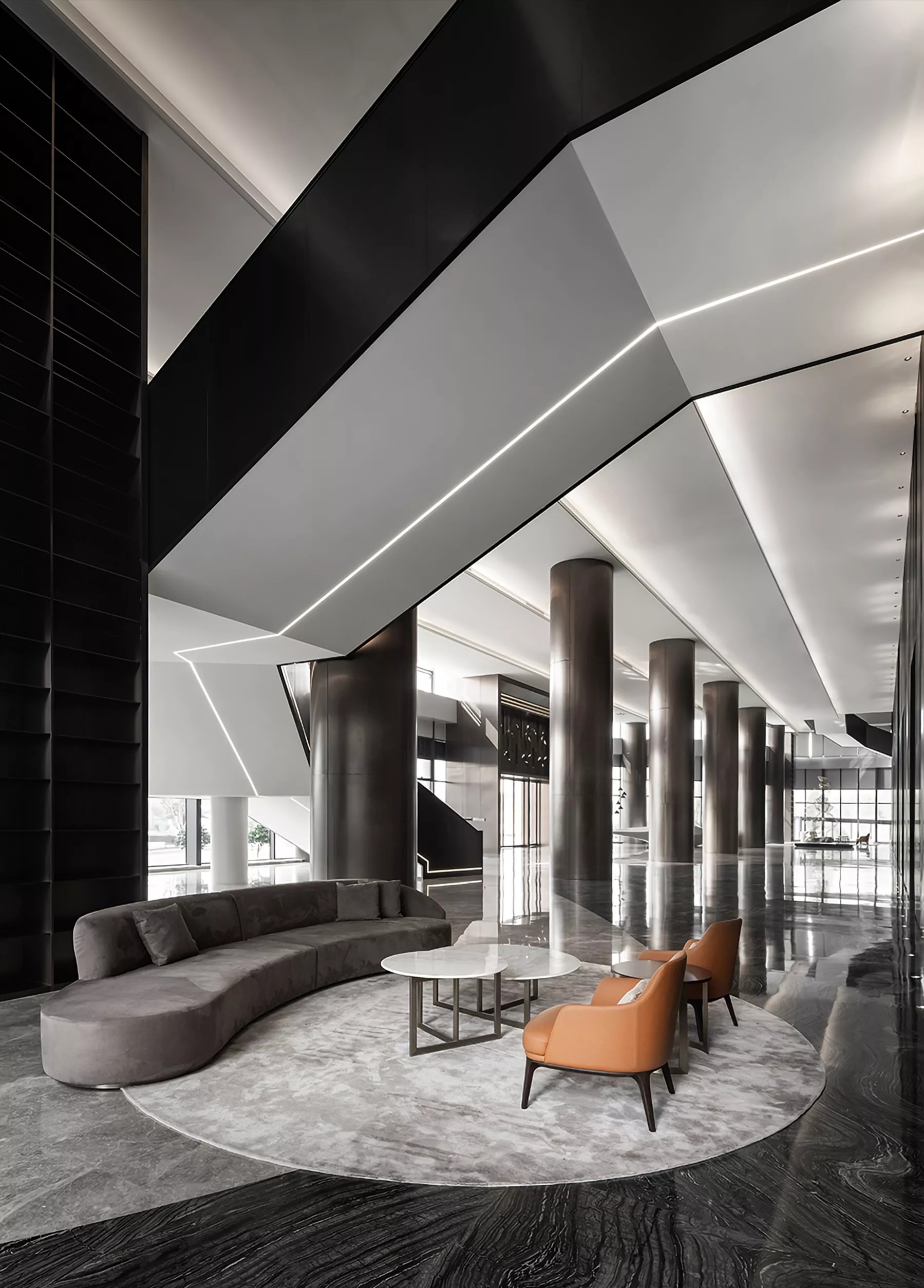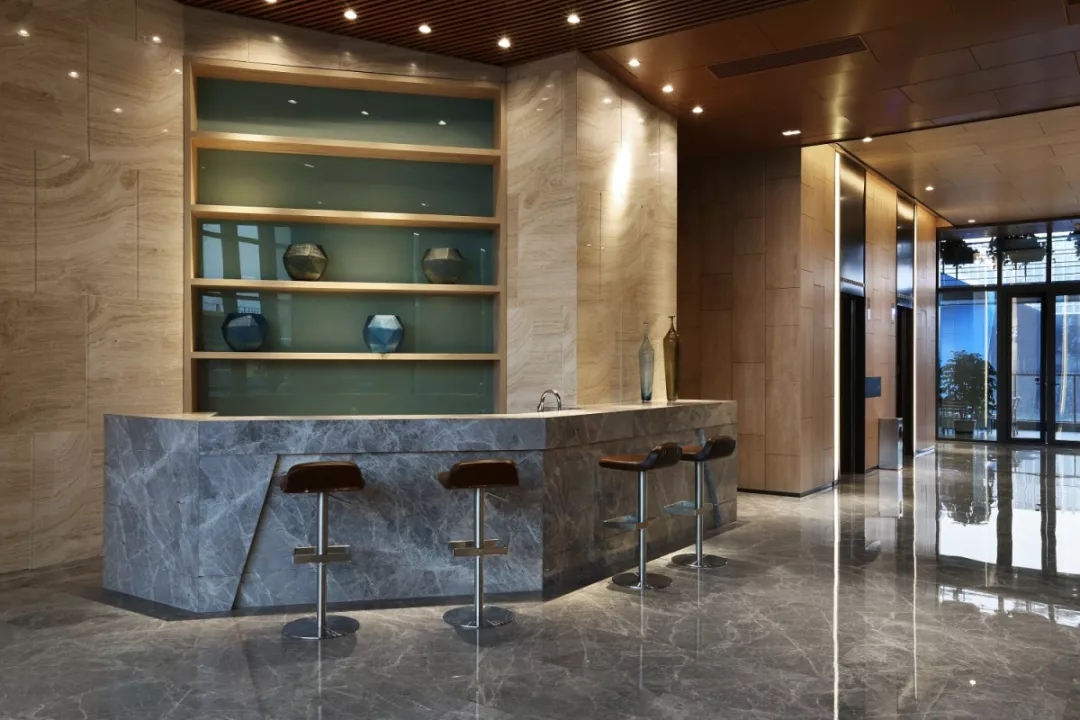 设计方案将材质、光线和艺术作为主题元素,大堂的墙面由6种材料装饰:深咖色木饰面、彩色壁画岩板、白色大理石、黑色石英岩,表面粗犷的米色石英岩以及仿旧铜板,每一种材料的运用又拥有各自独特的装饰细节:……深咖色木饰面和黑色石英岩沉稳大气,符合5A级写字楼的功能和属性。电梯墙面由米色石英岩和金属板装饰,营建出奢华感和品质感。订制的彩色岩板壁画和大堂深处的彩色玻璃墙面,赋予空间独特的艺术气质。白色大理石切割的线条模仿下垂的窗帘,使得整体空间较暗的色彩得以调节。特色天花板吊灯锚定了一个以大厅内为中心的休息室空间,定制细木工家具为使用者创造了极佳体验。在灯光方面,有意采取了低照度照明,为大堂空间营建了舒适和私密感。