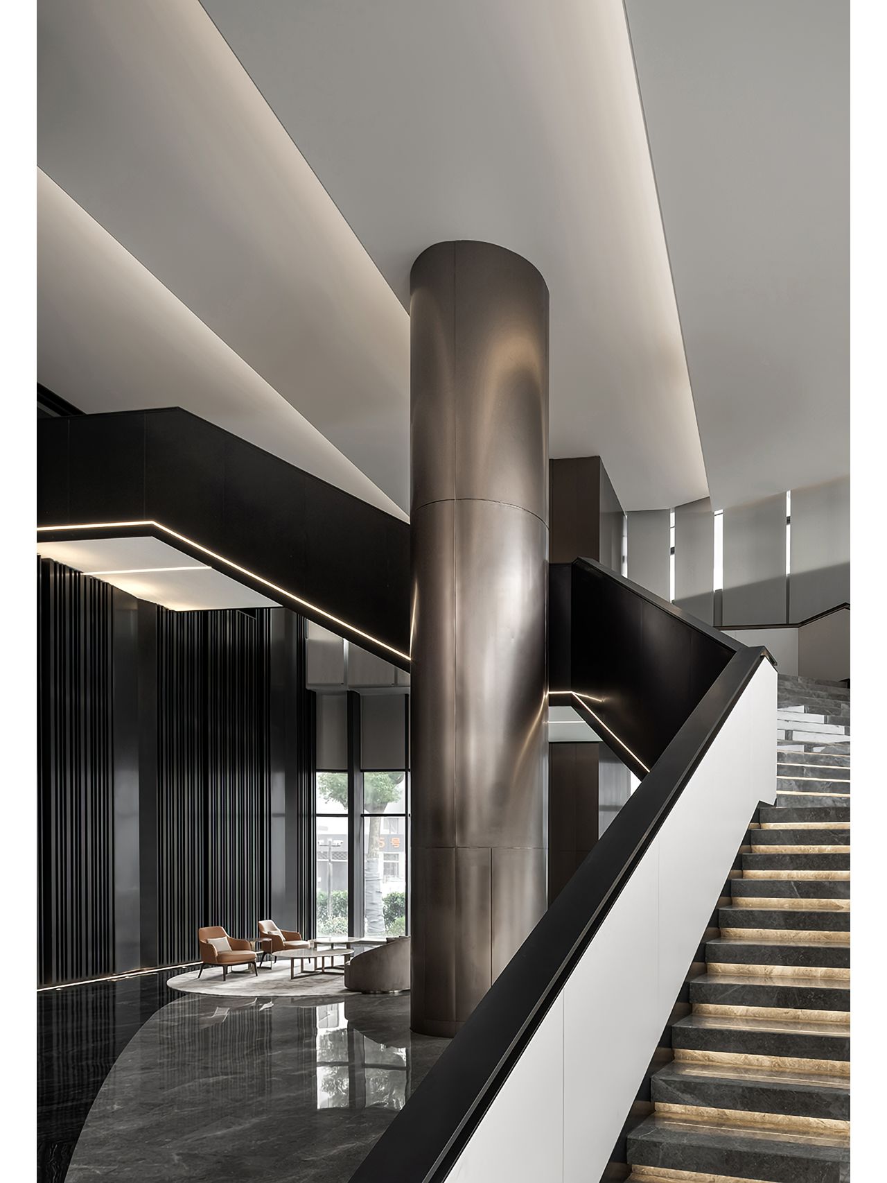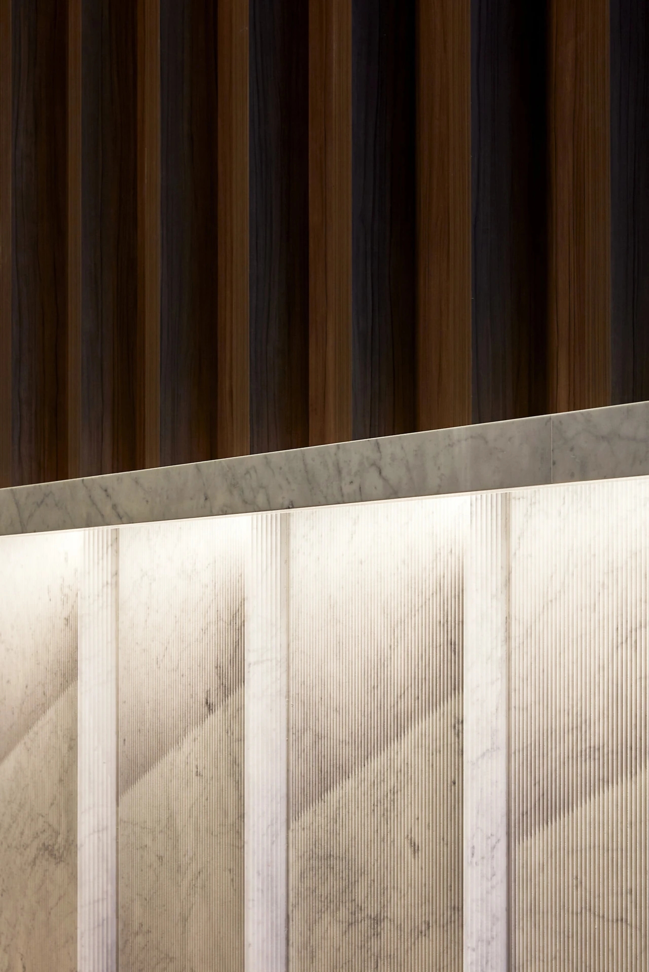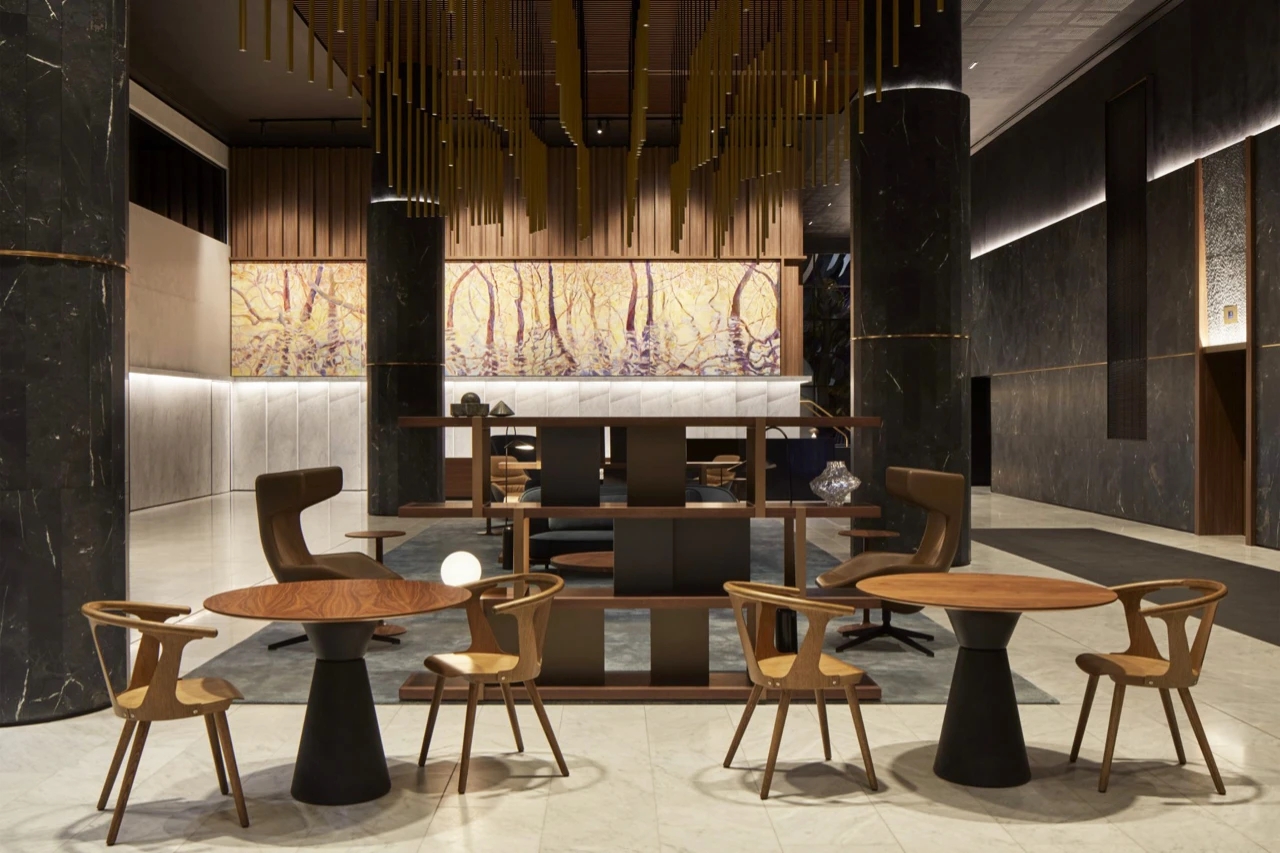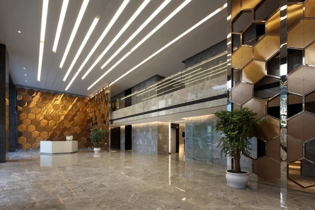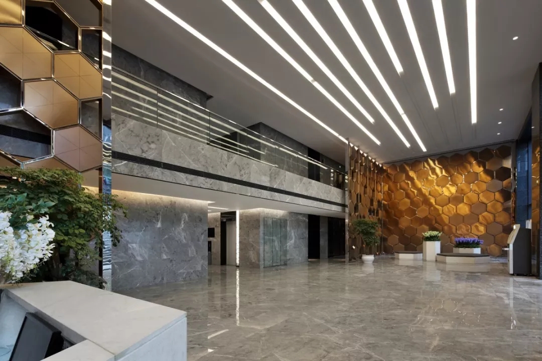 设计方案将材质、光线和艺术作为主题元素,大堂的墙面由6种材料装饰:深咖色木饰面、彩色壁画岩板、白色大理石、黑色石英岩,表面粗犷的米色石英岩以及仿旧铜板,每一种材料的运用又拥有各自独特的装饰细节:……深咖色木饰面和黑色石英岩沉稳大气,符合5A级写字楼的功能和属性。电梯墙面由米色石英岩和金属板装饰,营建出奢华感和品质感。订制的彩色岩板壁画和大堂深处的彩色玻璃墙面,赋予空间独特的艺术气质。白色大理石切割的线条模仿下垂的窗帘,使得整体空间较暗的色彩得以调节。特色天花板吊灯锚定了一个以大厅内为中心的休息室空间,定制细木工家具为使用者创造了极佳体验。在灯光方面,有意采取了低照度照明,为大堂空间营建了舒适和私密感。