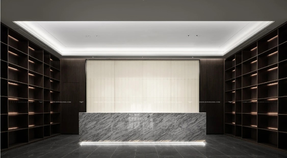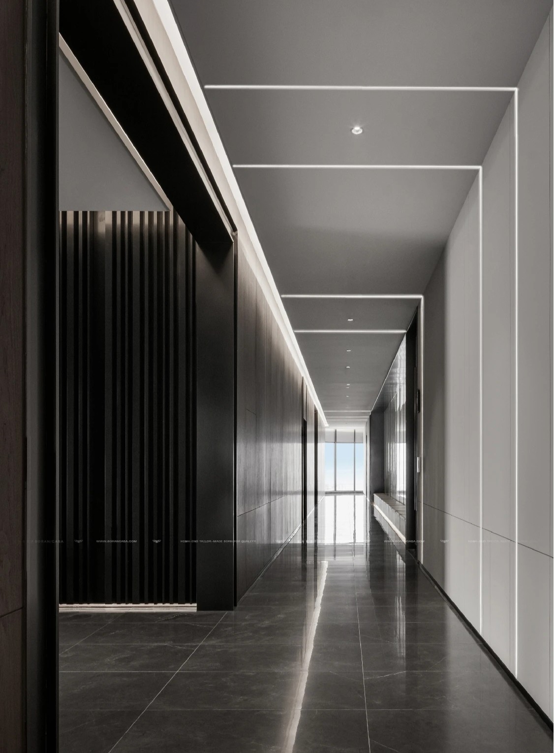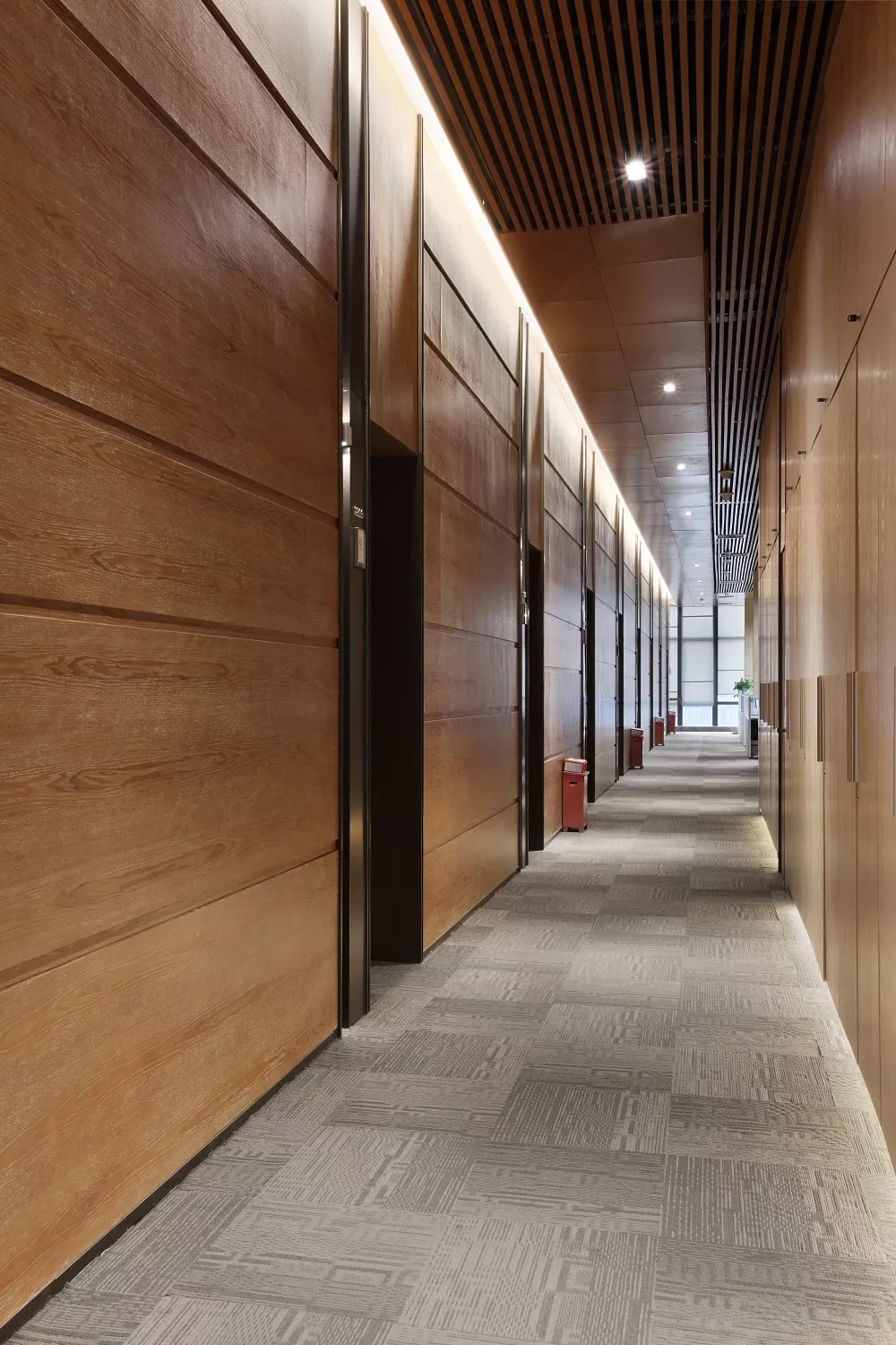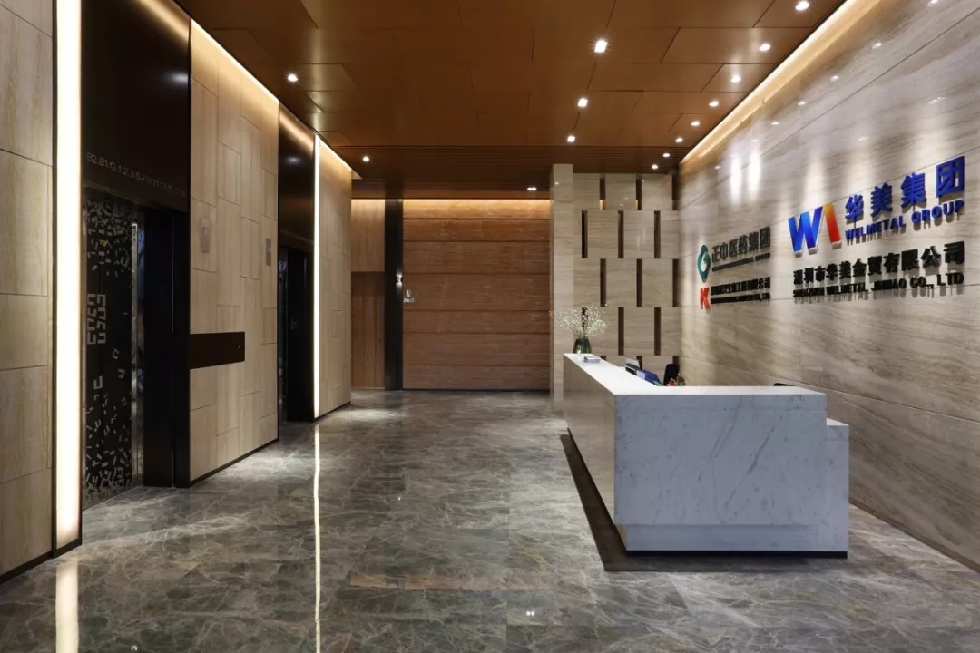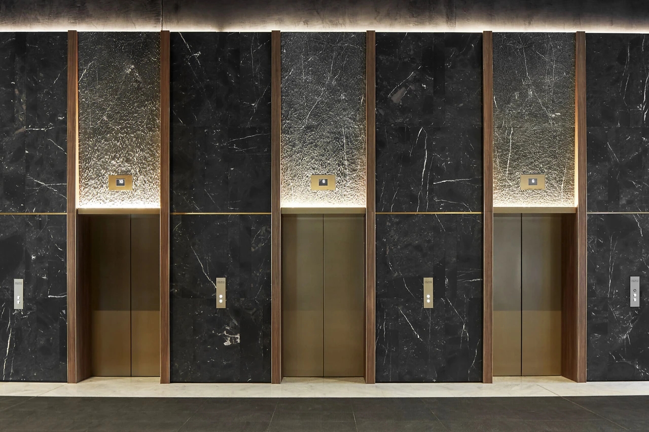 设计方案将材质、光线和艺术作为主题元素,大堂的墙面由6种材料装饰:深咖色木饰面、彩色壁画岩板、白色大理石、黑色石英岩,表面粗犷的米色石英岩以及仿旧铜板,每一种材料的运用又拥有各自独特的装饰细节:……深咖色木饰面和黑色石英岩沉稳大气,符合5A级写字楼的功能和属性。电梯墙面由米色石英岩和金属板装饰,营建出奢华感和品质感。订制的彩色岩板壁画和大堂深处的彩色玻璃墙面,赋予空间独特的艺术气质。白色大理石切割的线条模仿下垂的窗帘,使得整体空间较暗的色彩得以调节。特色天花板吊灯锚定了一个以大厅内为中心的休息室空间,定制细木工家具为使用者创造了极佳体验。在灯光方面,有意采取了低照度照明,为大堂空间营建了舒适和私密感。