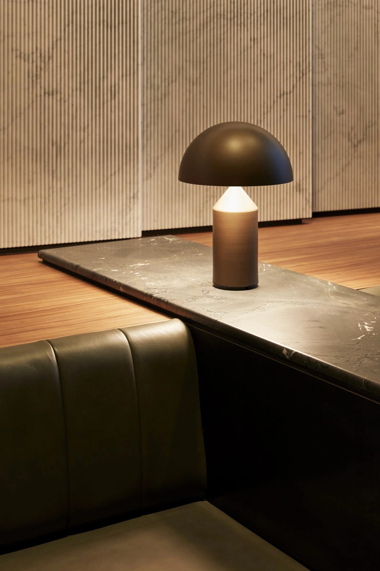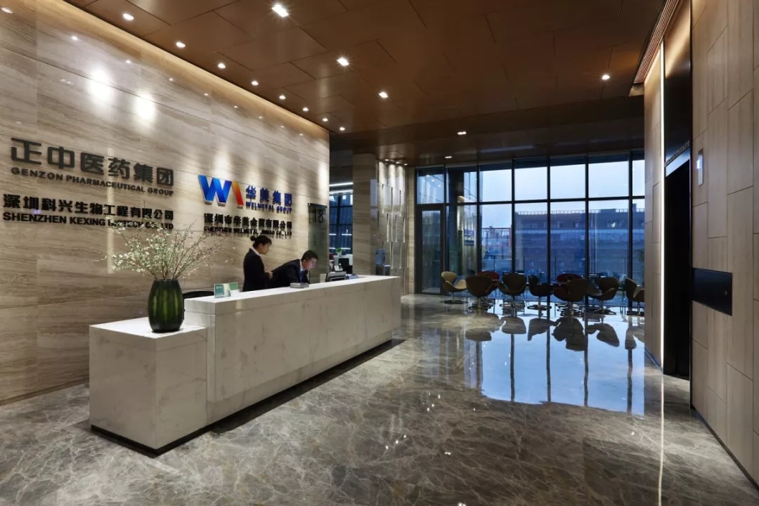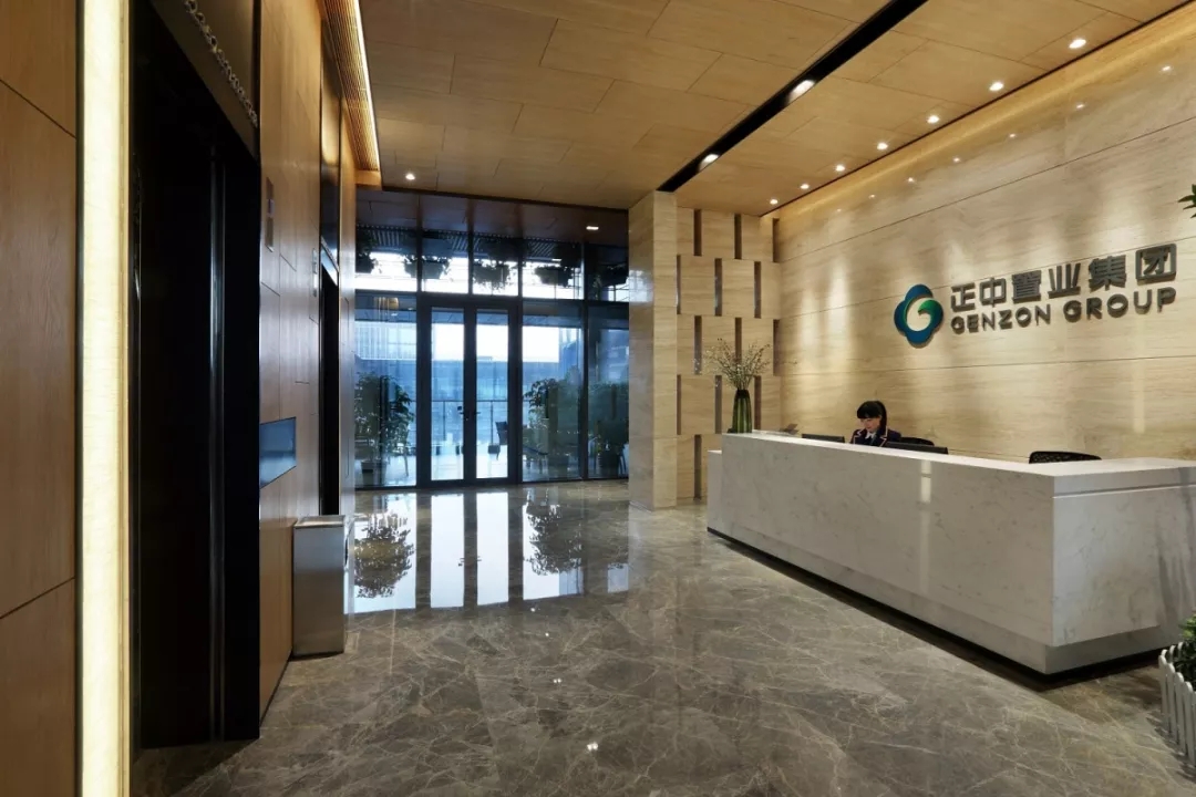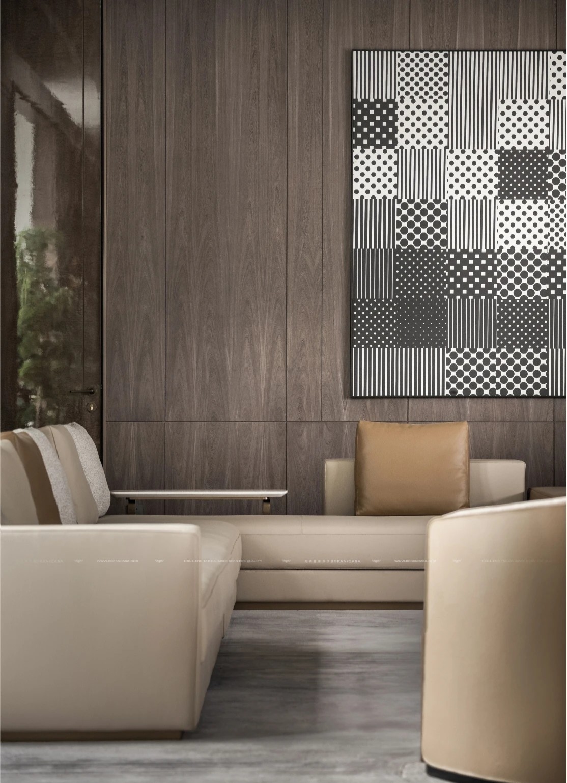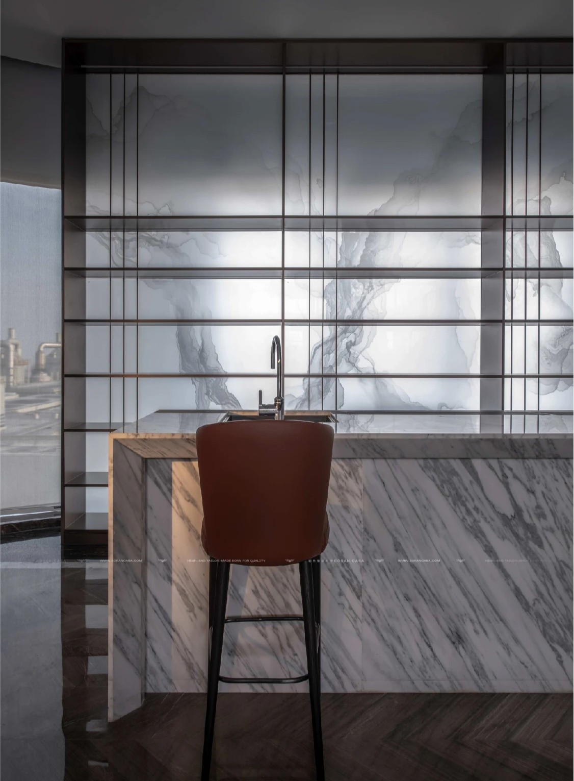 设计方案将材质、光线和艺术作为主题元素,大堂的墙面由6种材料装饰:深咖色木饰面、彩色壁画岩板、白色大理石、黑色石英岩,表面粗犷的米色石英岩以及仿旧铜板,每一种材料的运用又拥有各自独特的装饰细节:……深咖色木饰面和黑色石英岩沉稳大气,符合5A级写字楼的功能和属性。电梯墙面由米色石英岩和金属板装饰,营建出奢华感和品质感。订制的彩色岩板壁画和大堂深处的彩色玻璃墙面,赋予空间独特的艺术气质。白色大理石切割的线条模仿下垂的窗帘,使得整体空间较暗的色彩得以调节。特色天花板吊灯锚定了一个以大厅内为中心的休息室空间,定制细木工家具为使用者创造了极佳体验。在灯光方面,有意采取了低照度照明,为大堂空间营建了舒适和私密感。