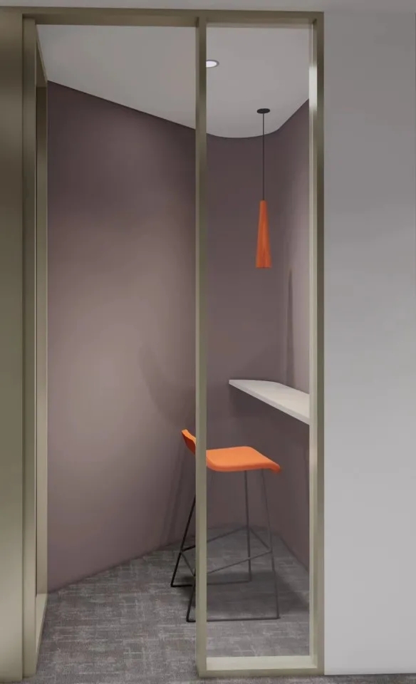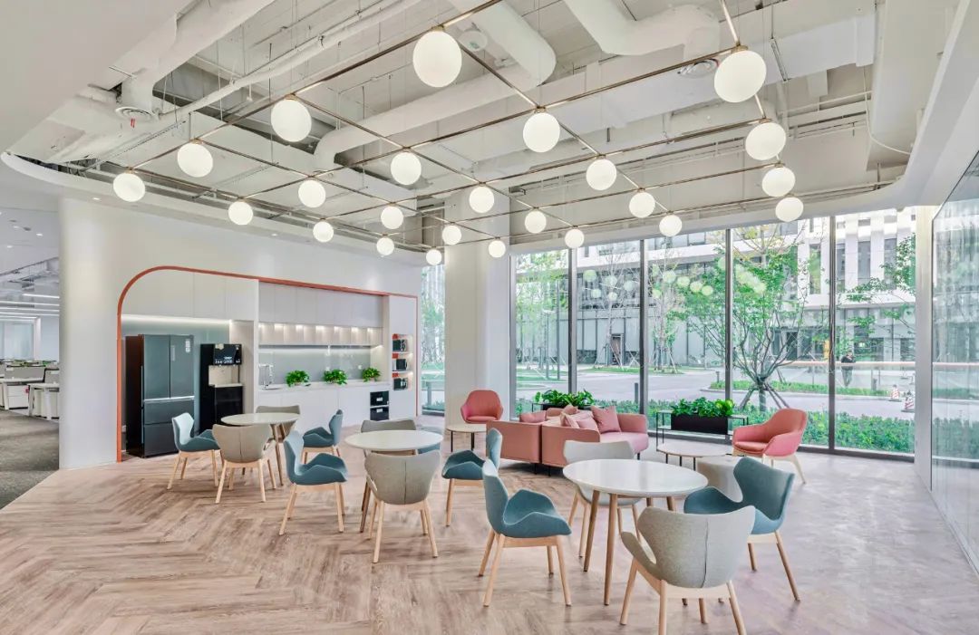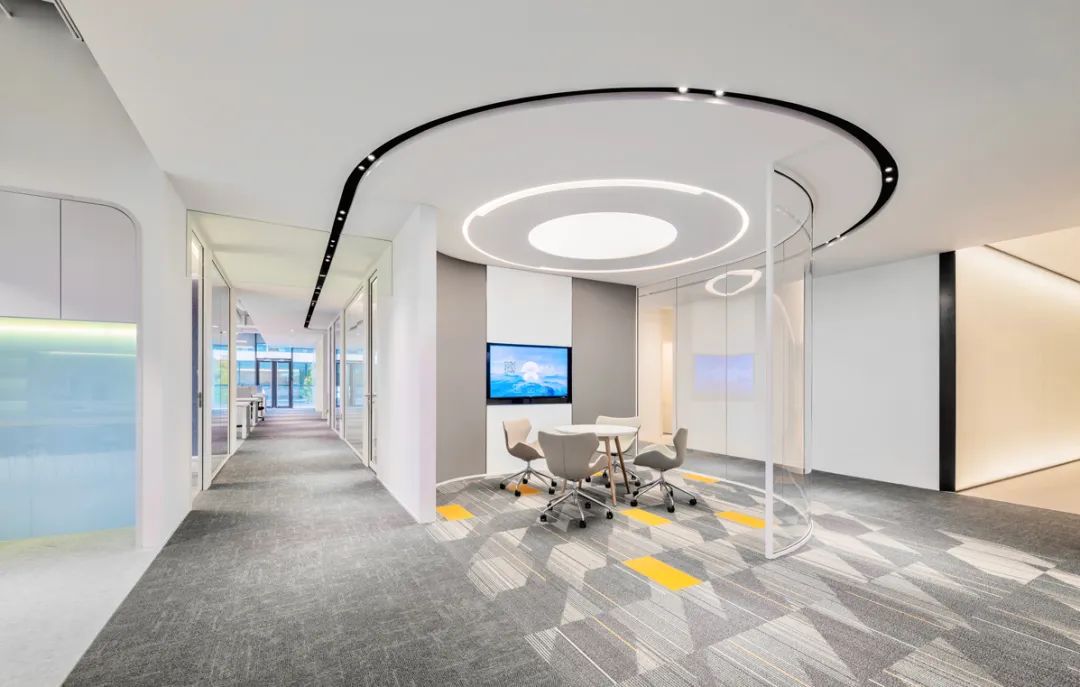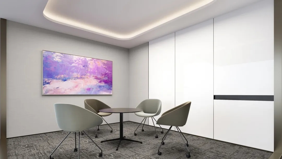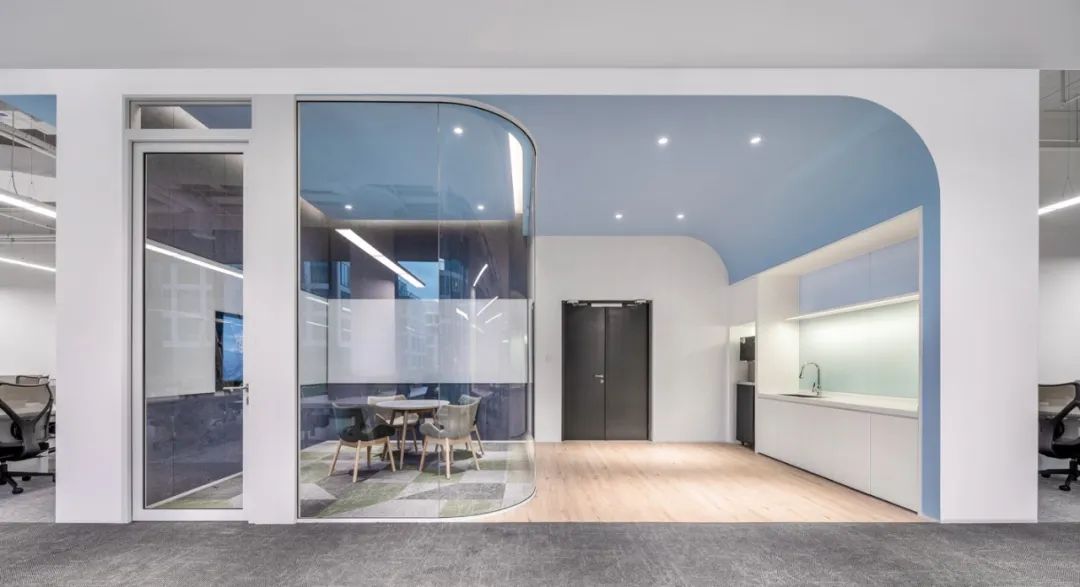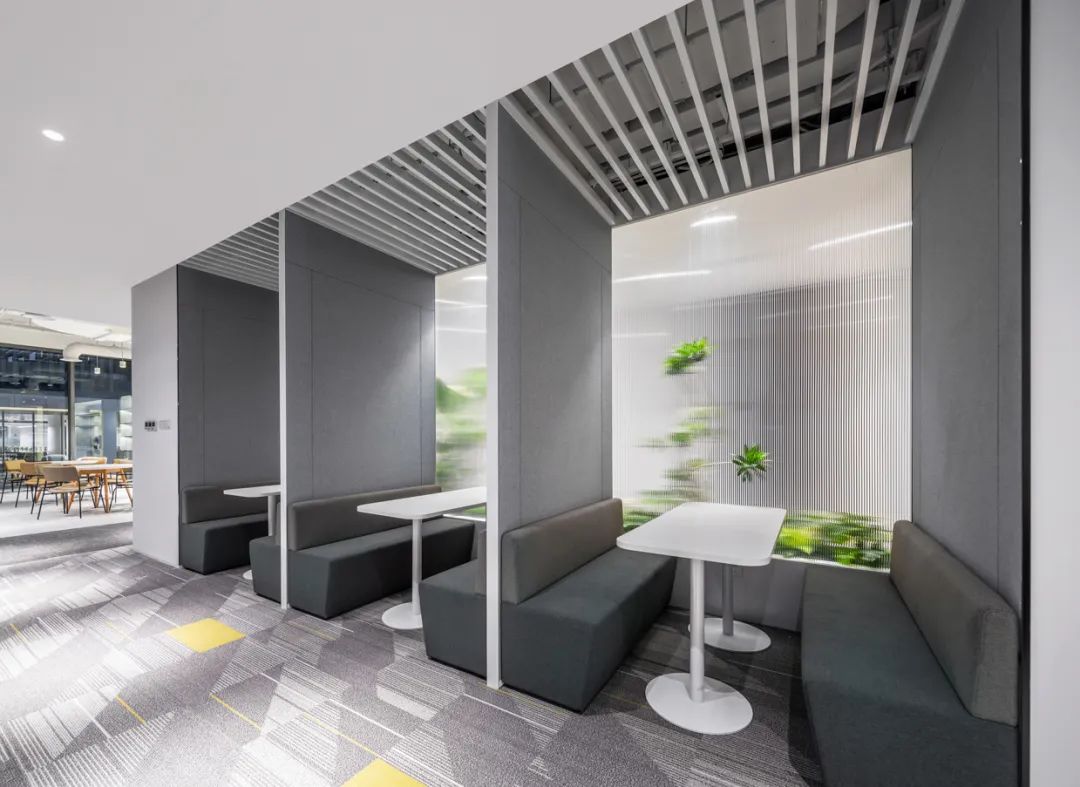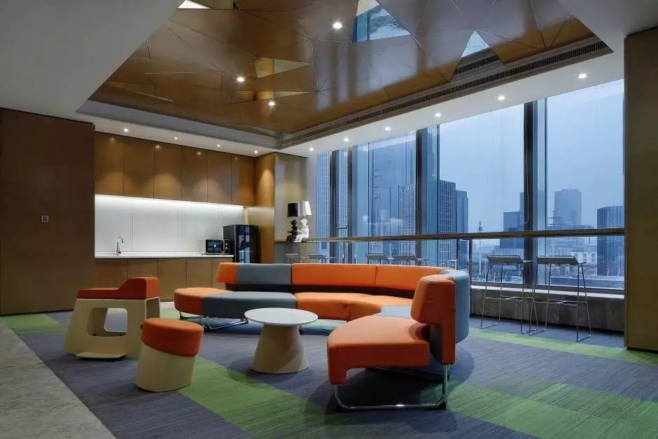 色彩在空间中的进退、明暗,感染着环境氛围,也折射着人们的心理需求:办公会议区采用低饱和度的色彩,舒缓员工情绪,凝神聚气,提高工作效率;高饱和度的色彩运用在茶歇区作为点缀,放松身心的同时,提升空间趣味。