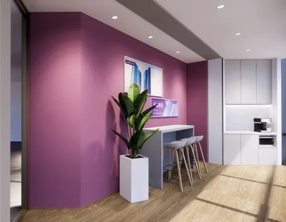 打破空间的传统定义,扩展空间交互的局限性。连接前厅,继续延展其更多元的空间功能。在主题紫色的点缀下,搭配木、水纹、波浪的海岛符号下,使这里成为自然与办公空间的过渡,给予办公使用者和客户更多体验、触动和交流互动。