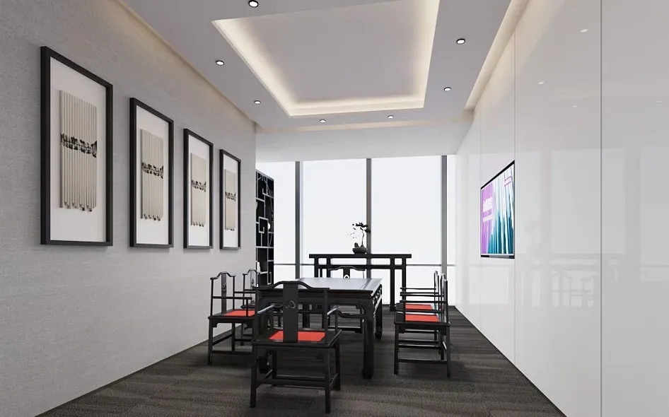 无论是中式会议室、还是常规的会议室,搭配白、灰、木等奠定简洁的基调,形成空间贯通感。在此基础上,设计师摒弃繁复的设计元素,以造型简易的灯具和商务家具组合为主,反而衬托沉稳、端庄的诗书气韵。