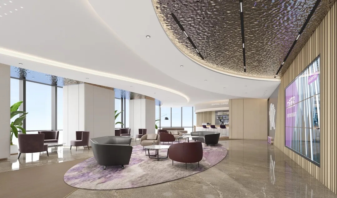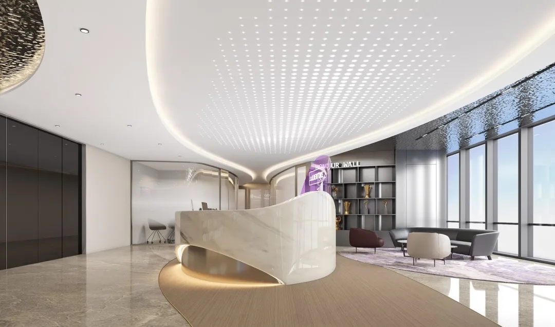 前厅似「扬帆的岛」,寓意着希望、生机与无限可能。前台造型如起伏的岛屿,承载着开放和创新的土壤,紫色的背景板又带有一丝未来感。整体以海浪无限延伸的线条呼应,天花的灯光也如晴空下尽情飞翔的海鸟,让人犹如吹拂着潇洒的海风以及和煦的阳光。