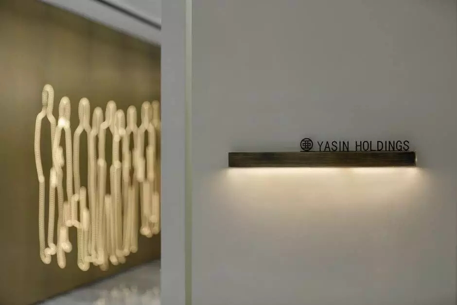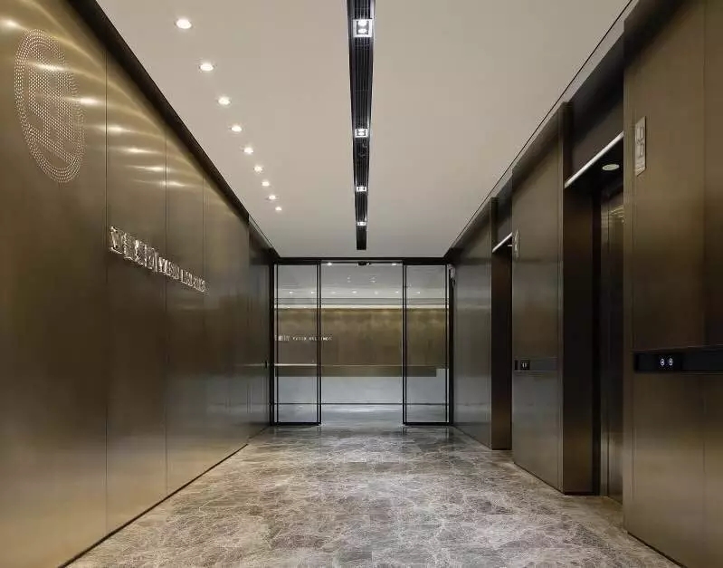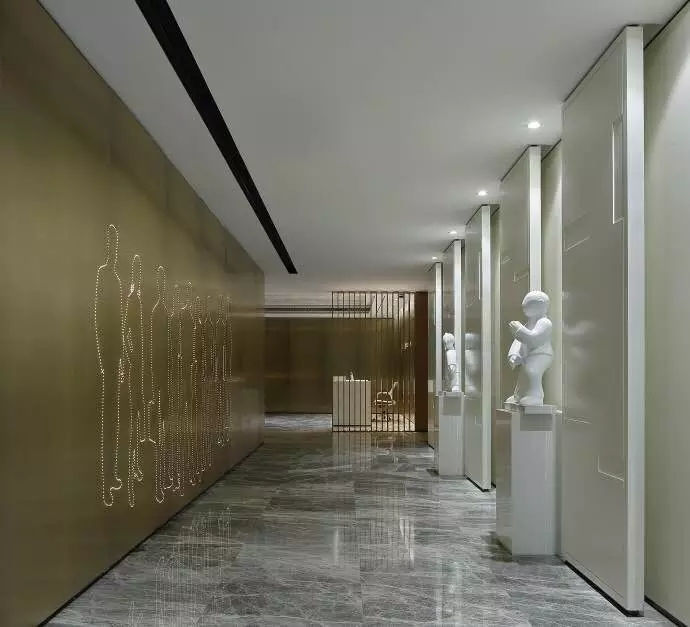 走廊部分的创意墙来源于公司员工的剪影。图案透过圆形小孔散发出的光芒汇集在一起,折射出集团合作共赢的企业文化。