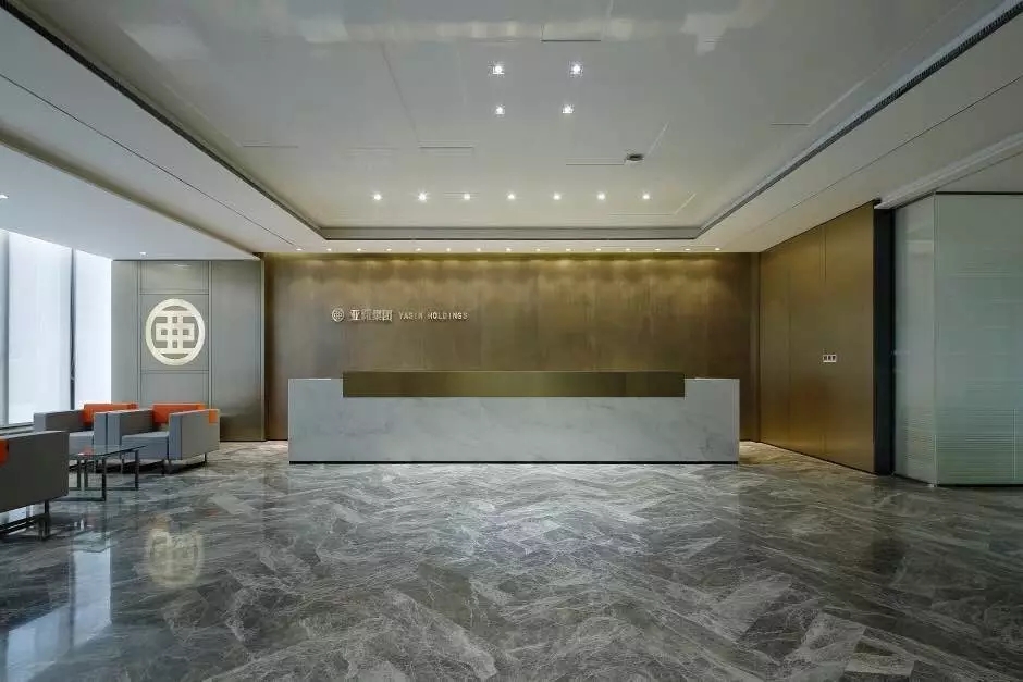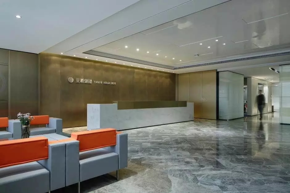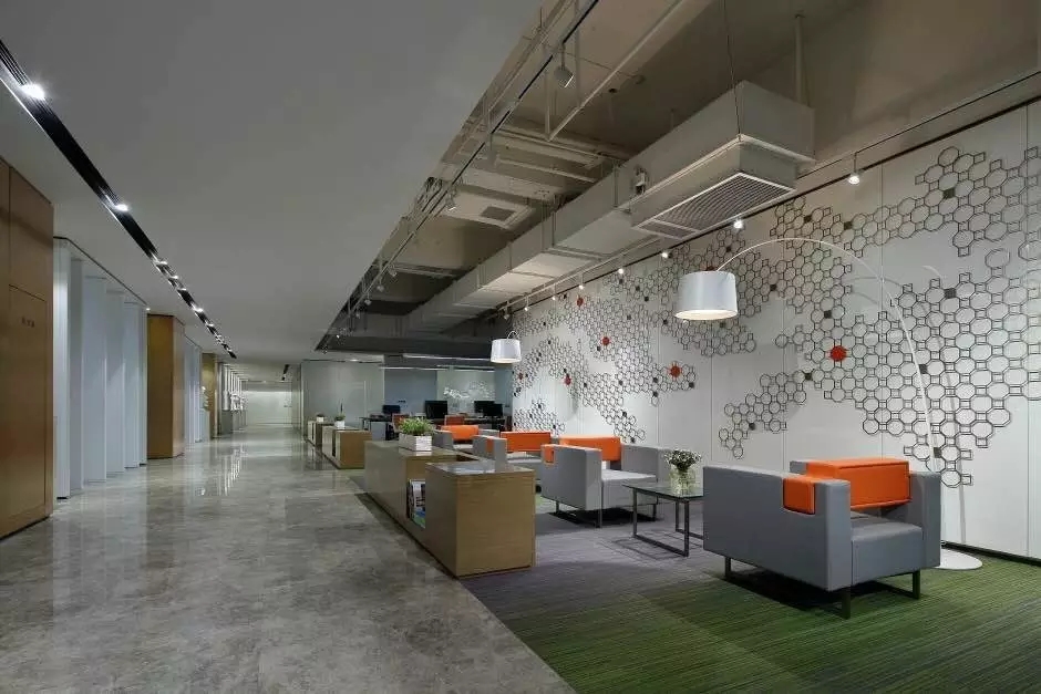 洽谈区将充满创意的简洁图形进行组合,以橙色小色块作为点缀,展示抽象化处理后的亚新集团文化墙,令访客感受到空间时尚律动的气息。