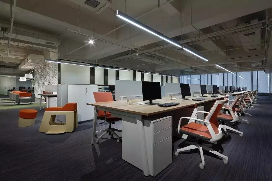 办公空间内部有两条人流主动线。一条是整个空间的核心,要求高效、舒适。另一条主动线上,则加入了更多的人文关怀元素,明快舒适的弧形沙发,高高的吧台和吧椅,构成了一个类似居家环境的减压空间。对于来访者和企业员工来说,是两种不同的体验。