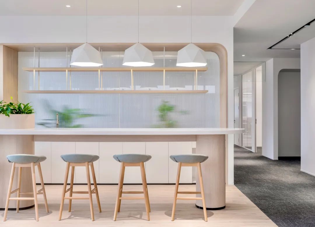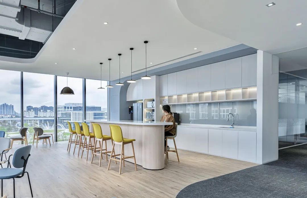 在珠海的地理和人文环境的熏染下,带给艾斯团队来自滨海之城的触动和灵感。同时作为一家以顾客需求和客户关怀为中心的设计与施工一体化服务的公司,艾斯团队将现代与自然相互融合,将空间的功能实用性、使用舒适度和现代设计感都在宽敞开放的办公区中立体地呈现,并营造出流动性的视觉效果和未来联想。
