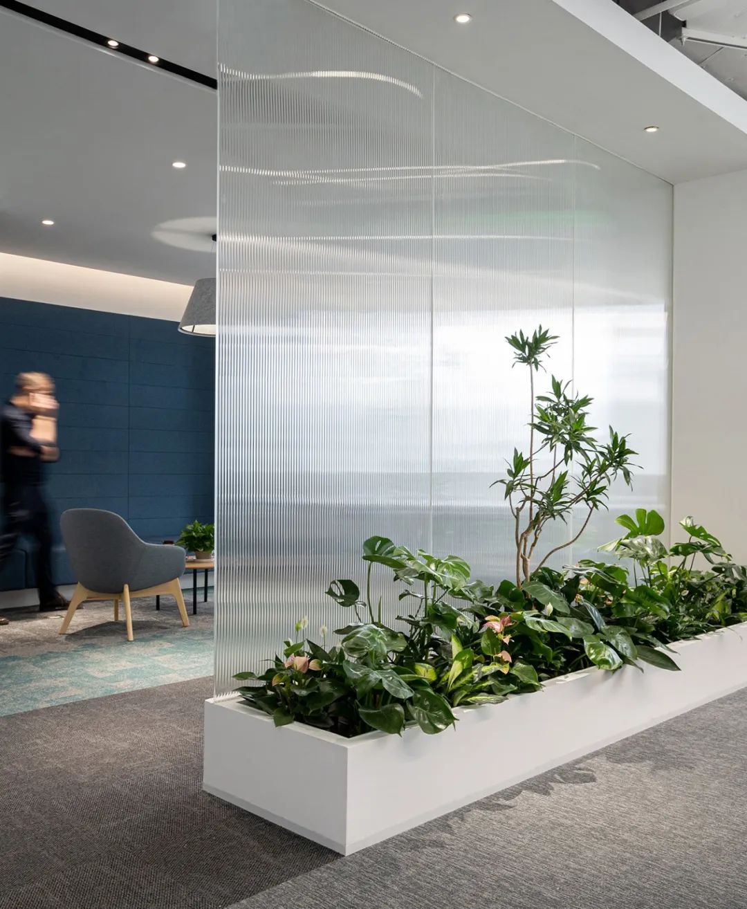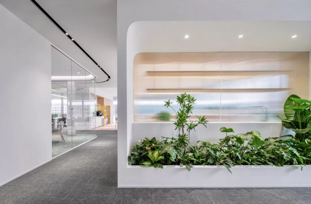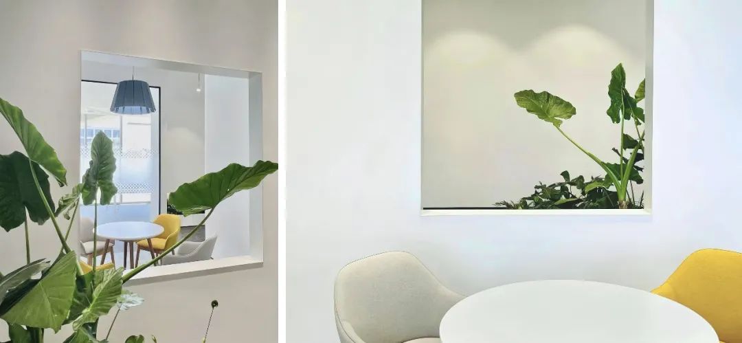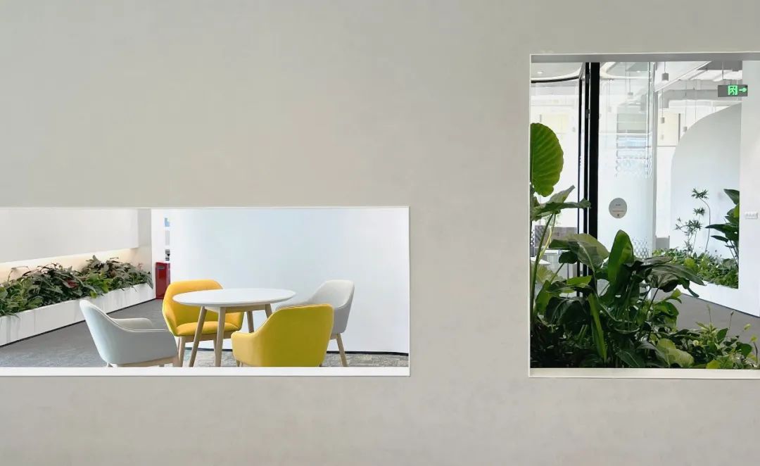 墙面大大小小的洞口将绿色引入,既是画中景,亦是景中人。而在长虹玻璃的衬托下,绿植显得朦胧而柔美,引领员工在生机盎然的氛围中迸发创意灵感,传递着“Blue Sky Coming”的品牌理念。