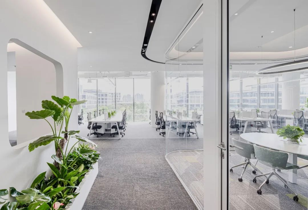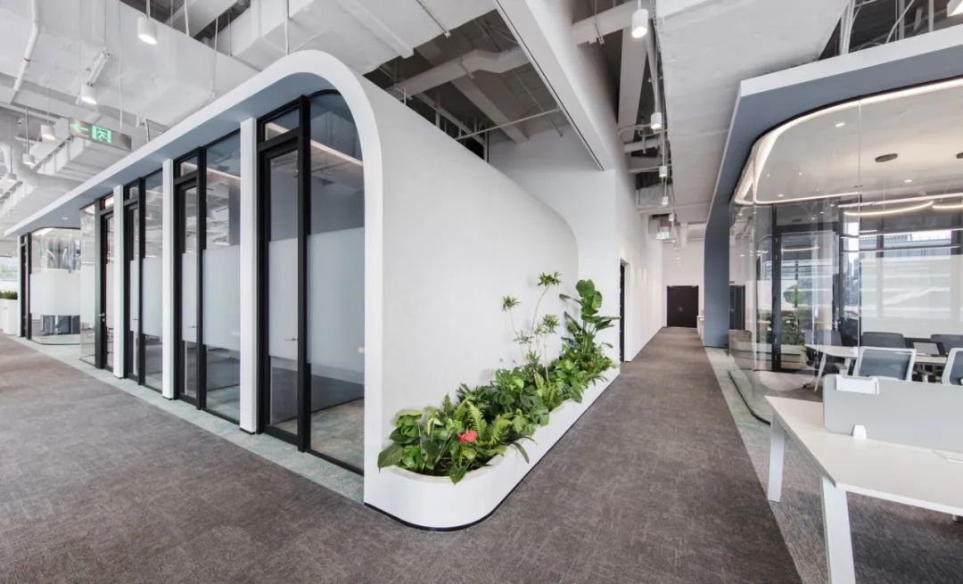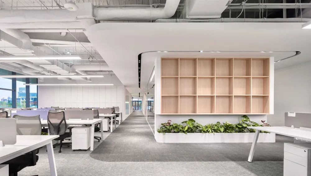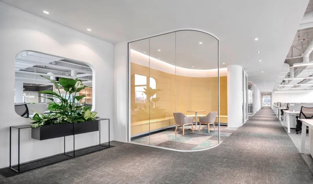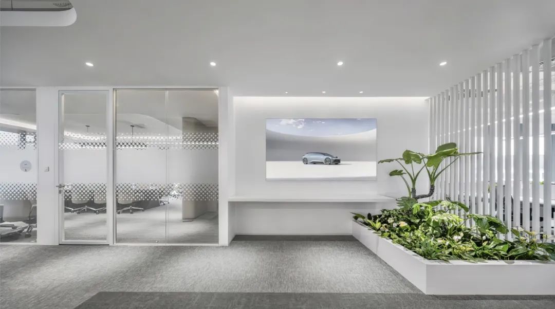 墙面大大小小的洞口将绿色引入,既是画中景,亦是景中人。而在长虹玻璃的衬托下,绿植显得朦胧而柔美,引领员工在生机盎然的氛围中迸发创意灵感,传递着“Blue Sky Coming”的品牌理念。