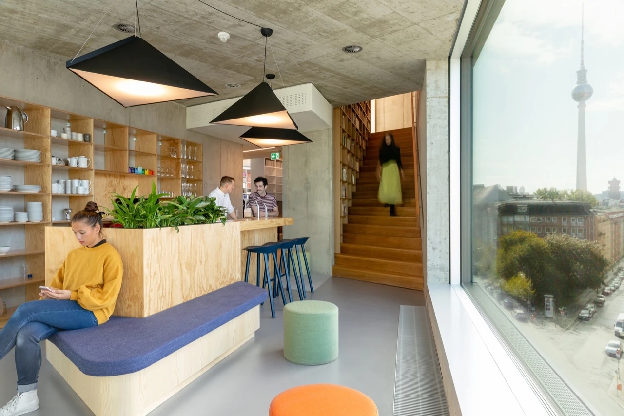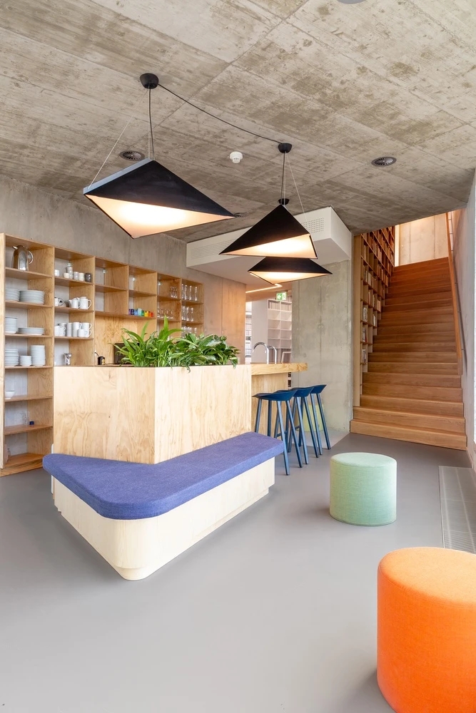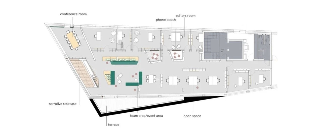 所有其他工作区域都位于开放空间,在建筑的角侧设有小厨房和会议室。这些空间以宜人的氛围为特色,透过大型全景窗户可欣赏到繁华的Linien-straße和Linien- straße。其中一间会议室配有带轮子的家具,使用者可根据需要重新移动和利用空间,还有可根据需要打开或关闭的定制白板和隐藏的投影屏幕。会议室和小厨房还有楼层之间通过所谓的"叙事楼梯"从内部相互连接,这个楼梯从一楼的斜角通向六楼。