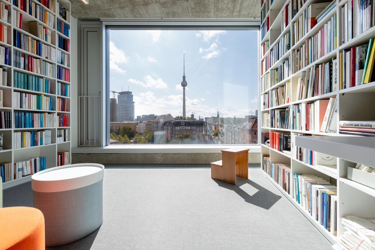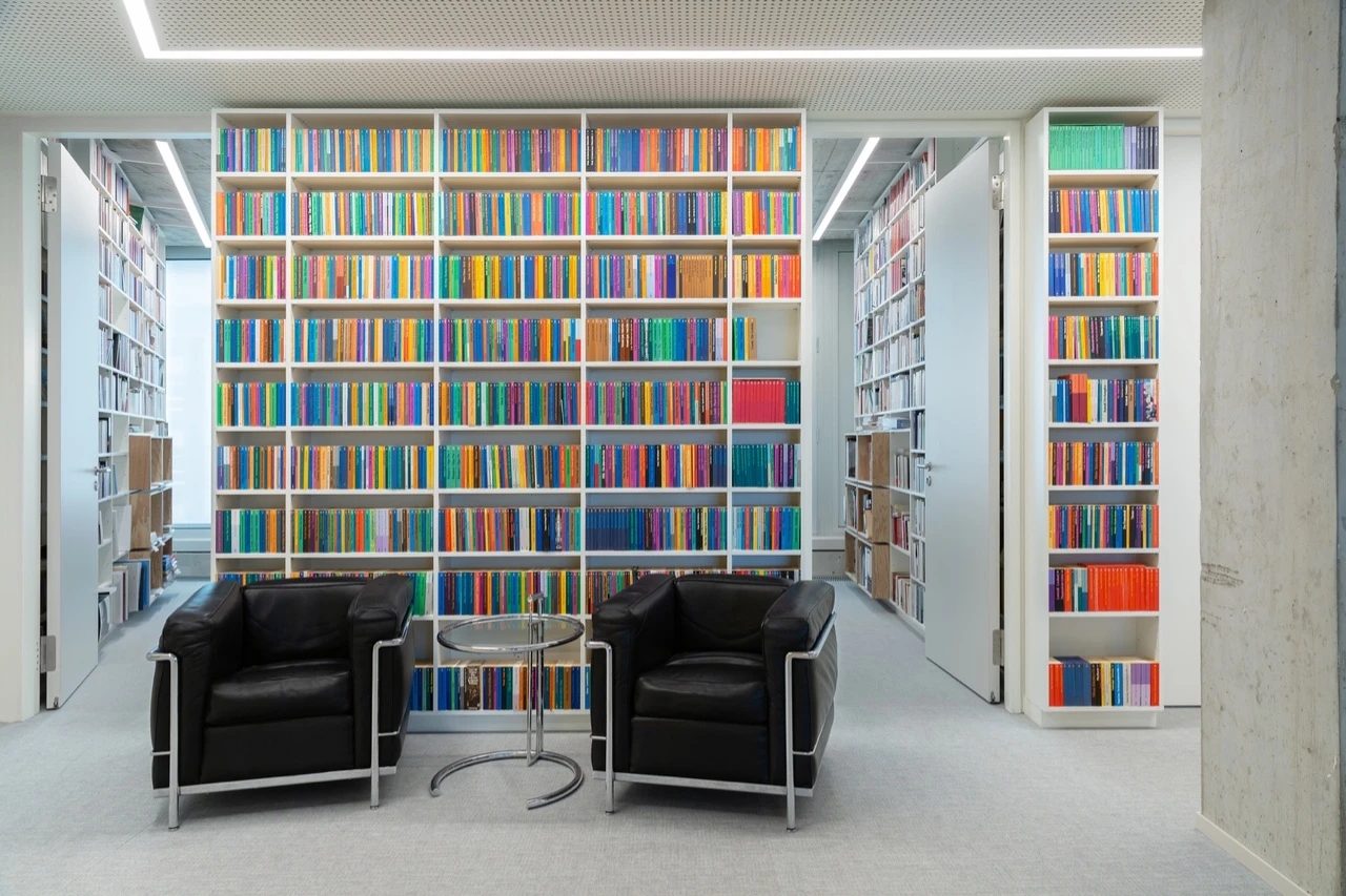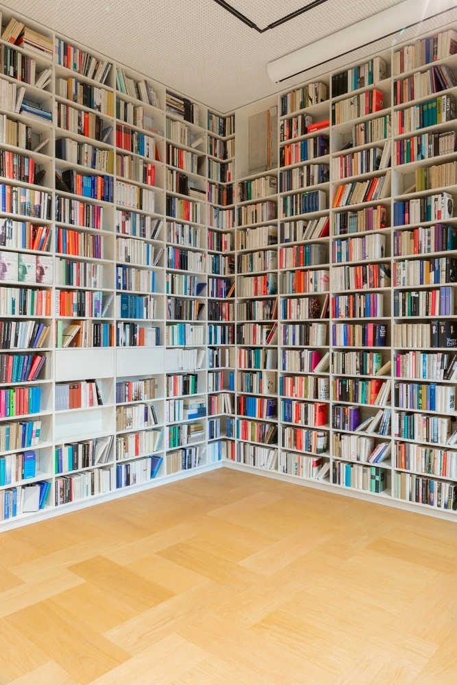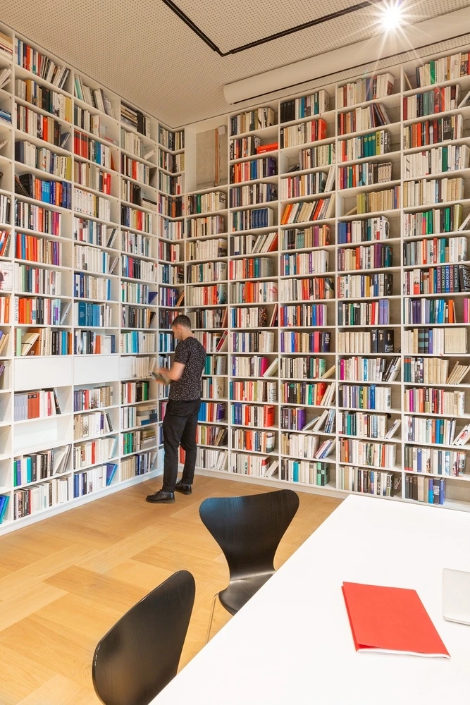 楼梯之所以得名,是因为它令人印象深刻的书架。书架设在陡峭的楼梯旁边,就像一条戏剧性的叙事线。橡木搁板对应了楼梯台阶的材料相互呼应。