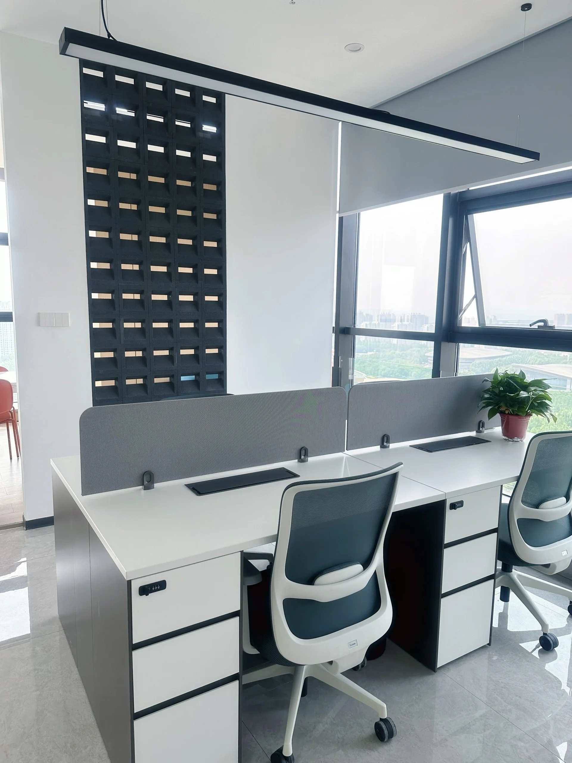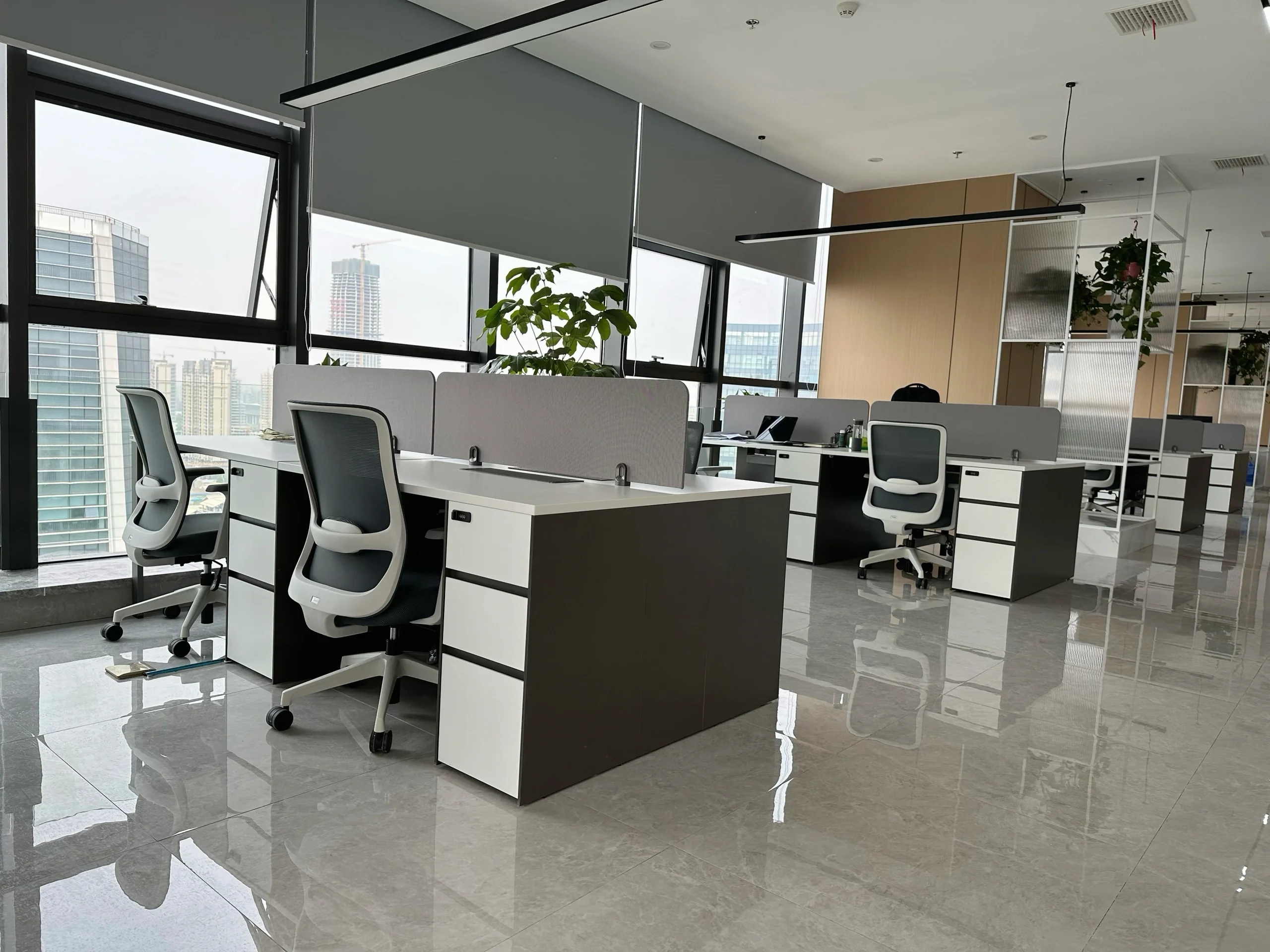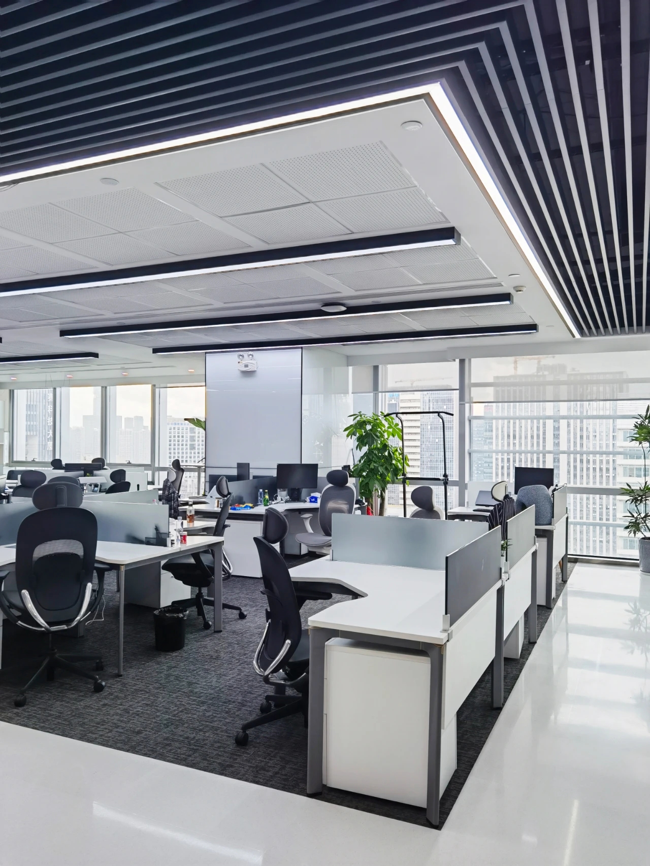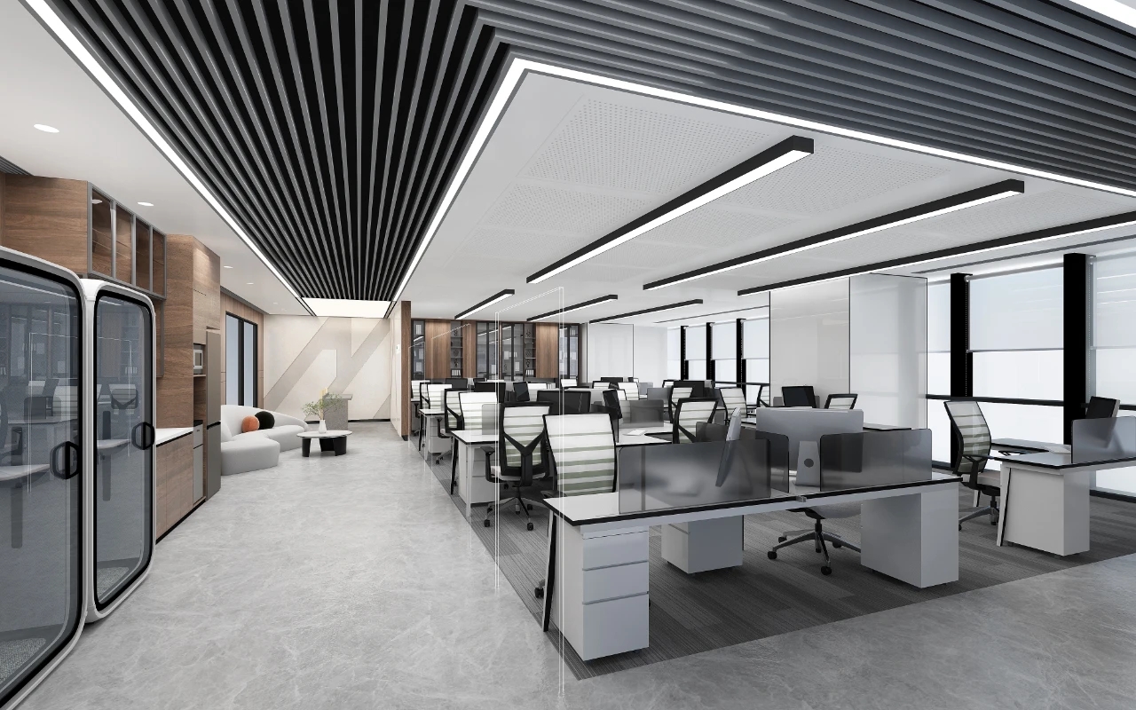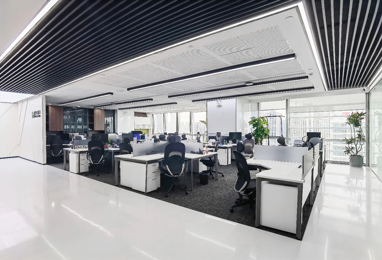 开敞办公区简洁明快、整洁有序的办公场所‖ 功能是空间设计的核心,没有解决最本质的功能和使用问题,所有的造型和美化便失去了灵魂。因而,本案的设计主要从两个方面入手,一个是对空间功能的重新规划,另一个是从企业特性出发,实现人与空间的对话,实现从空间到人物情感的建立。开敞办公区的采光非常充足,窗外就是高楼林立的中央商务区,对比强烈的黑白两色让空间增加了严谨有序的工作氛围。