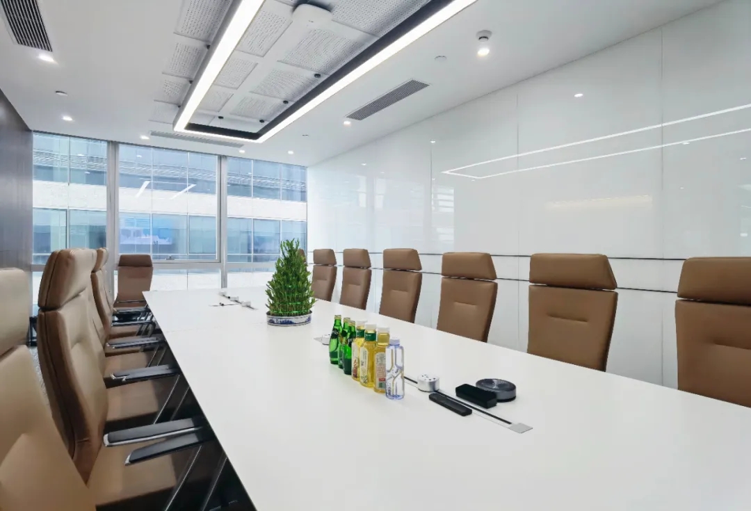 除了能容纳26人同时使用的大会议室之外,空间内还设置了两个小会议室和一个洽谈室,以满足同时接待不同客户群组的需求。开敞办公区和会议室之间,用智能雾化玻璃进行分隔,既可以满足私密空间的需要,又可以保持空间的通透性,同时玻璃材质的反光特性,对空间起到了很好的延展作用。