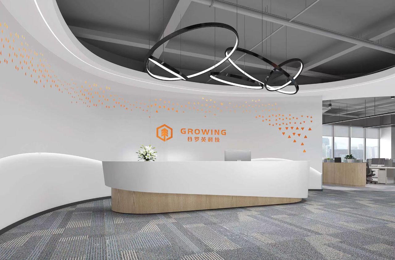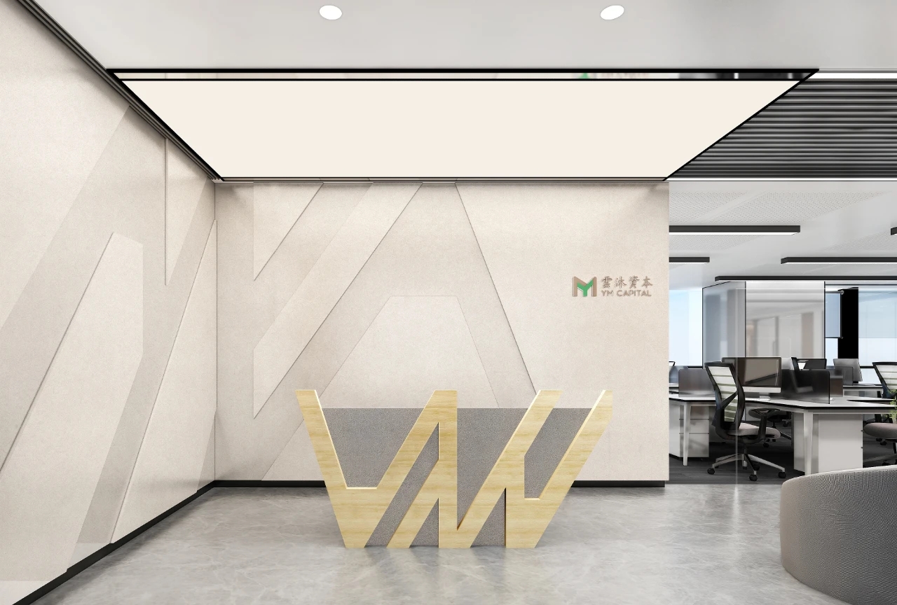 一层塔楼大厅以浅灰色为主体色调,主背景墙的六边形图案来源于企业的头部产品:创新材料石墨烯分子的元素提炼,通过排列组合巧妙地融为一体,体量不同的几何符号共同作用组成了表面饰层,带来神秘的视觉互动,白色灯光透过铝板的孔洞穿透出来,将品牌logo以强烈的象征主义转刻出现,从细微处现显示出城市的进步与品牌的进化。