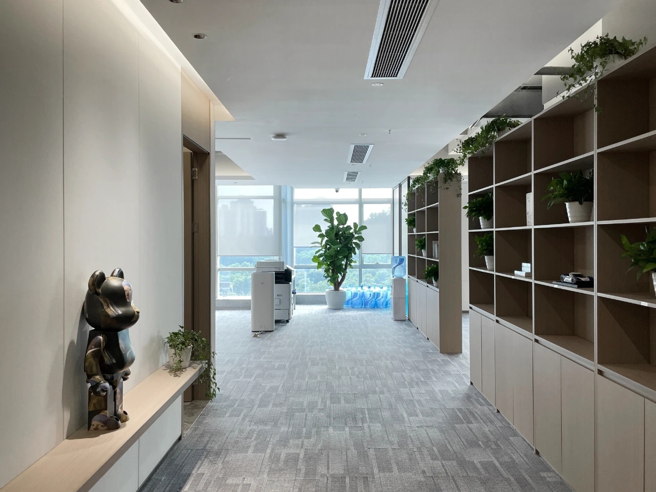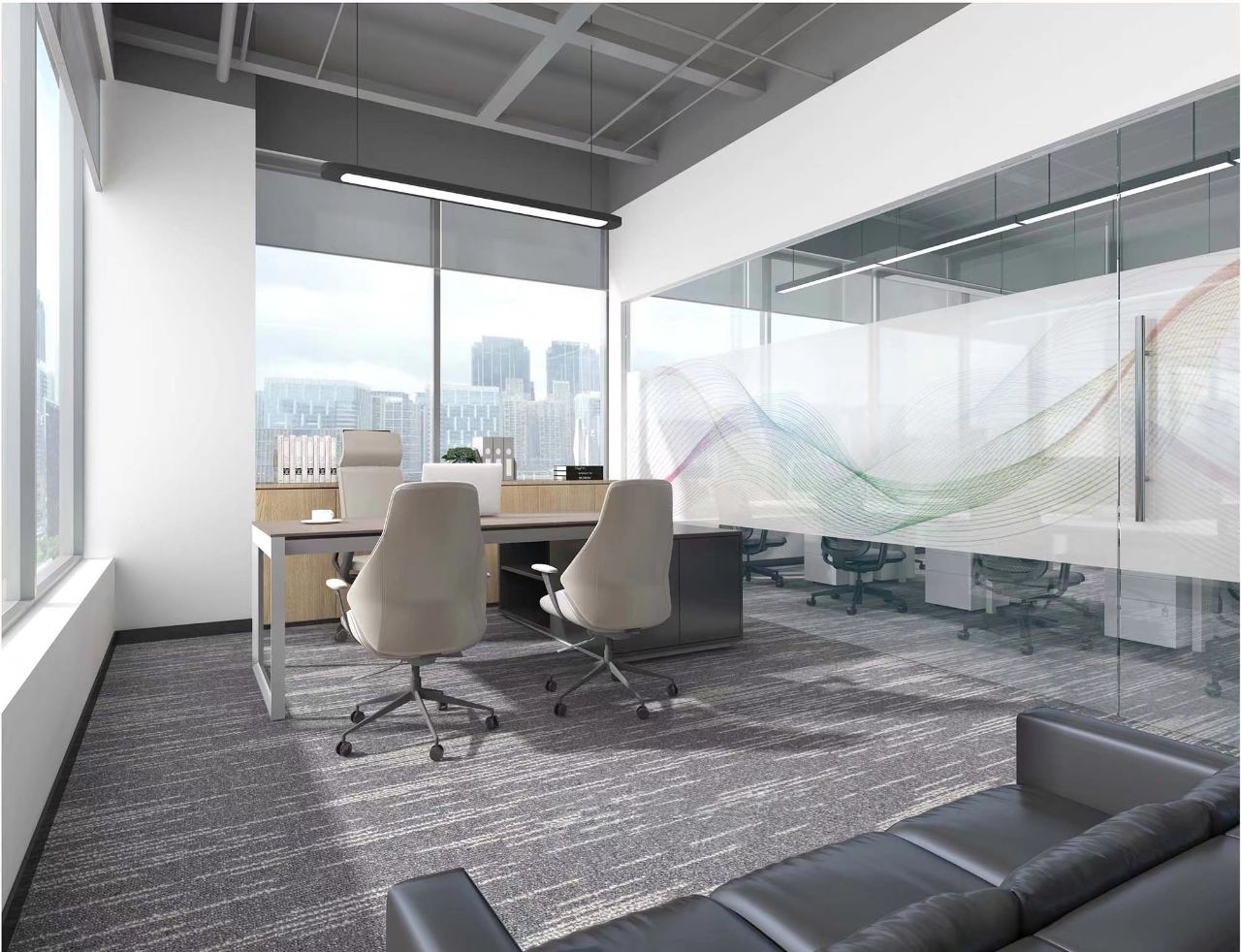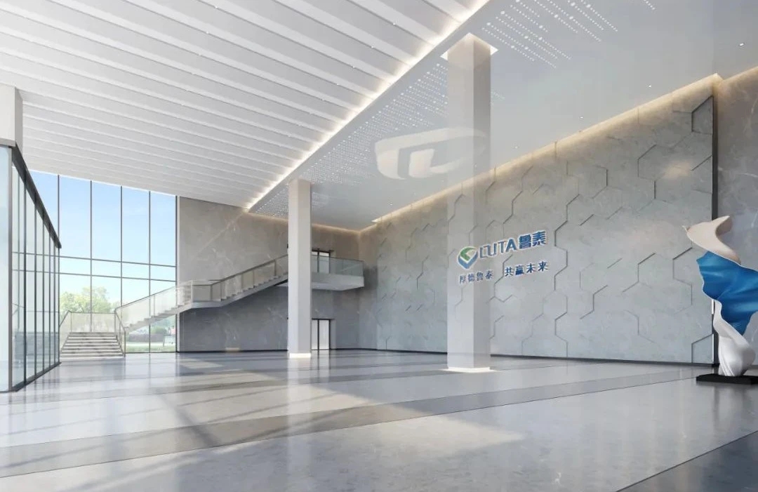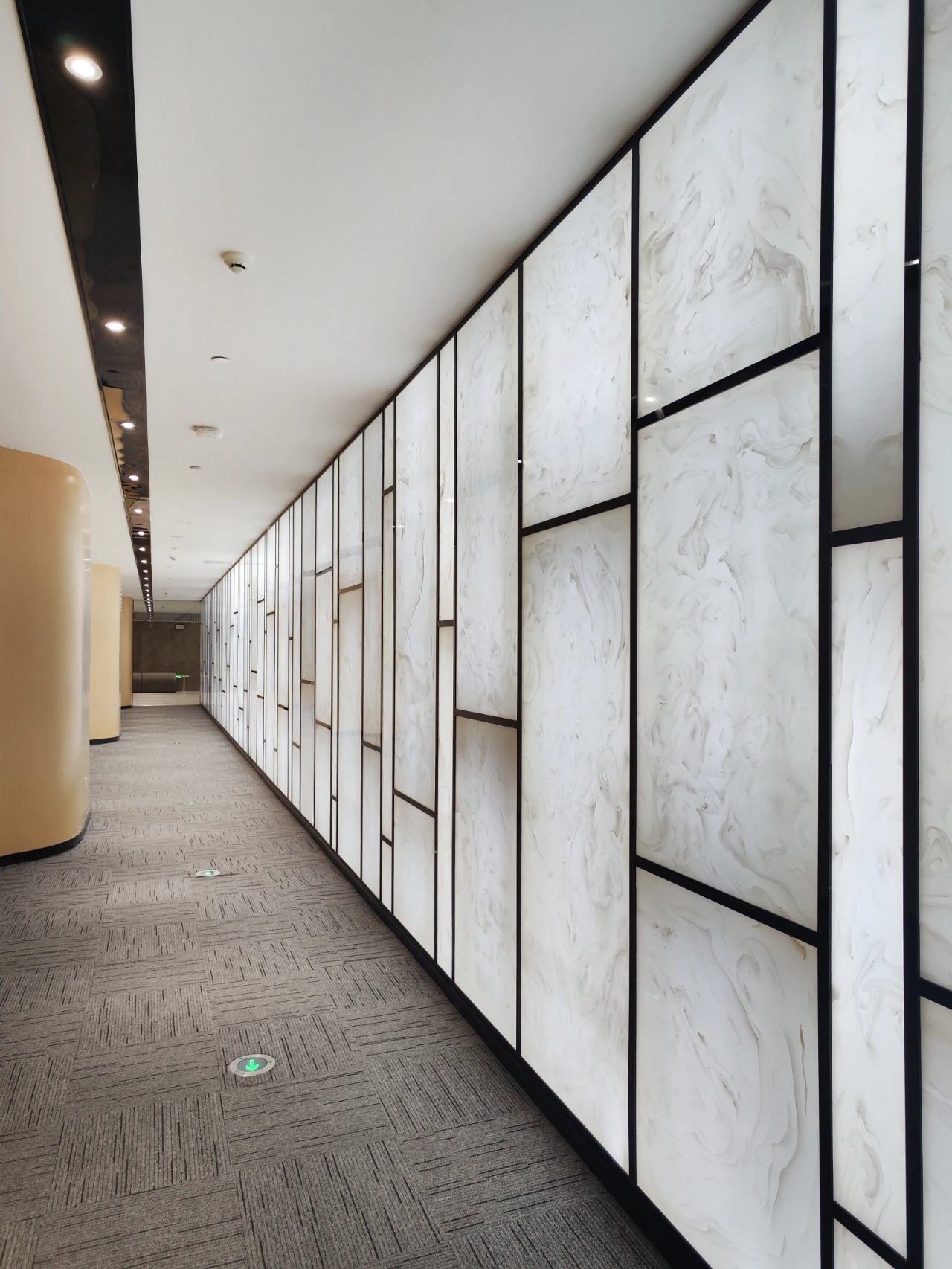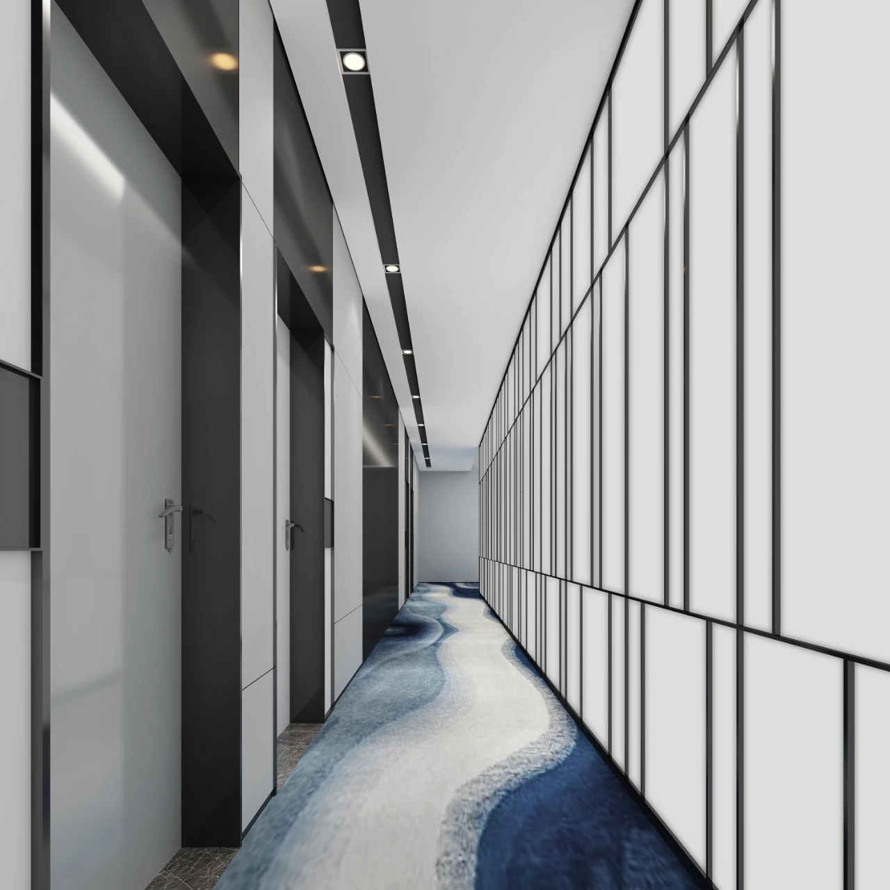 走廊作为日常的交通空间,同时兼顾贵宾接待。此空间主要打造一个现代简洁,同时兼顾文化氛围的空间。地面提取了大运河的形态与企业Vi的蓝色,作为地毯的主要纹理形态和色调,兼顾韵律美感,也蕴意着企业发展就像大河一样,川流不息,兼容并蓄。