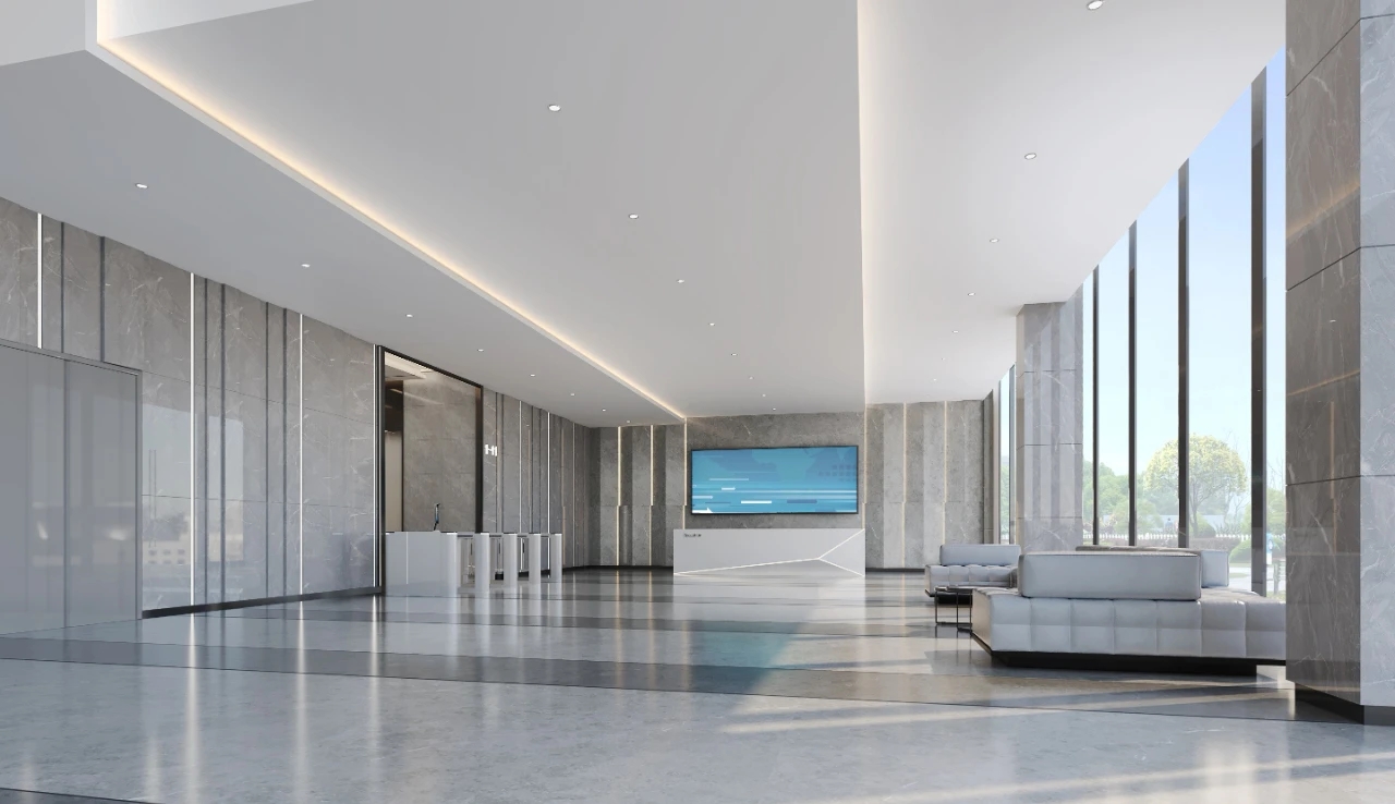 电梯厅作为塔楼主大厅的副厅,以科研办公人员日常使用为主,整体空间以浅灰色石材为背景主材,通过不同层次和肌理的组合变化,营造出科研中心严谨、高效、精致、内敛的底蕴。