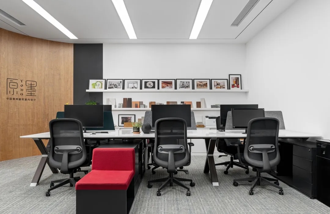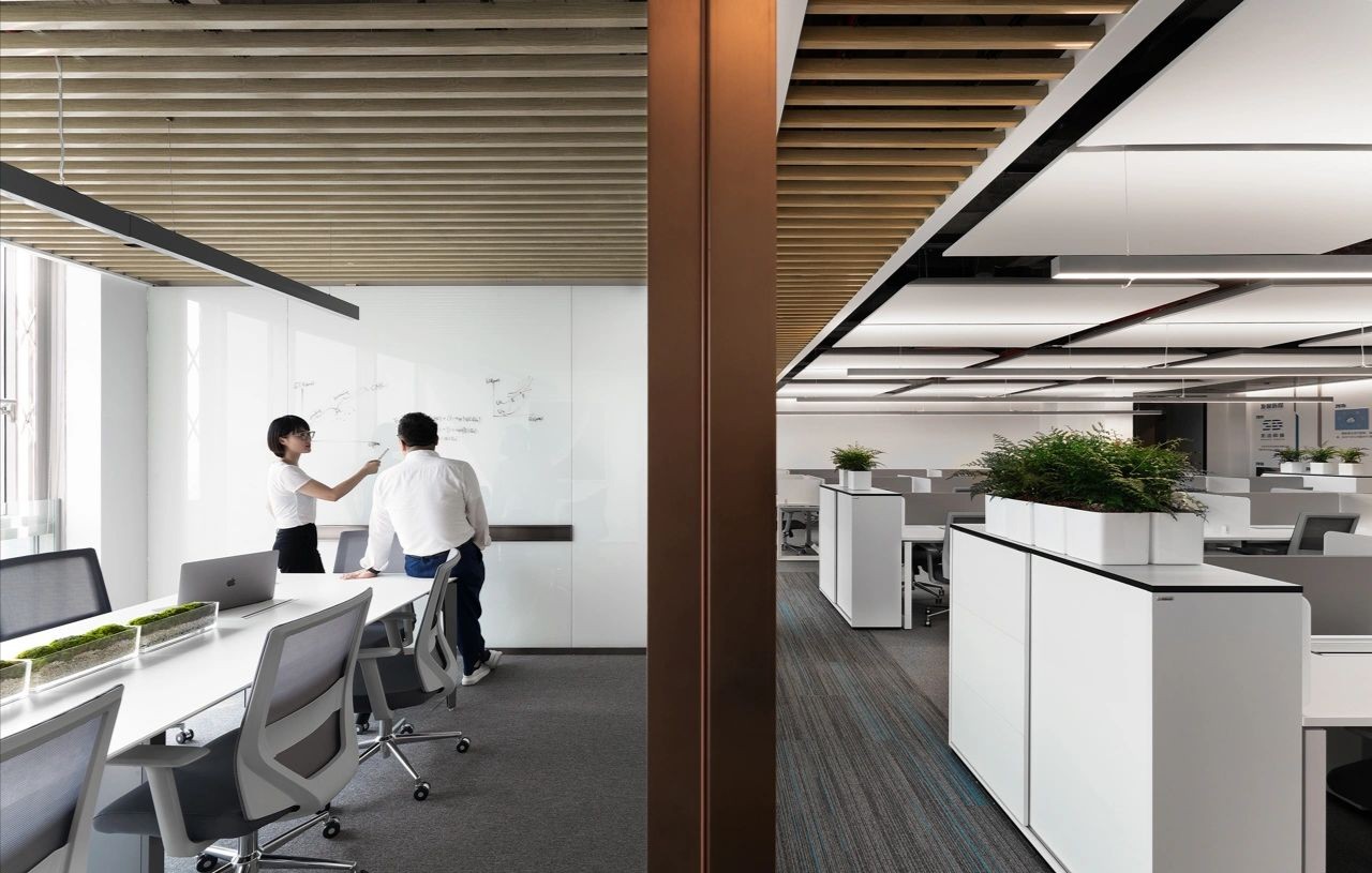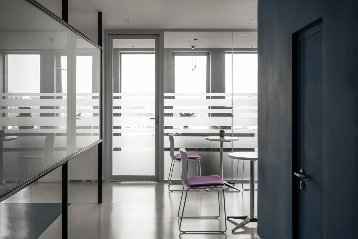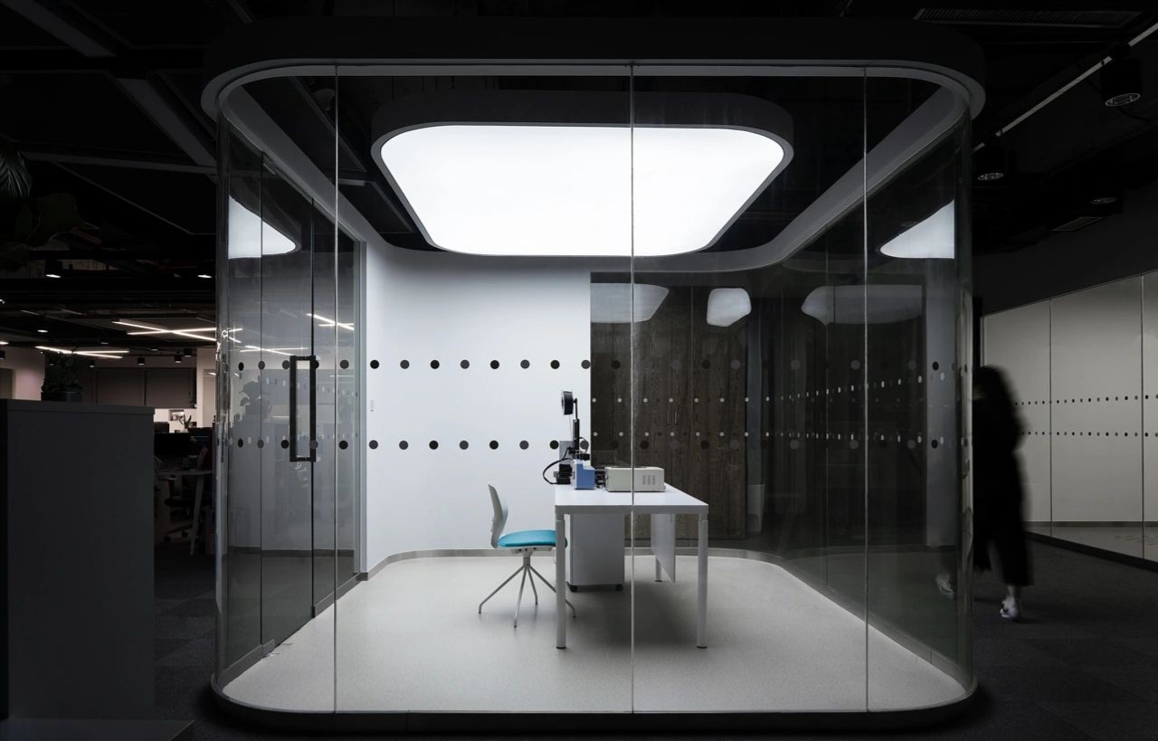 兼具严谨与创新气质的空间中小型团队、精英化、兼具创新与严谨的精神,打造这样的办公氛围需要把握设计感的度。我们顺应了空间所在建筑的方正形态,通过墙和顶水平排列、粗细变换的直线条来构建严谨气质,用大面积的白色材料和不锈钢本色的隔断框架带来实验室氛围,用高饱和度的明快配色来表达创新精神。