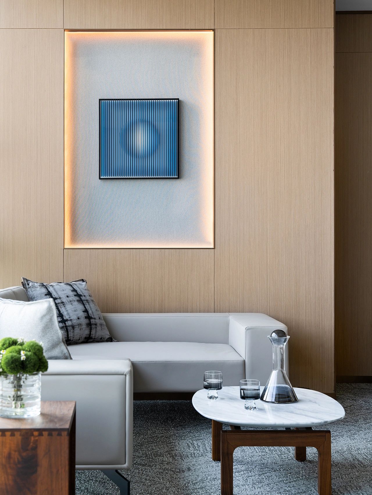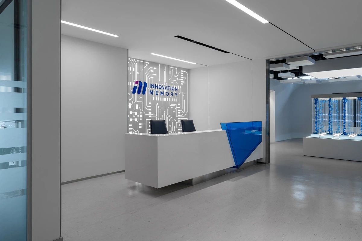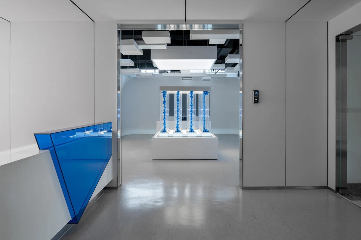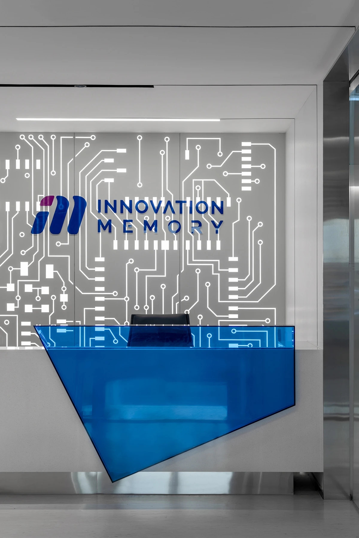 品牌文化具象呈现,设计师将Innovation Memory的logo配色科技蓝和清华紫遵循9:1的比例作为空间装饰配色,用色彩传达公司文化。