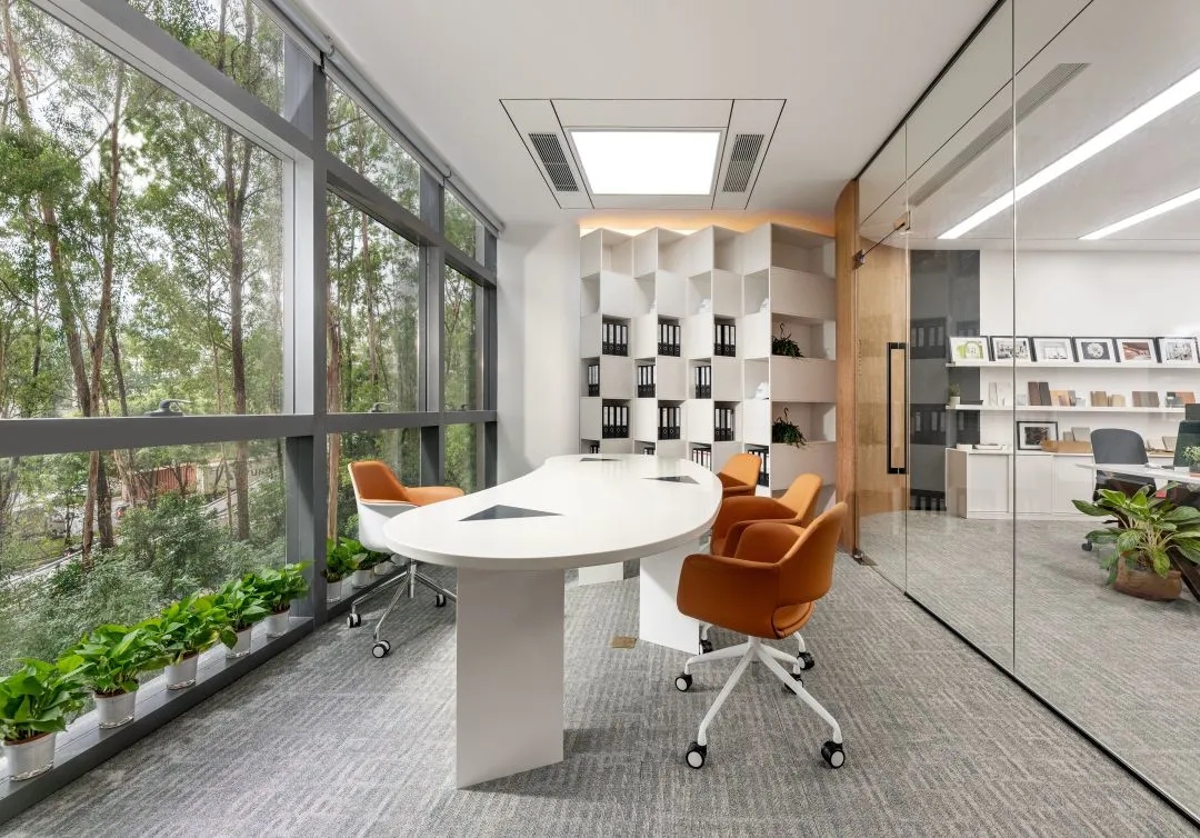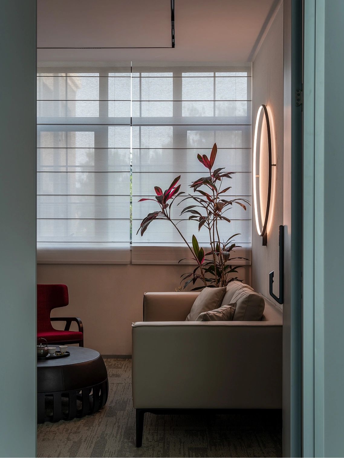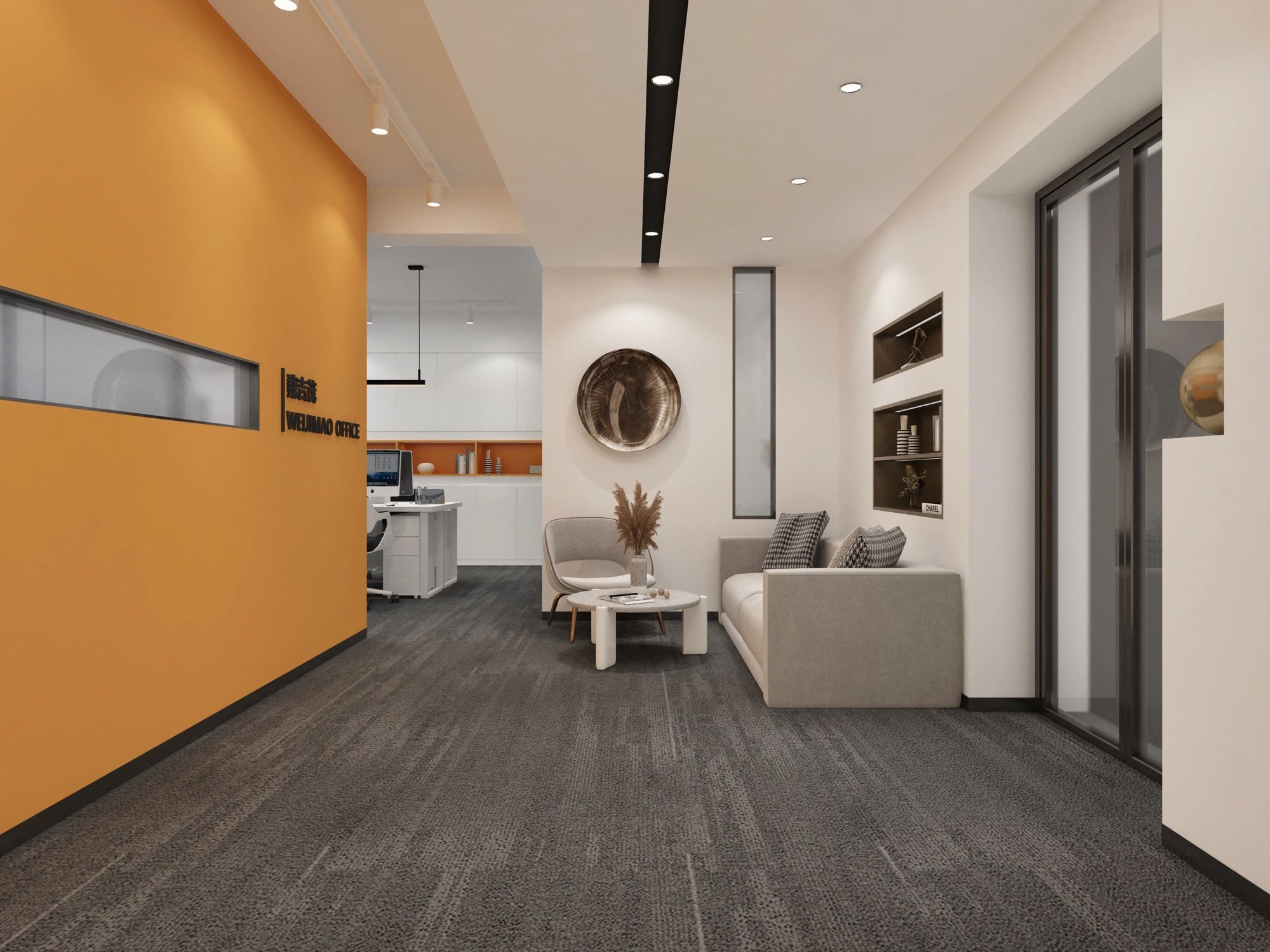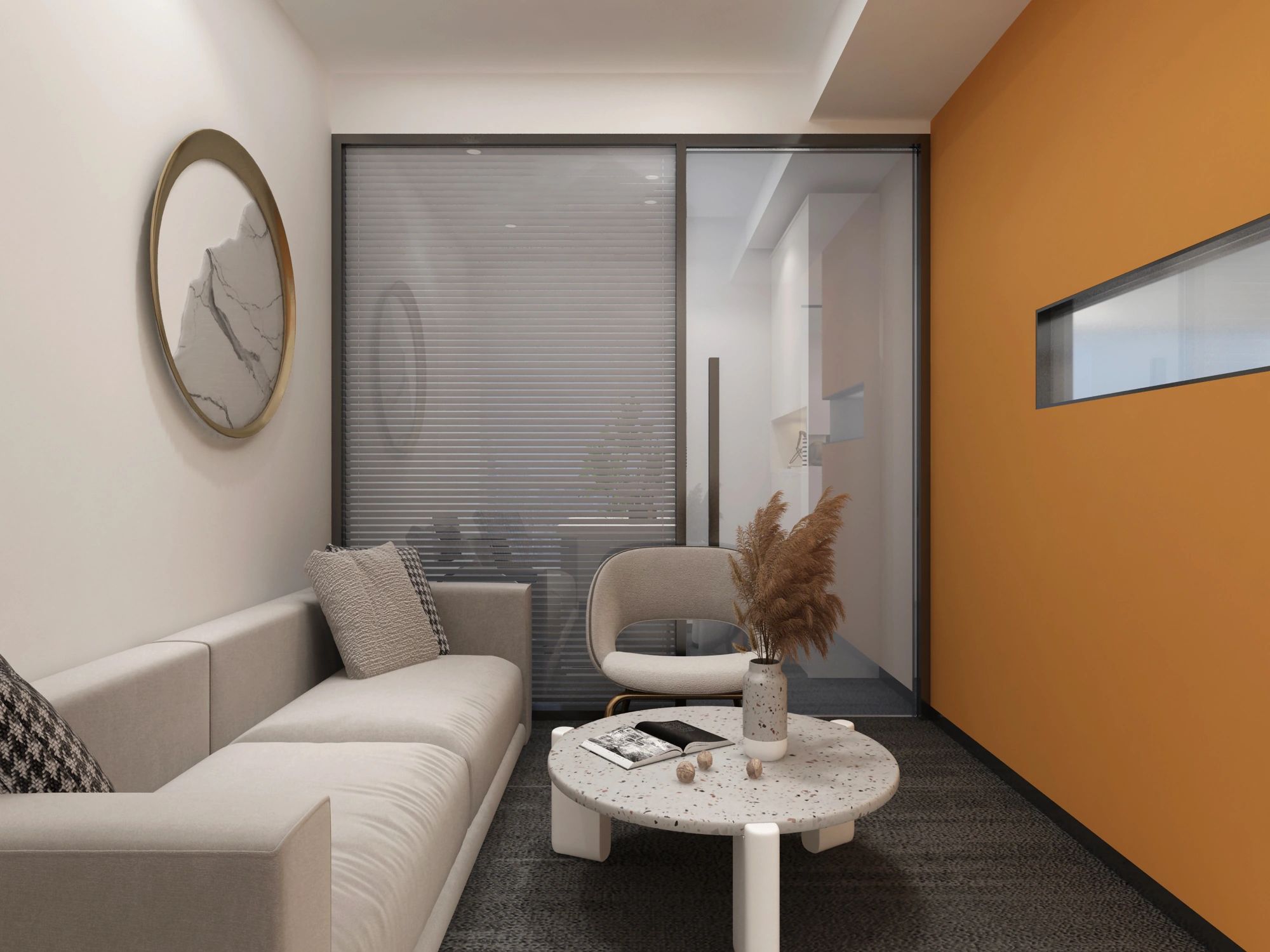 白色作为主色调,为空间奠定了基调;橙色的点缀使得空间更加生动、有趣;而绿色植物的引入则让空间更加自然、舒适。这种色彩构成不仅符合现代审美趋势,也充分体现了品牌形象和文化内涵。